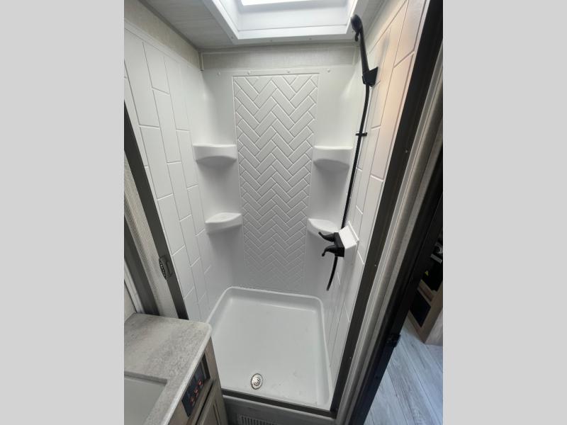 With any Surveyor Legend travel trailer by Forest River you will enjoy quality craftsmanship, convenient amenities, and at-home comforts. The Azdel composite panels provide a longer-lasting trailer, and the power tongue jack will get you back on the road in no-time. Each model includes the Surveyor Legend Package that comes standard with pleated night shades, an automotive style tinted front windshield, a multi-zone Bluetooth stereo, and more. You'll enjoy the one-touch electric awning with LED lights outdoors, plus rooftop solar prep and rear camera prep to make parking easier than ever. The inside will have you feeling right at home with Surf(x) seamless countertops, Congoleum designer carefree linoleum, residential faucets in the bath and kitchen, plus many more essentials you won't want to camp without.
