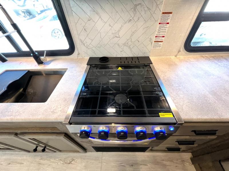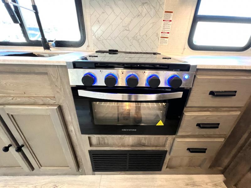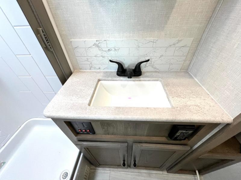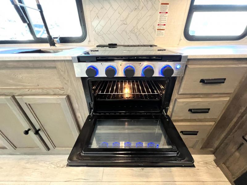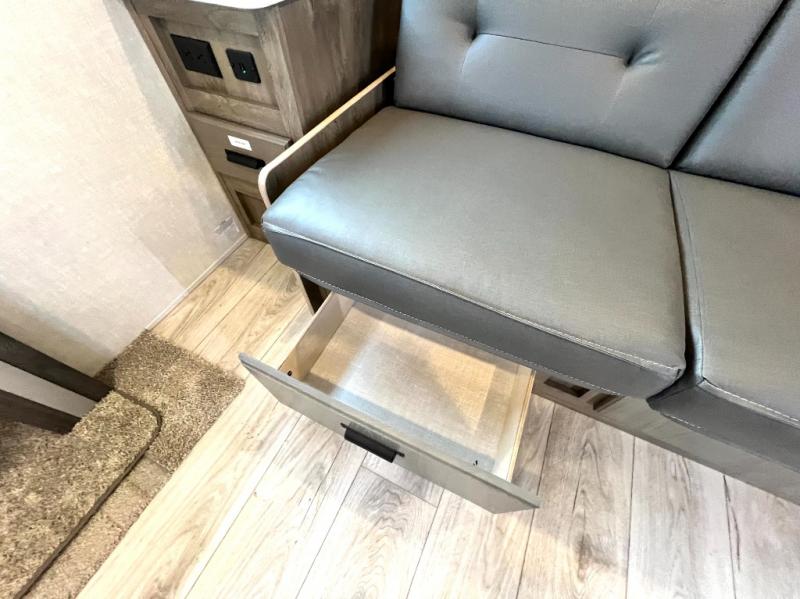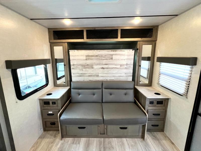 Head to your local state park for fun weekends in this cute couple's trailer. You can convert the sofa to a queen-size Murphy bed each night, and if you have guests they can sleep on the booth dinette. The chef of your group will have their choice to cook indoors on the three burner cooktop, or outdoors on the gas griddle. There is also an outdoor sink, refrigerator, and shelf to store spices. Each day you can clean up in the full bath that includes a shower skylight, a 12V power exhaust fan, and a linen closet for clean towels. This model even includes decorative wall art to make you feel right at home!