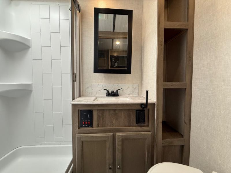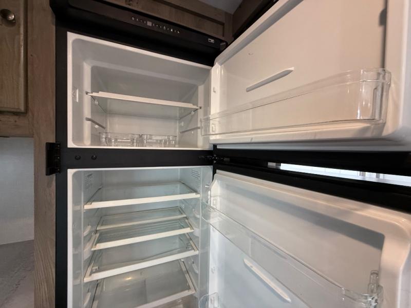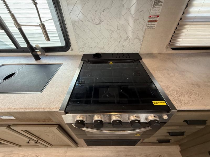 Head to your local state park for fun weekends in this cute couple's trailer. You can convert the sofa to a queen-size Murphy bed each night, and if you have guests they can sleep on the booth dinette. The chef of your group will have their choice to cook indoors on the three burner cooktop, or outdoors on the gas griddle. There is also an outdoor sink, refrigerator, and shelf to store spices. Each day you can clean up in the full bath that includes a shower skylight, a 12V power exhaust fan, and a linen closet for clean towels. This model even includes decorative wall art to make you feel right at home!