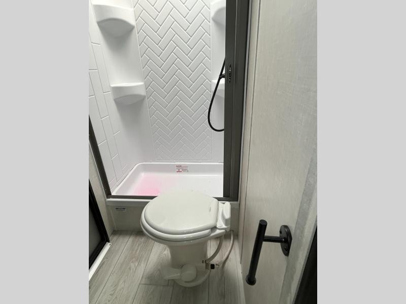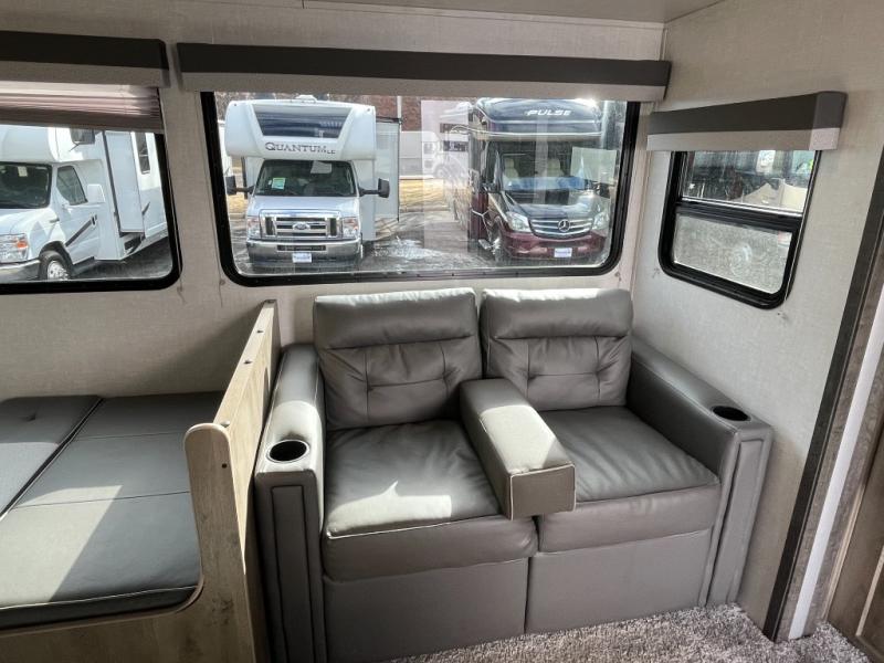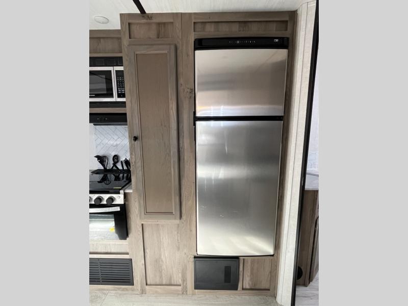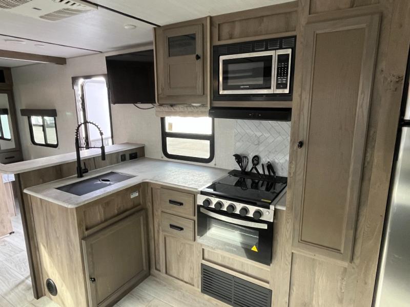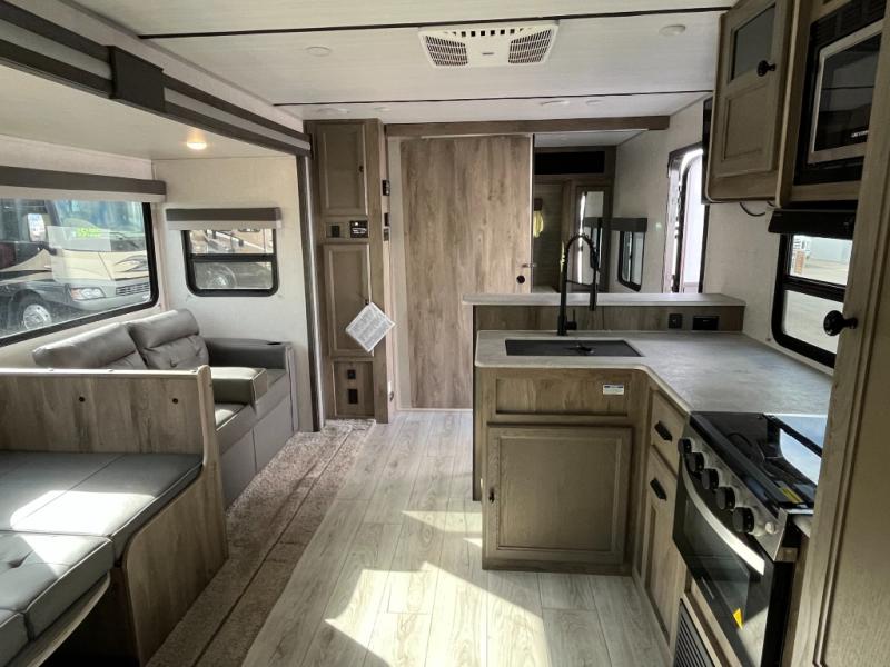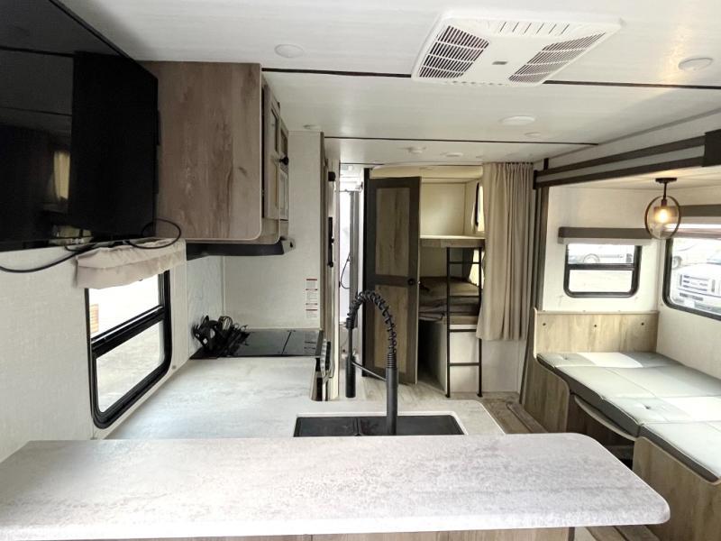 This dual entry travel trailer is the ultimate getaway for your weekend trips to the lake. You can easily bring along the mountain bikes with the under-bunk storage, and the rear storage door will make it easy to get them out when you're ready to ride. Within the large slide out you'll find a booth dinette and tri-fold sofa for seating and sleeping space, plus there is a breakfast bar with stools the little ones are sure to love. Check out the beautiful barn doors that lead to the front bedroom where you'll find a queen-size bed and dual wardrobes. Don't let this travel trailer slip away!
