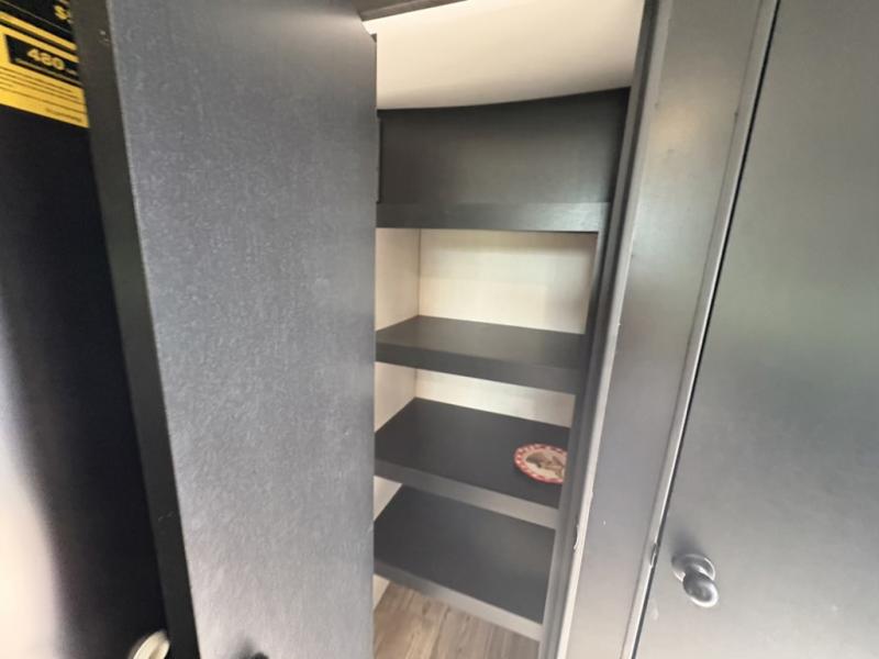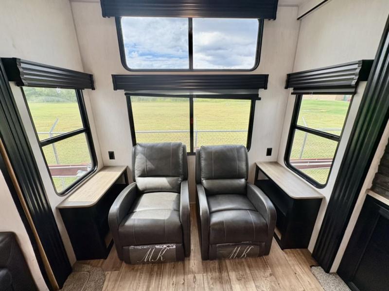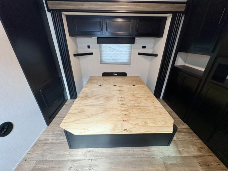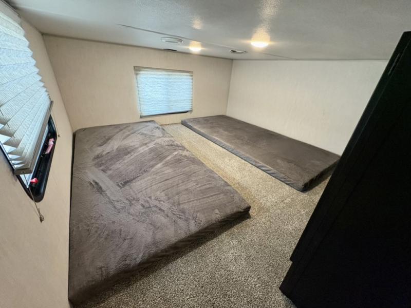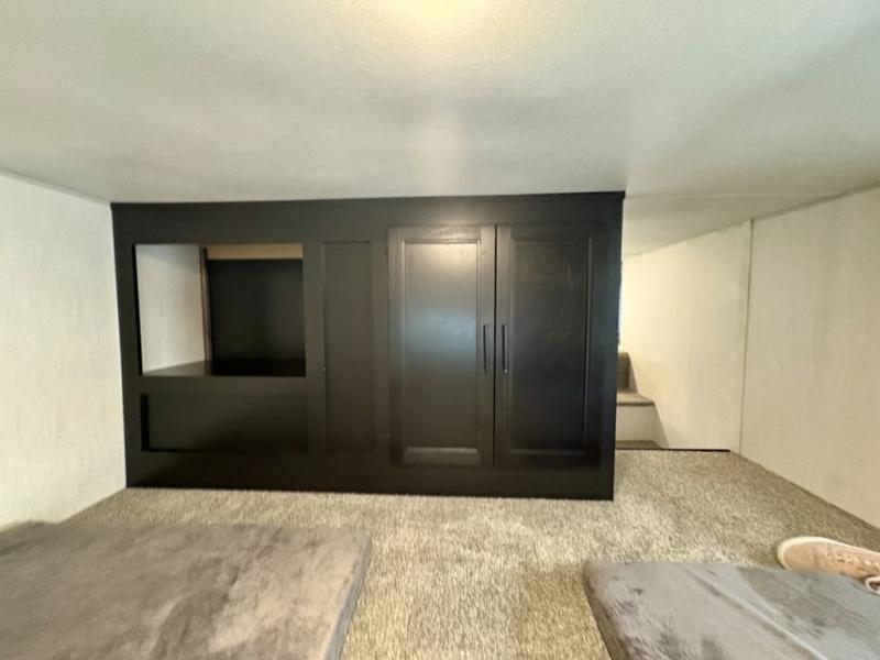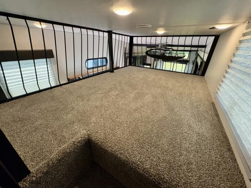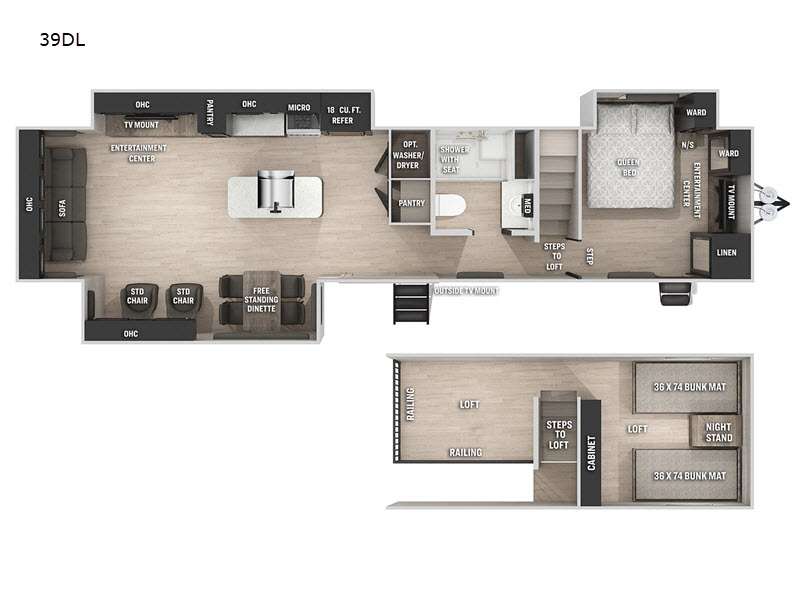 This Timberwolf destination trailer is an excellent and accommodating trailer that will make you feel right at home as soon as you enter through one of the two entry doors. The front private bedroom has a queen bed slide and lots of storage with the two wardrobes and linen closet. There is also an entertainment center where you can add your own TV thanks to the TV mount, and the bedroom even has the second exterior entry door so that you can come and go as you please. Above the bedroom is where the huge loft is located. When you take the stairs up to the loft, you'll find two 36" x 74" bunk mats, a nightstand, a long cabinet, and a large open area with railing. The main living area has a free-standing dinette with chairs, two lounge chairs, and a sofa, so you will have plenty of seating as you watch the main entertainment center.