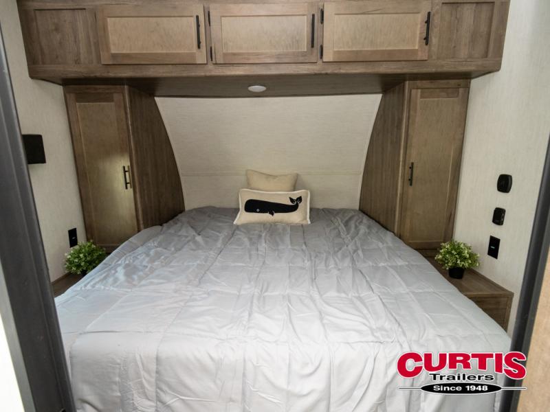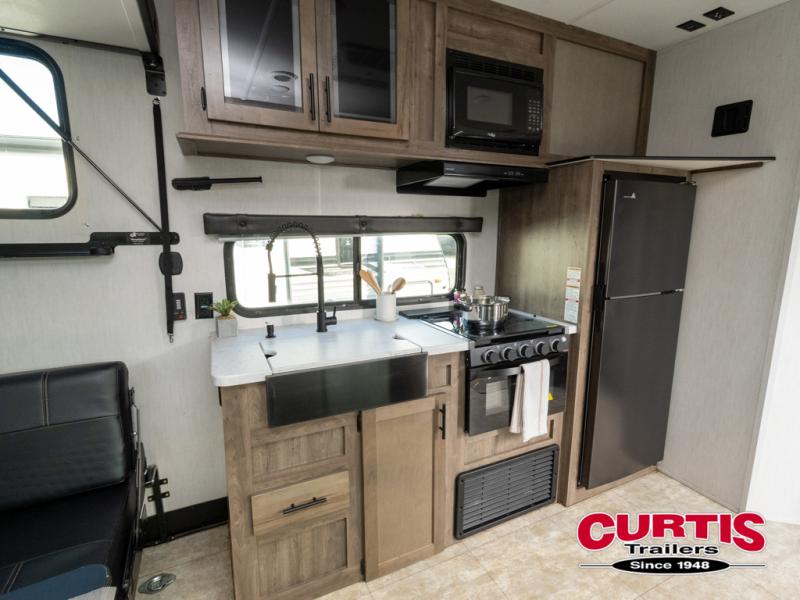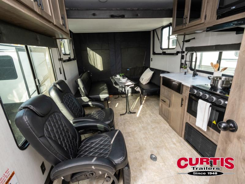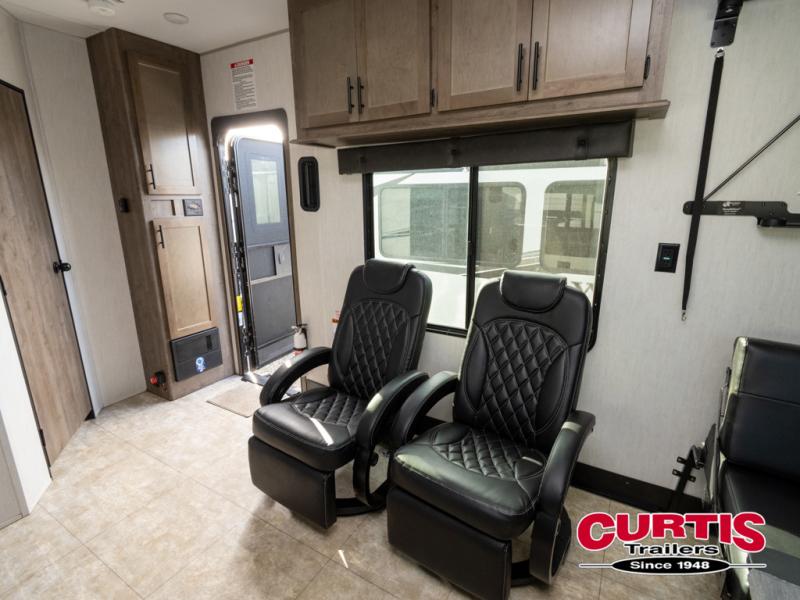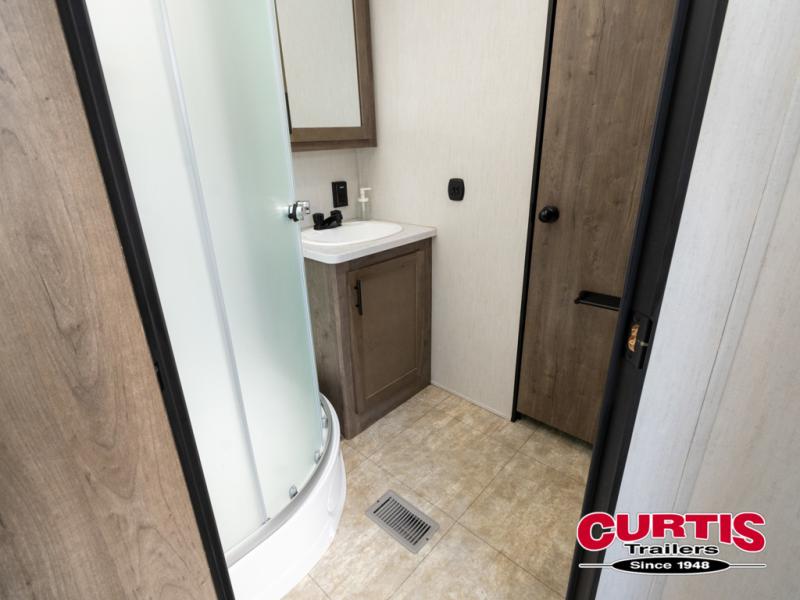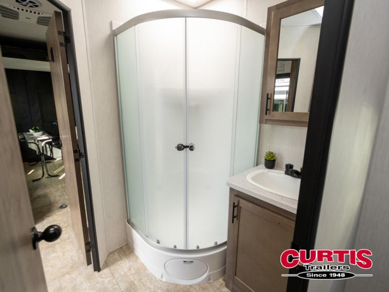 This dual entry toy hauler will keep you happy on every outdoor adventure. Once your dirt bikes are unloaded, relax on the two roll-overs sofas and enjoy lunch before heading out for the day. You can also choose to add two optional lounge chairs for more seating space if needed. The walk-through bath includes a medicine cabinet for your necessities and a linen closet for clean towels, and the front master bedroom includes a Rogue king bed for your comfort.