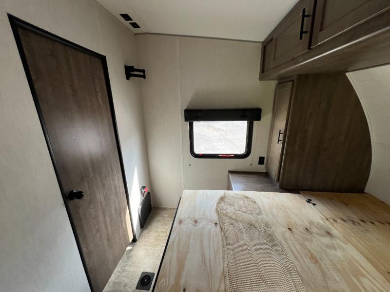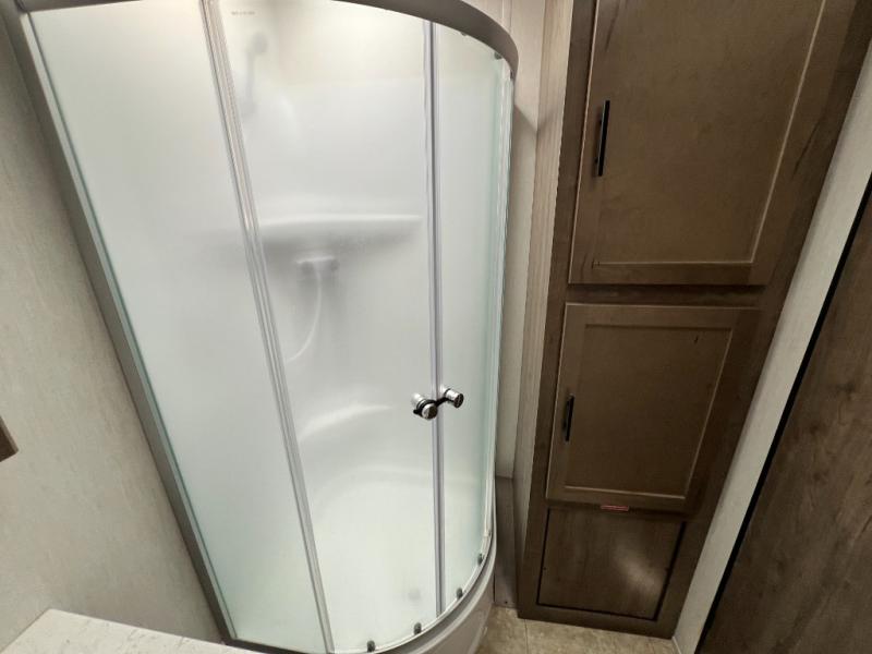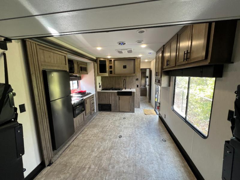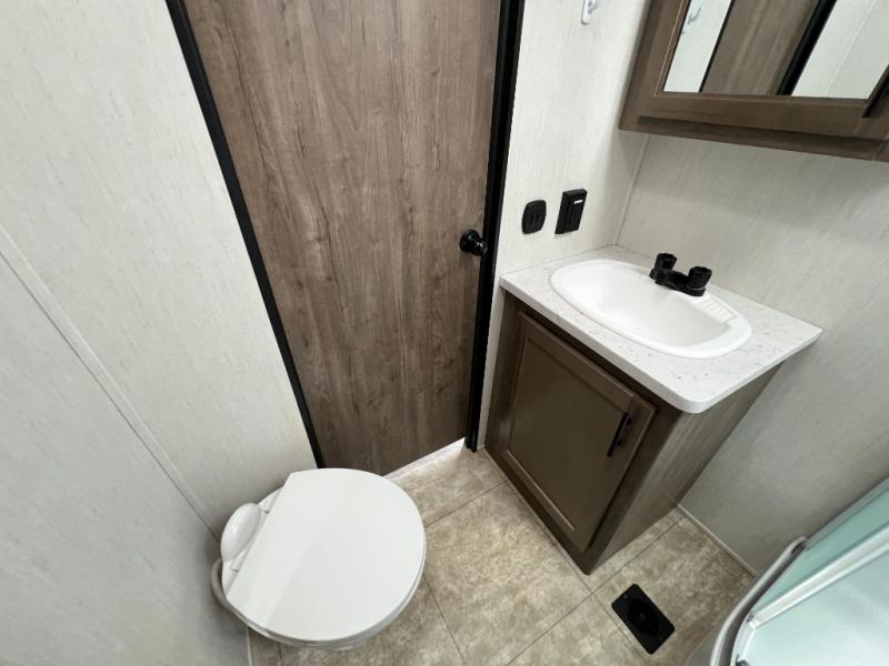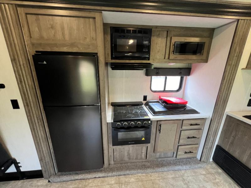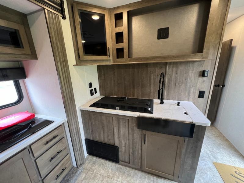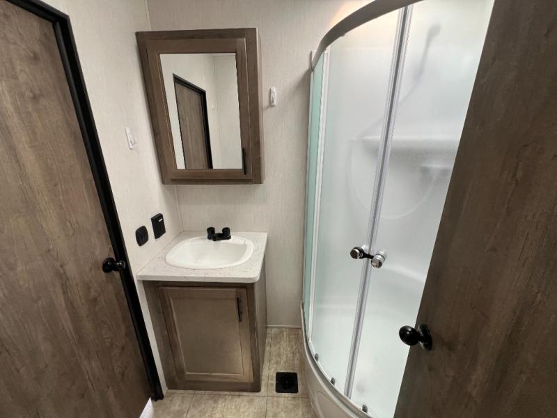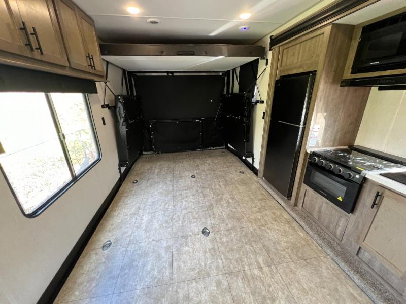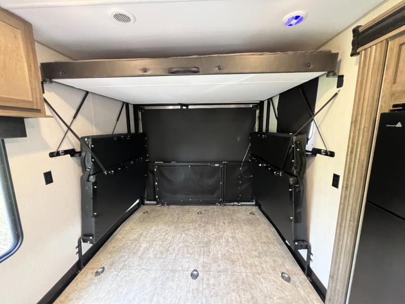 Camping with your favorite ride-on toys is easier than ever in this toy hauler. The 15' total garage space provides tons of space for your gear, plus there is a slide out that will give the chef more room to cook meals. Relax on the roll-overs sofas or add the optional lounge chairs for a more at-home feel. There is plenty of counter space in the kitchen, plus a pantry for snacks or dry goods. You will appreciate the dual entry bath that will give you a private entrance into the front bedroom. Here, you can sleep soundly on the king bed and store your clothes in the dual wardrobes.