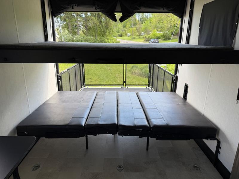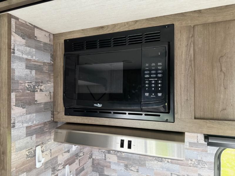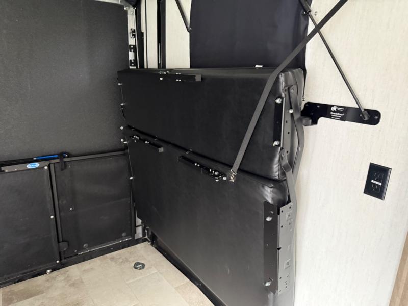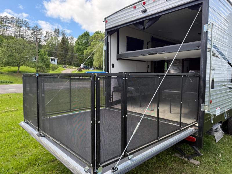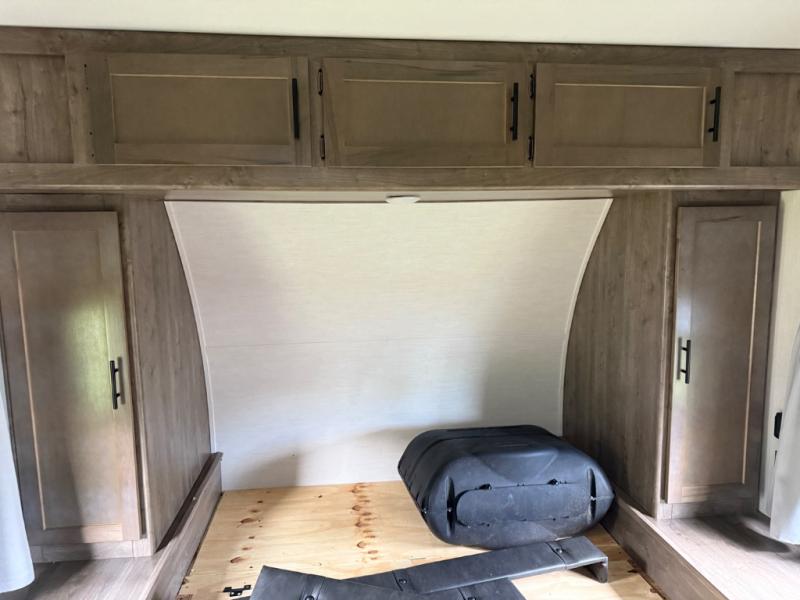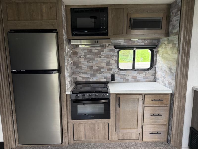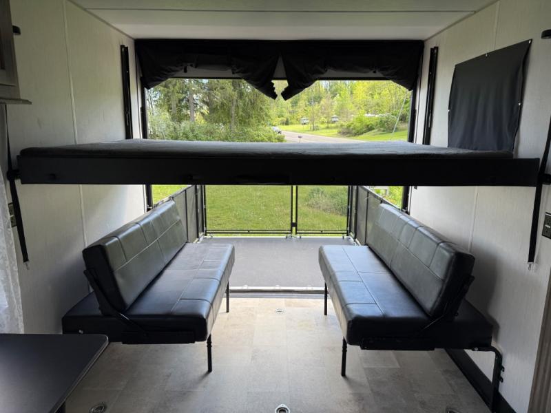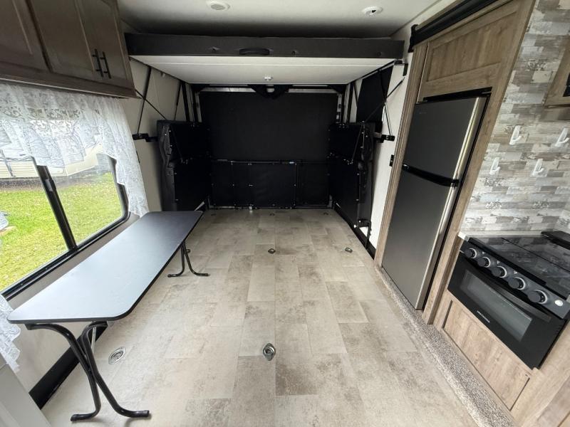 Camping with your favorite ride-on toys is easier than ever in this toy hauler. The 15' total garage space provides tons of space for your gear, plus there is a slide out that will give the chef more room to cook meals. Relax on the roll-overs sofas or add the optional lounge chairs for a more at-home feel. There is plenty of counter space in the kitchen, plus a pantry for snacks or dry goods. You will appreciate the dual entry bath that will give you a private entrance into the front bedroom. Here, you can sleep soundly on the king bed and store your clothes in the dual wardrobes.