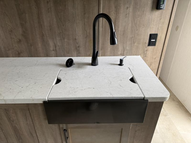 The Vengeance Rogue by Forest River is a budget-friendly toy hauler that you can really get on board with! Some of the features within the Rogue Platinum Package are the zebra shades that will keep light out, a glass shower enclosure, ultracold heated holding tank pads, and much more. There is an outside shower with hot and cold water so you can fill the dogs water bowl or wash the mud from your riding gear, and the enclosed underbelly will allow you to extend your camping season. You will love the look of the residential black stainless steel farm sink, along with seamless countertops and LED interior lighting with accents.