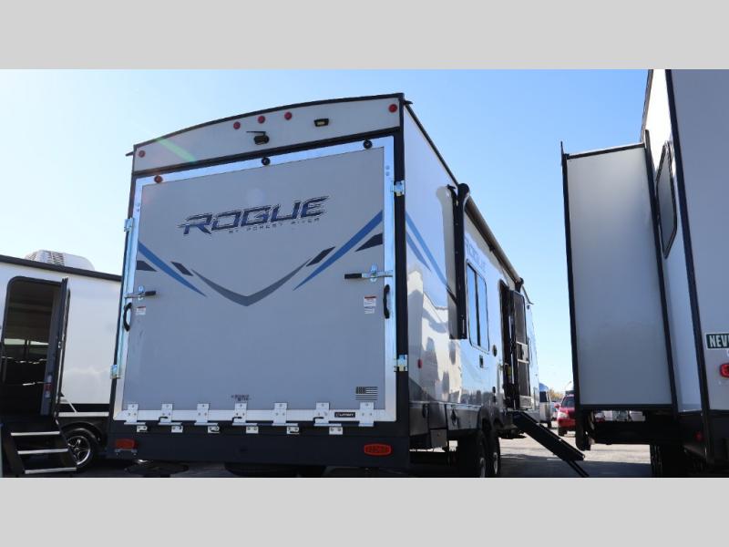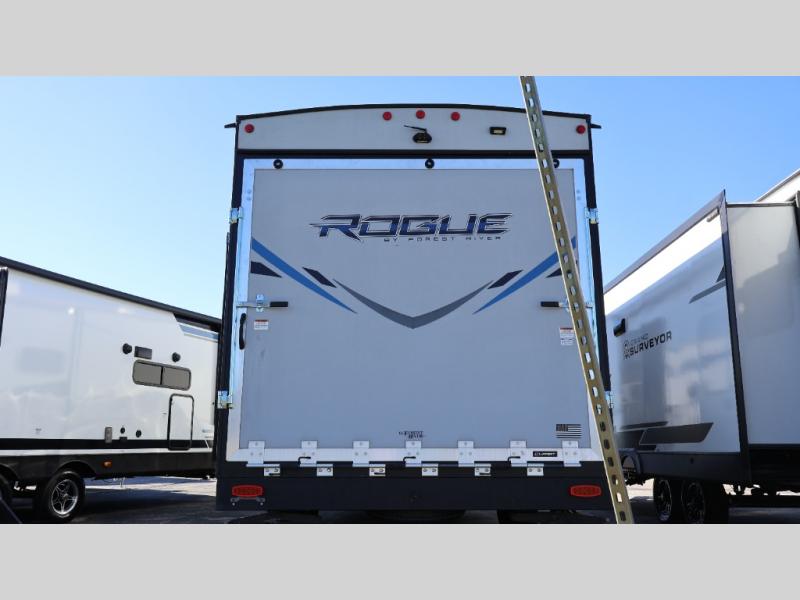 The Vengeance Rogue by Forest River is a budget-friendly toy hauler that you can really get on board with! Some of the features within the Rogue Platinum Package are the zebra shades that will keep light out, a glass shower enclosure, ultracold heated holding tank pads, and much more. There is an outside shower with hot and cold water so you can fill the dogs water bowl or wash the mud from your riding gear, and the enclosed underbelly will allow you to extend your camping season. You will love the look of the residential black stainless steel farm sink, along with seamless countertops and LED interior lighting with accents.