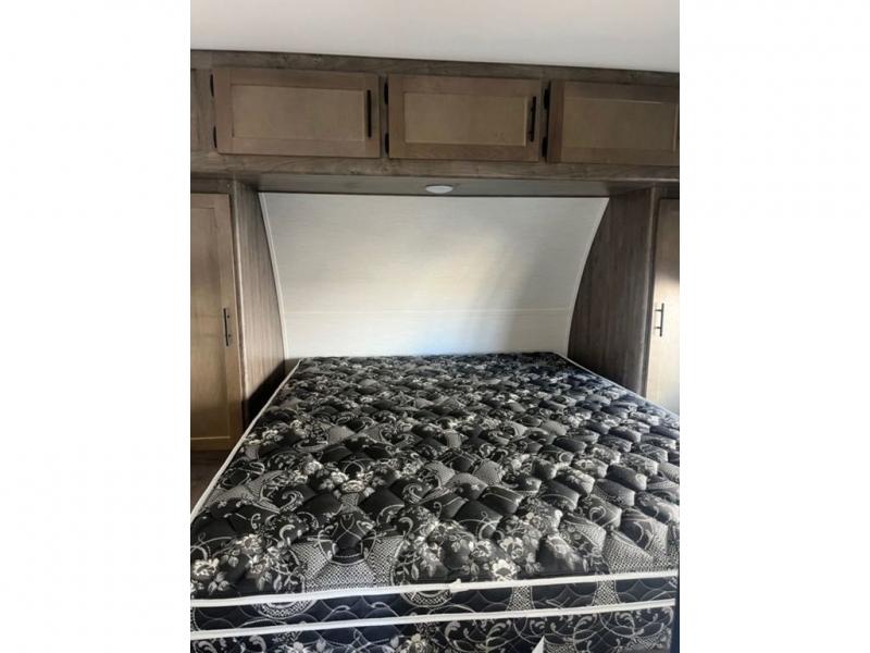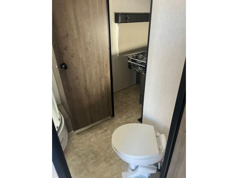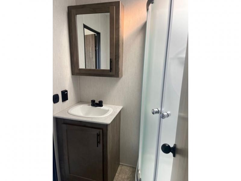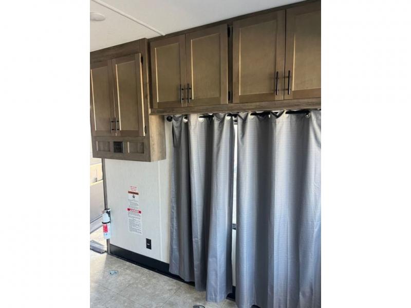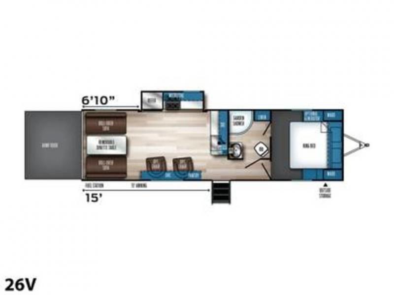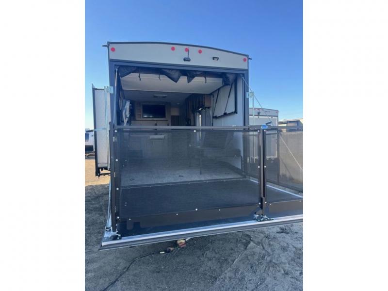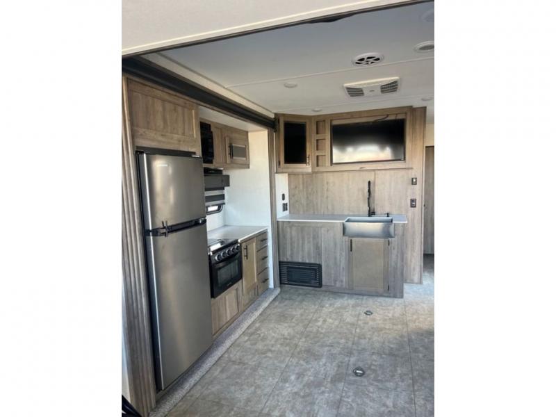 Camping with your favorite ride-on toys is easier than ever in this toy hauler. The 15' total garage space provides tons of space for your gear, plus there is a slide out that will give the chef more room to cook meals. Relax on the roll-overs sofas or add the optional lounge chairs for a more at-home feel. There is plenty of counter space in the kitchen, plus a pantry for snacks or dry goods. You will appreciate the dual entry bath that will give you a private entrance into the front bedroom. Here, you can sleep soundly on the king bed and store your clothes in the dual wardrobes.