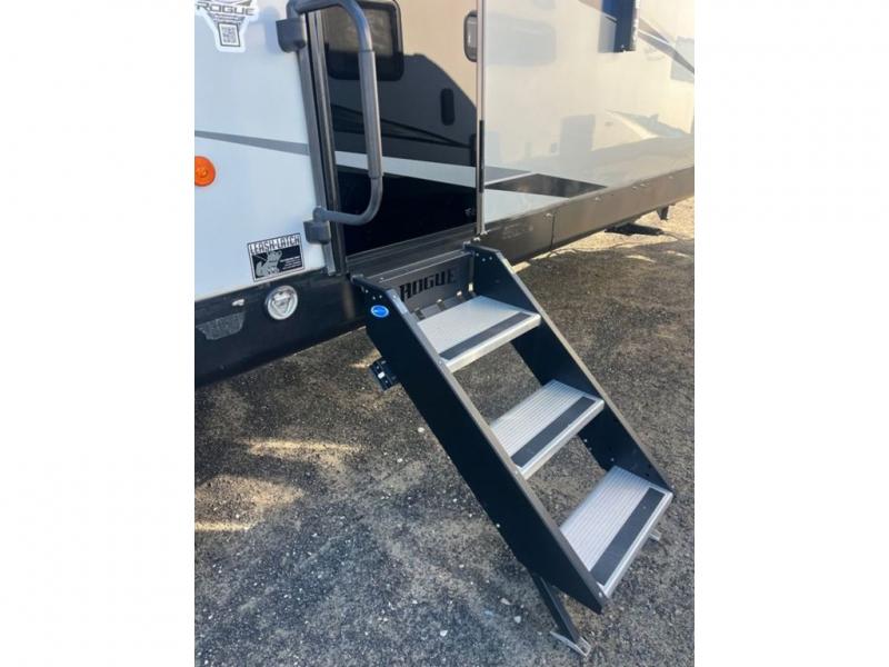 The Vengeance Rogue by Forest River is a budget-friendly toy hauler that you can really get on board with! Some of the features within the Rogue Platinum Package are the zebra shades that will keep light out, a glass shower enclosure, ultracold heated holding tank pads, and much more. There is an outside shower with hot and cold water so you can fill the dogs water bowl or wash the mud from your riding gear, and the enclosed underbelly will allow you to extend your camping season. You will love the look of the residential black stainless steel farm sink, along with seamless countertops and LED interior lighting with accents.