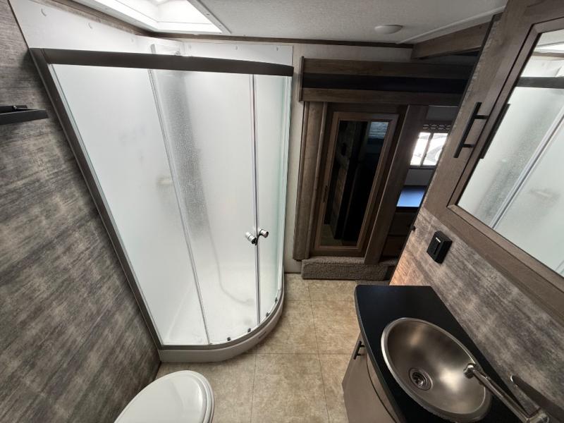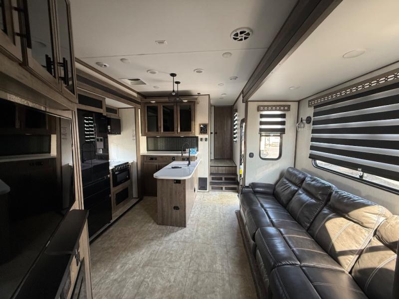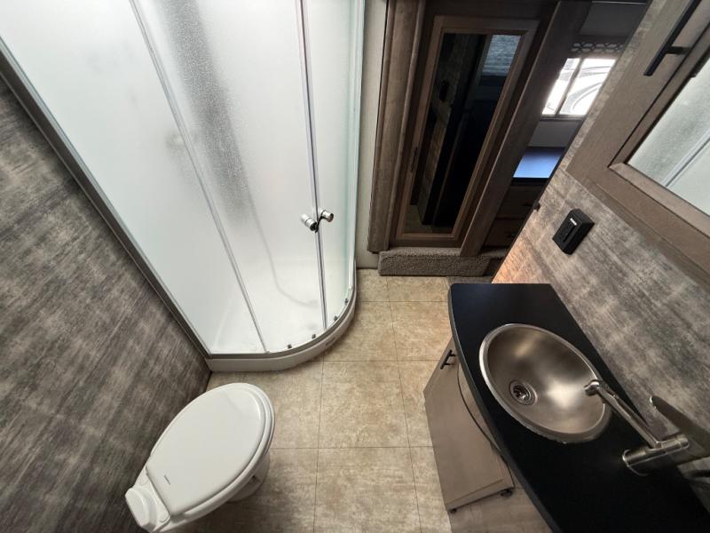 The 15' 6" garage area of this fifth wheel toy hauler has enough space for you to bring along your favorite off-road toys! The garage area also has opposing flip-up sofas with a table in between and a raised queen bed above, plus a loft, a half bathroom, and an area prepped for an optional washer and dryer. There is lots of walking around space in the middle living/kitchen area thanks to the sofa with recliners slide, as well as the refrigerator and three burner cooktop slide. The dual entry bathroom has a radius shower for you to freshen up in each morning and an entrance into the front private bedroom for more convenience!