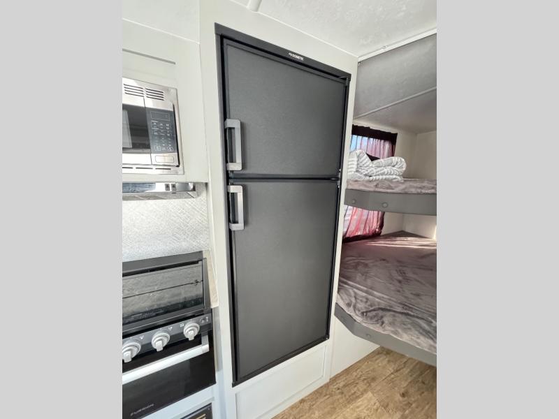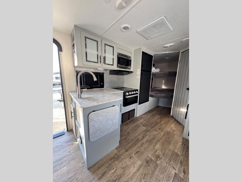 Eat, sleep, relax, and play all in this spacious travel trailer. There are double-size bunks for your guests, and a queen bed in the front private bedroom for you. Everyone can meet in the main living area to enjoy a meal around the U-shaped dinette before heading out for the day. This model includes a three burner cooktop, a black oven, and a microwave oven for quick meals. Choose the exterior kitchen option and you can grill up burgers in no-time! The full bath includes its own exterior entry door for convenience, and you'll find plenty of interior storage for all your belongings, including a large pantry!