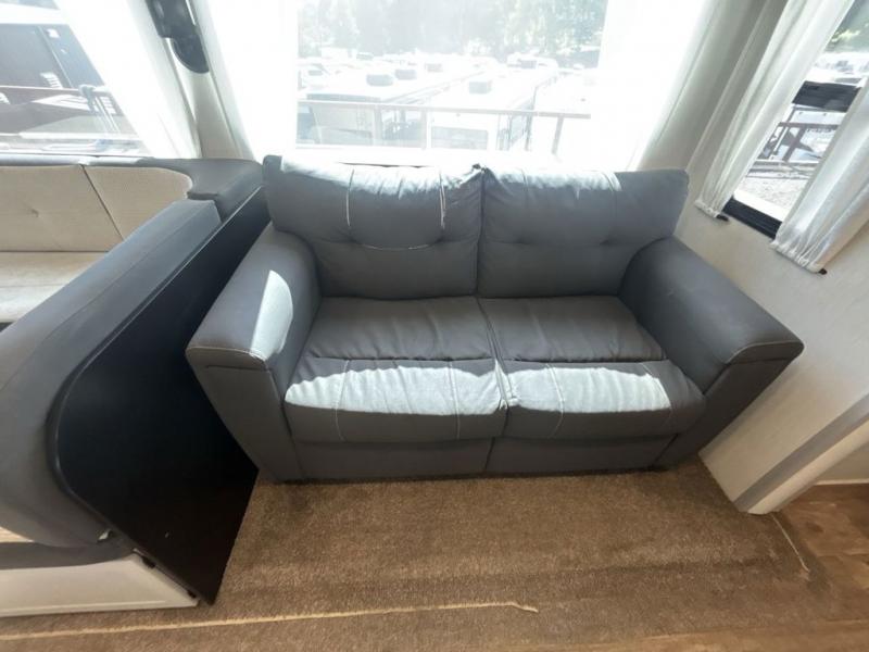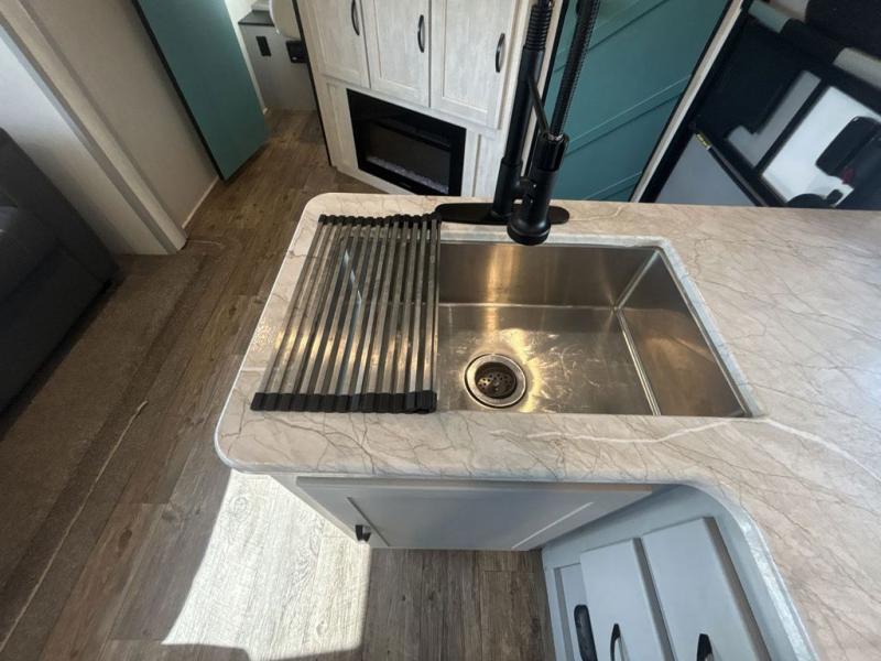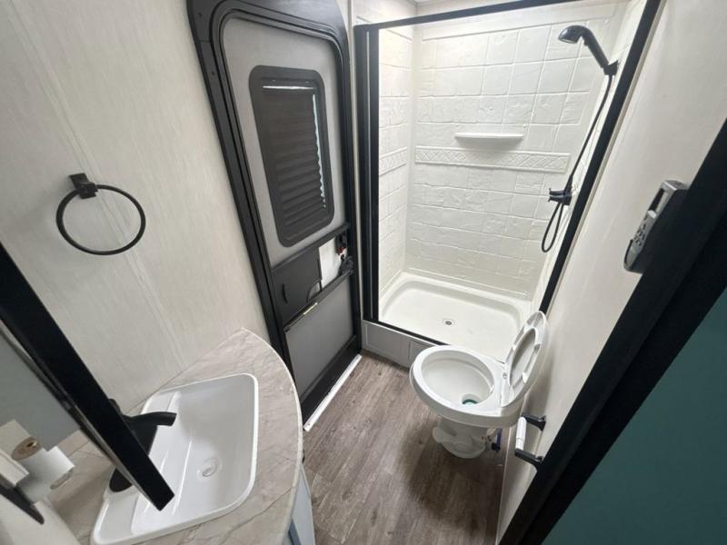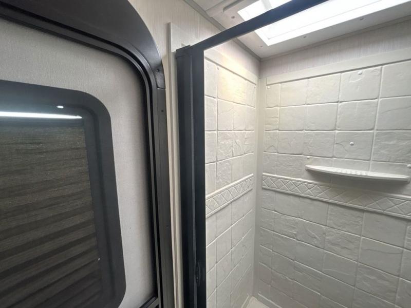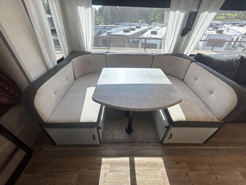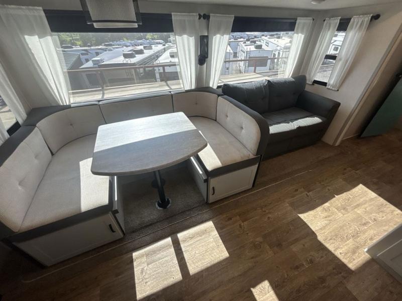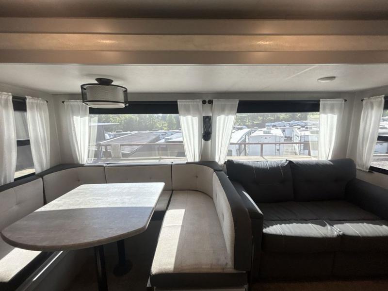 Are you looking to upgrade your RV to a trailer with more space and more features? Look no further than this Vibe that can sleep ten people each night. The kids are sure to claim the double-size bunks to themselves, while the adults take the front private bedroom with the queen bed. You will find even more sleeping space on the U-shaped dinette and sleeper sofa within the large slide out. After a day outdoors at the lake, get cleaned up in the full bath that includes a 40" x 30" walk-in shower and its own exterior entry door for convenience. There is so much more to love about this model, like the fireplace and entertainment center, the oversized panoramic windows, and the large pass-through storage for all your gear!