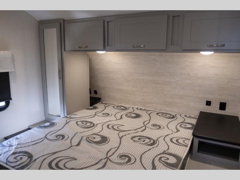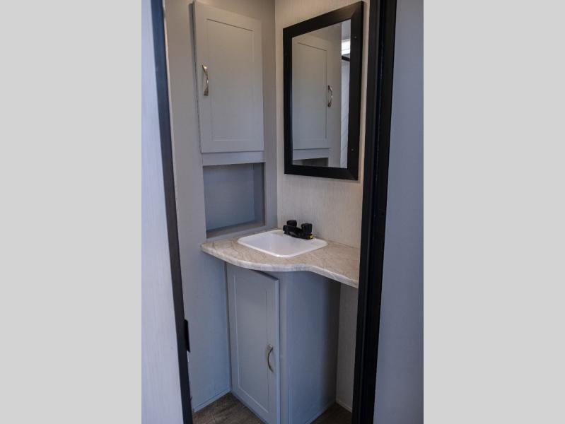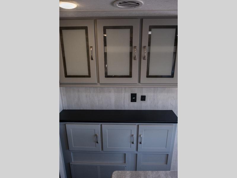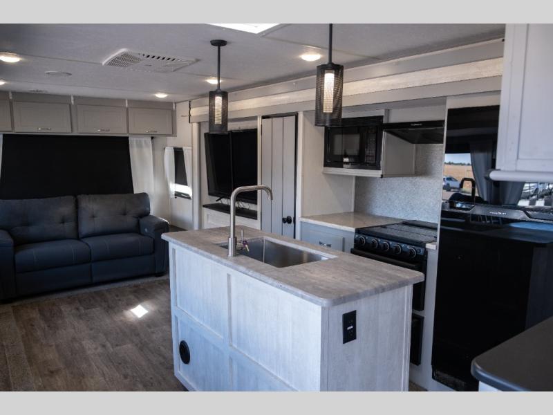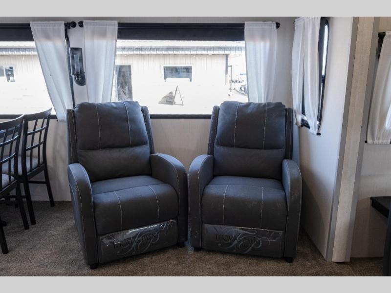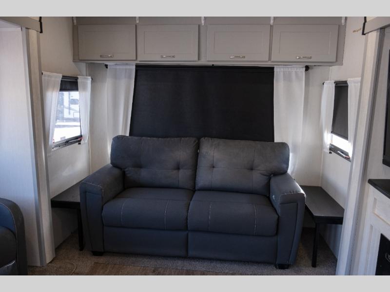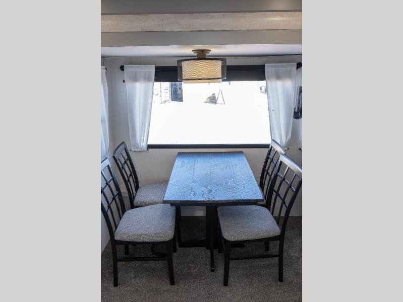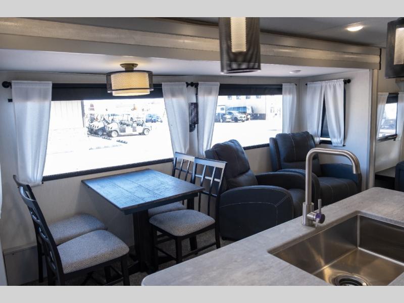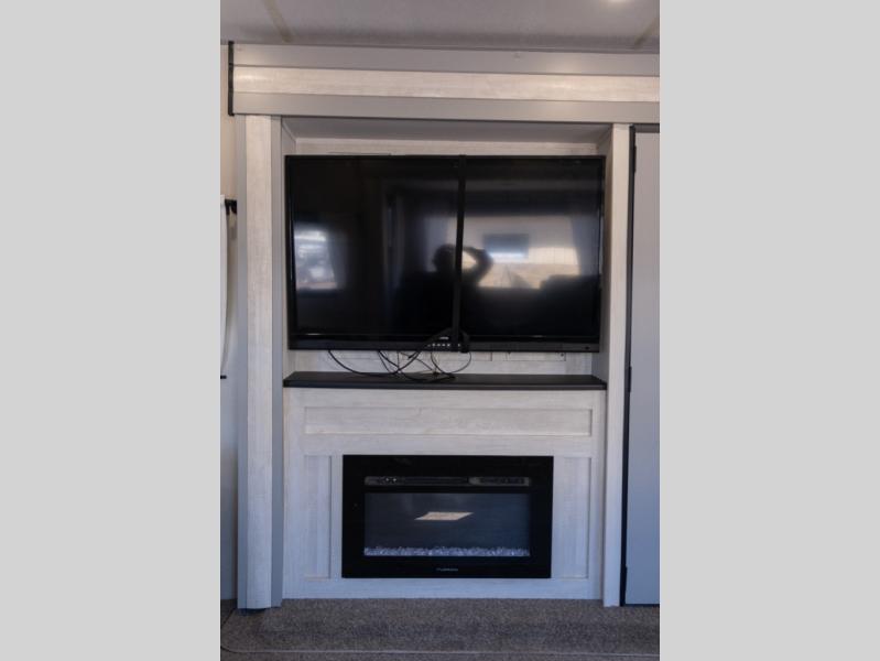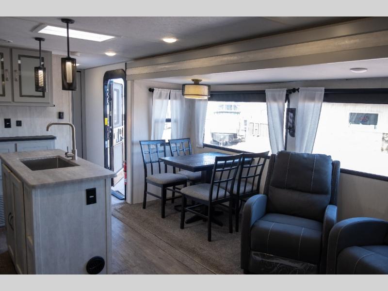 This travel trailer allows you to enjoy the Great Outdoors without having to give up your creature comforts. The dual opposing slides provide the chef space to work around the kitchen island, and there is plenty of seating space for your guests on the dual recliners, the sleeper sofa, and the booth dinette. The fireplace and LCD TV will be perfect for those rainy days, and there is even a living area skylight to let natural light in. This model also includes Sure-Step entry steps, a large pass-through storage, plus two power awnings with LED lights so you can spend more time outdoors with friends and family!