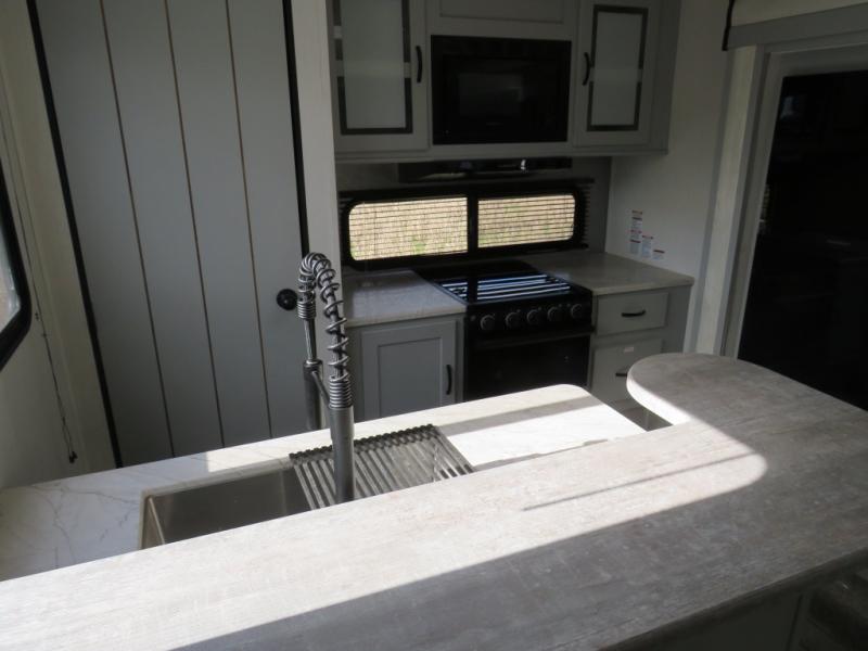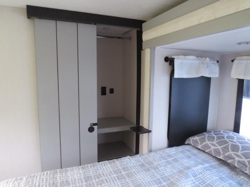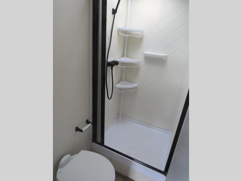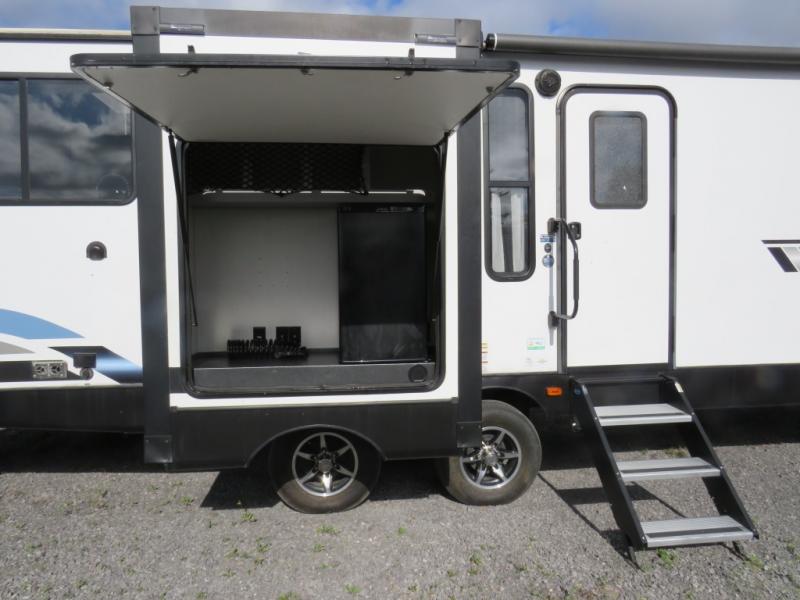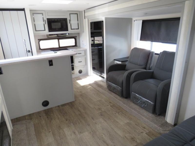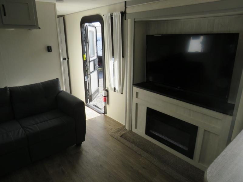 There is no going back to your tent-camping days after touring this travel trailer. The rear kitchen is any chef's dream with its walk-in pantry, residential refrigerator, plus a bar with stools where the kids can enjoy coloring. You will find comfortable seating space on the dual chairs and tri-fold sofa, and the fireplace and 50" TV with storage will feel just like home. The full bath will allow everyone space to clean up each day, and the front private bedroom will be your own oasis away from it all. Here, you will enjoy a slide out queen bed, a dresser where you can add a TV if you choose, plus a front walk-in closet so you can bring along all your favorite outfits!