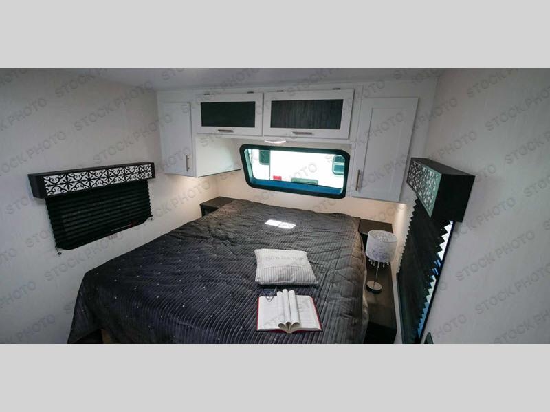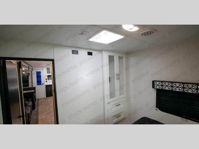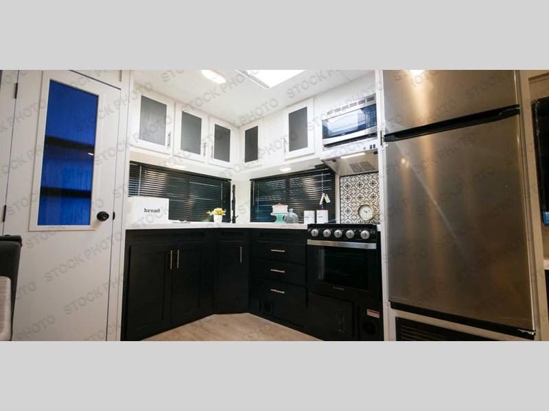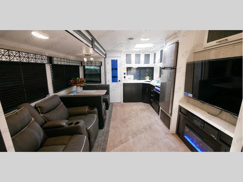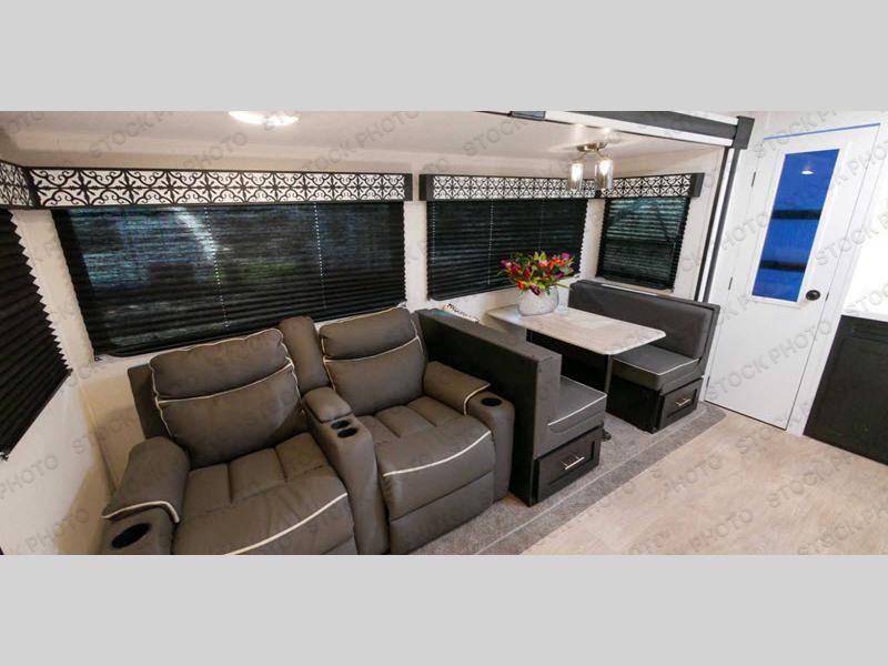 If you like to bring along all of your comforts from home, then no worries because this trailer has you covered on storage space. There is a large pass-through storage, additional exterior storage, and three closets in the bedroom for all your belongings. The panoramic windows will allow natural light to come in, and the large slide out provides space to let the dog nap on the floor. The rear kitchen is packed with features you will love, including a walk-in pantry, a residential refrigerator, plus tons of counter space. You will get a great night's rest on the king bed, and your guests can sleep on the tri-fold sleeper sofa and the booth dinette.