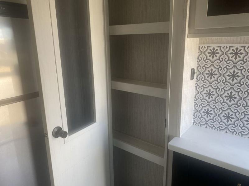 This is the perfect couple's trailer with space for two overnight guests or little ones on the rear hide-a-bed sofa. You will enjoy the front private bedroom with its king bed slide out, a dresser and a bench seat, plus a walk-in wardrobe with washer and dryer prep. The full bath includes plenty of space to freshen up, and there is a linen closet here for clean towels. Check out the main living area that features tons of space thanks to the dual opposing slides, and the kitchen island brings that extra touch of home to this space. The LED HDTV sits within the entertainment center directly across from the theater seating for perfect viewing, and this model includes tons of storage space, including two pantries, a hutch, and a pass-through storage!