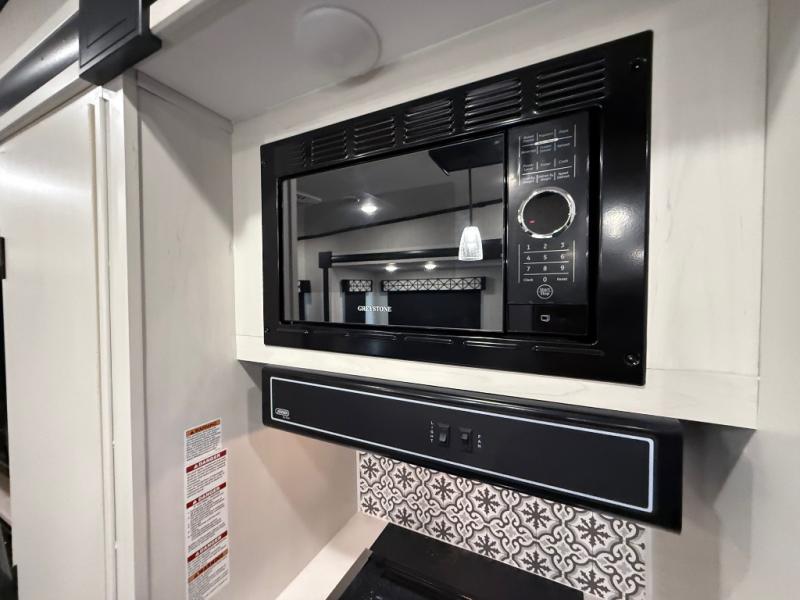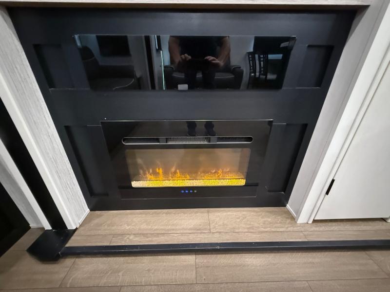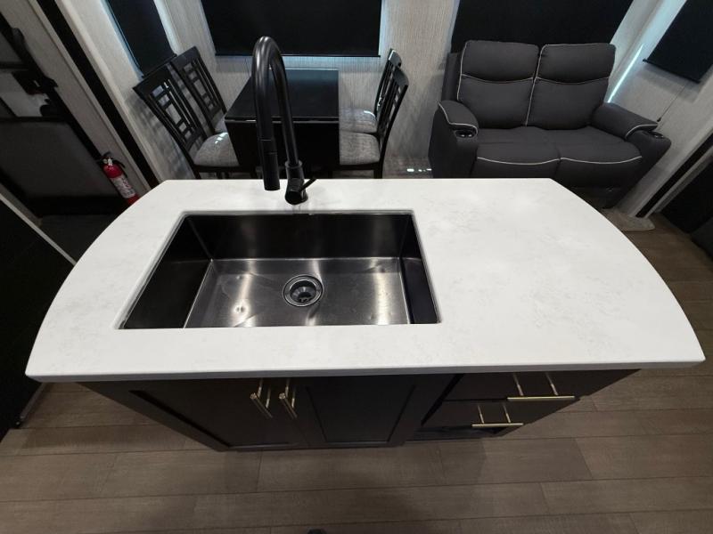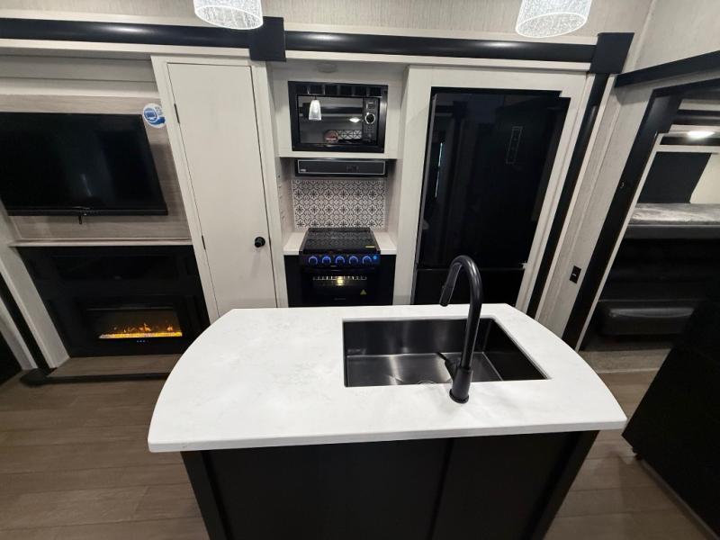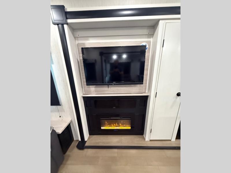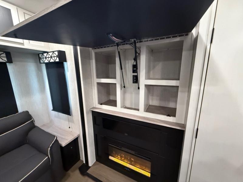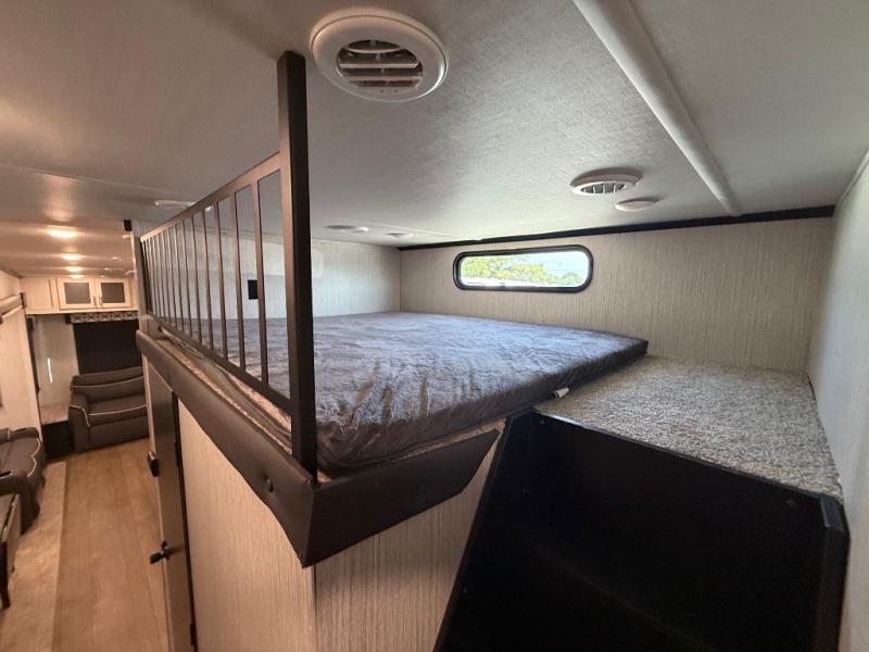 Wow check out this fifth wheel with four slide outs, a middle bunkhouse with a loft, plus two power awnings! The main living area includes 60" theater seating across from the entertainment center and fireplace, a hide-a-bed sofa, and a free-standing dinette to enjoy meals together. Your guests will love having their own space in the bunkhouse that includes a jackknife sofa, a flip-down bunk, plus a dresser and a TV. Head to the front private bedroom for a great night's rest on the slide out king bed, and there is a walk-in wardrobe with washer and dryer prep for full-time living!