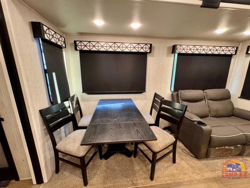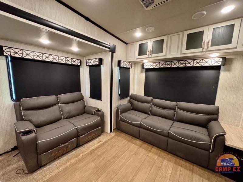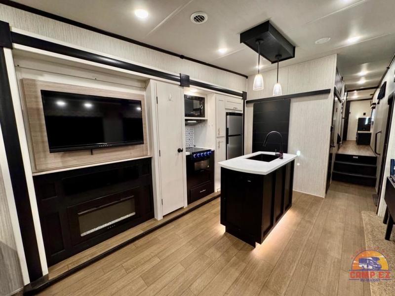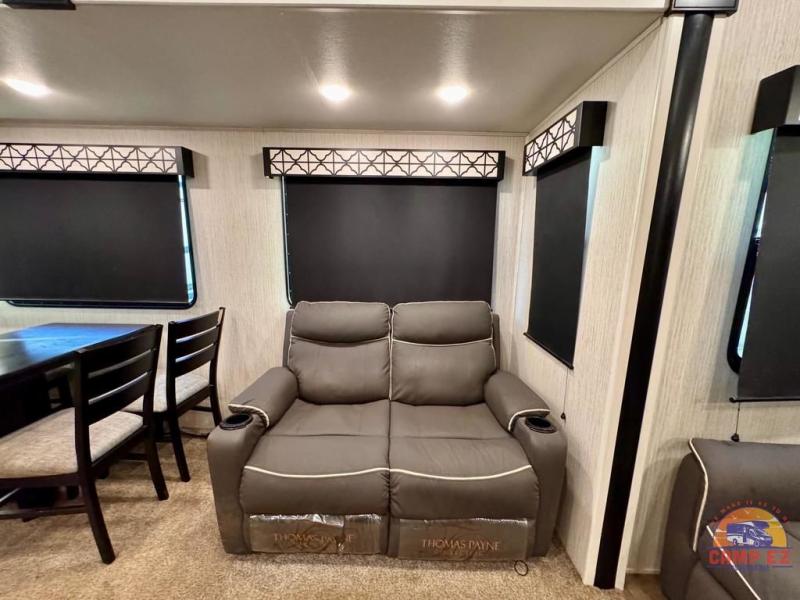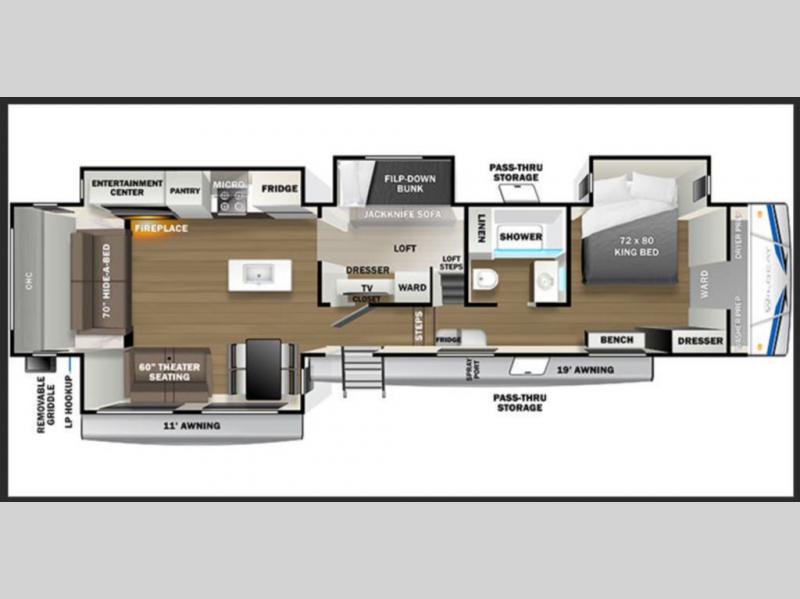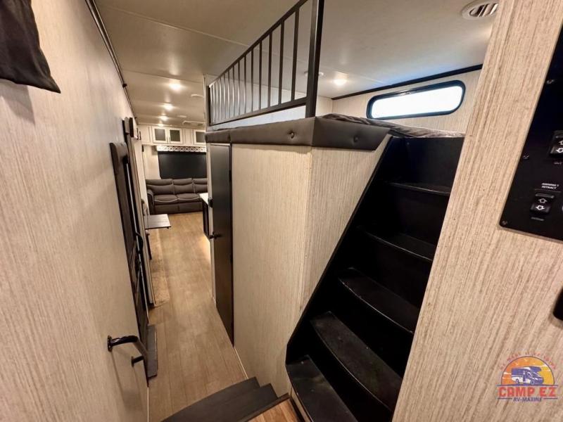 Wow check out this fifth wheel with four slide outs, a middle bunkhouse with a loft, plus two power awnings! The main living area includes 60" theater seating across from the entertainment center and fireplace, a hide-a-bed sofa, and a free-standing dinette to enjoy meals together. Your guests will love having their own space in the bunkhouse that includes a jackknife sofa, a flip-down bunk, plus a dresser and a TV. Head to the front private bedroom for a great night's rest on the slide out king bed, and there is a walk-in wardrobe with washer and dryer prep for full-time living!
