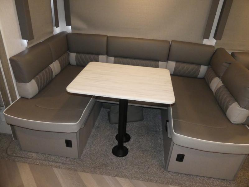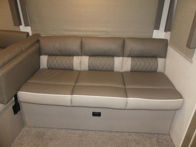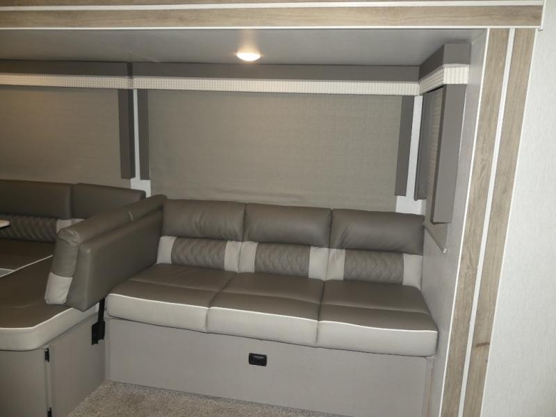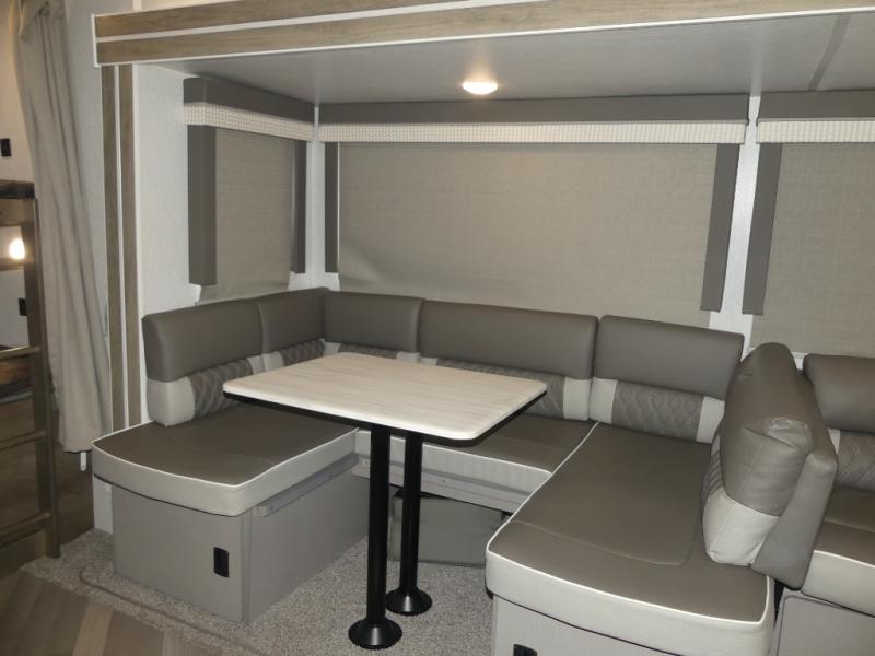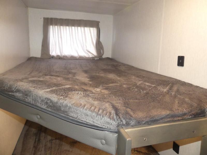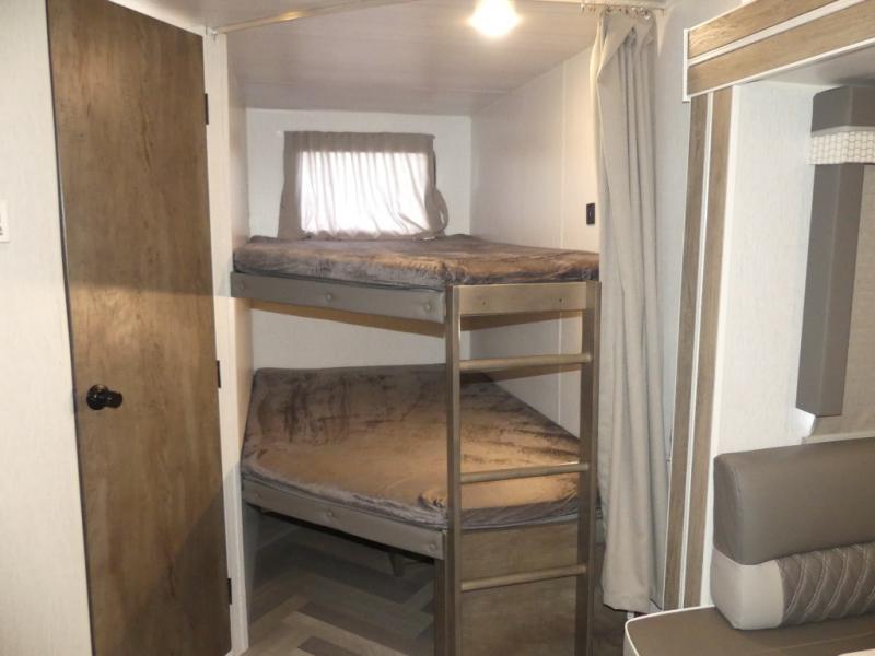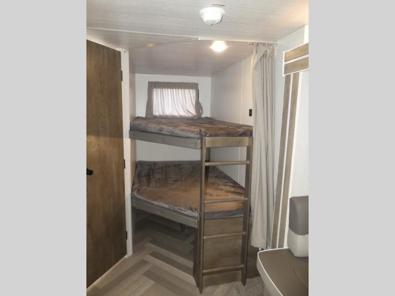 This Wildwood travel trailer is perfect for a larger group and family since it includes double-size bunks for the kids and a front private bedroom for mom and dad. You'll find a Versa Lounge in the large slide out which includes a large U-shaped dinette and sofa, and the panoramic windows will provide great views. This model includes two entry doors, one leading into the main living area and another leading into the rear corner bath for convenience. Bring along all of your camping gear in the pass-through storage, and the interior walk-in pantry can hold all the snacks.