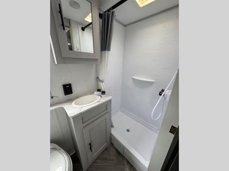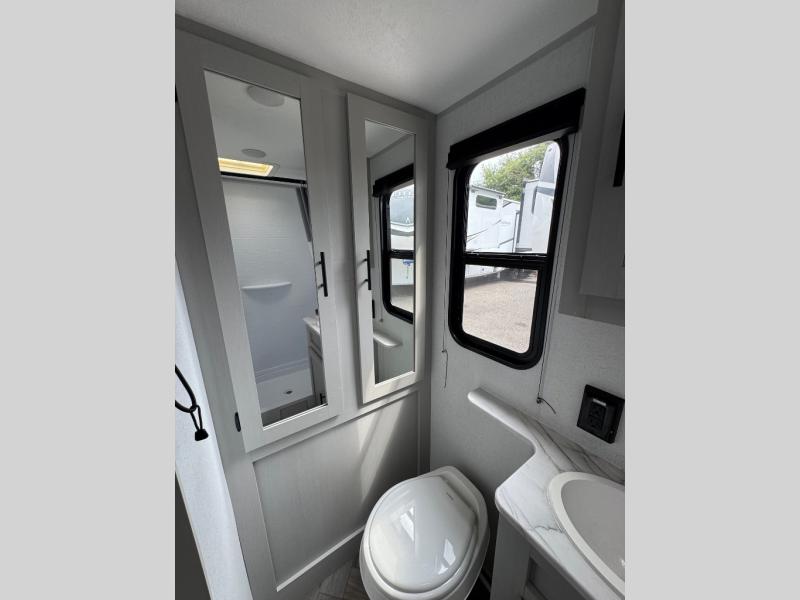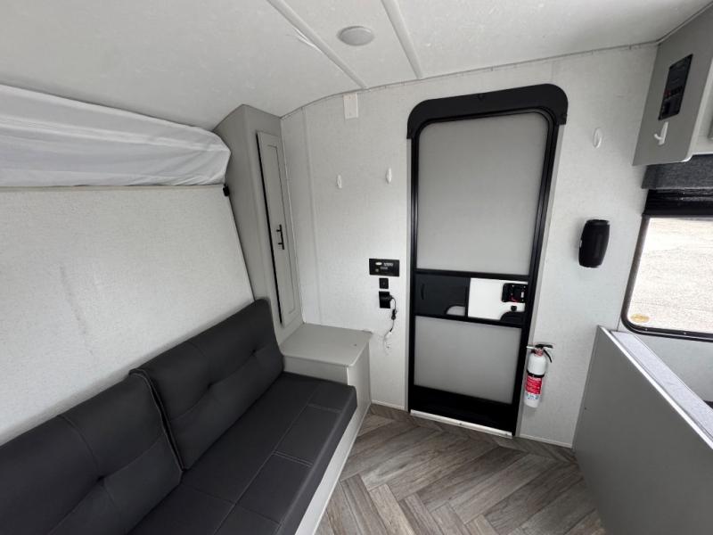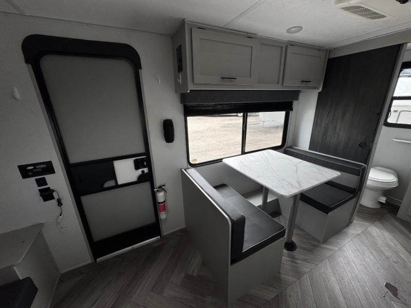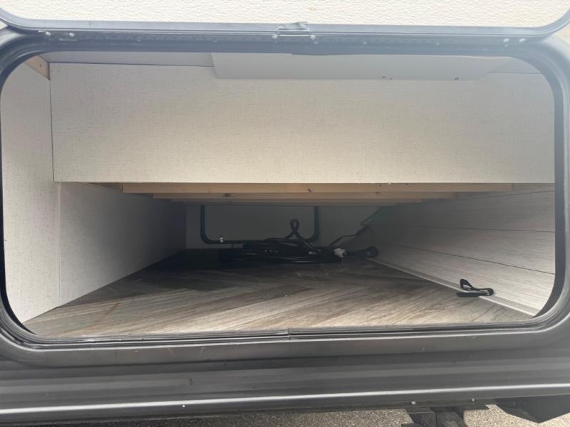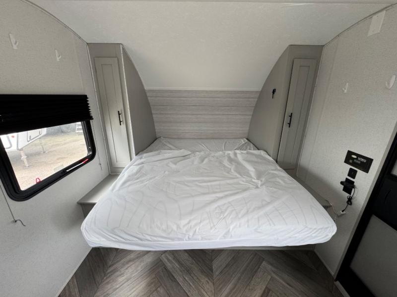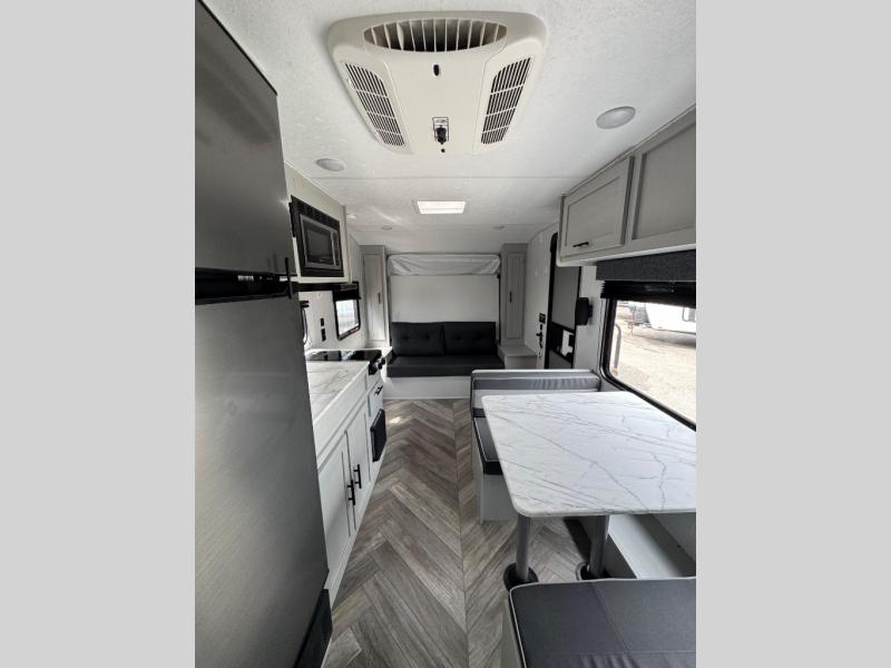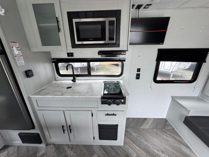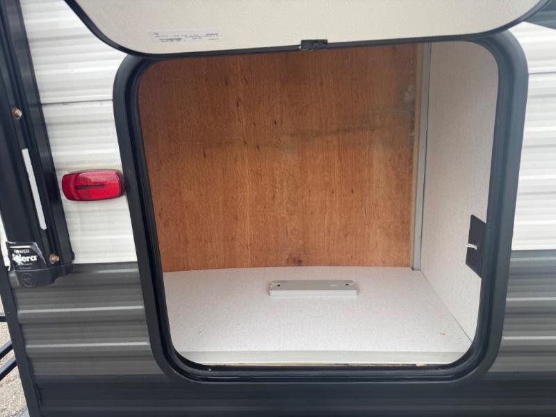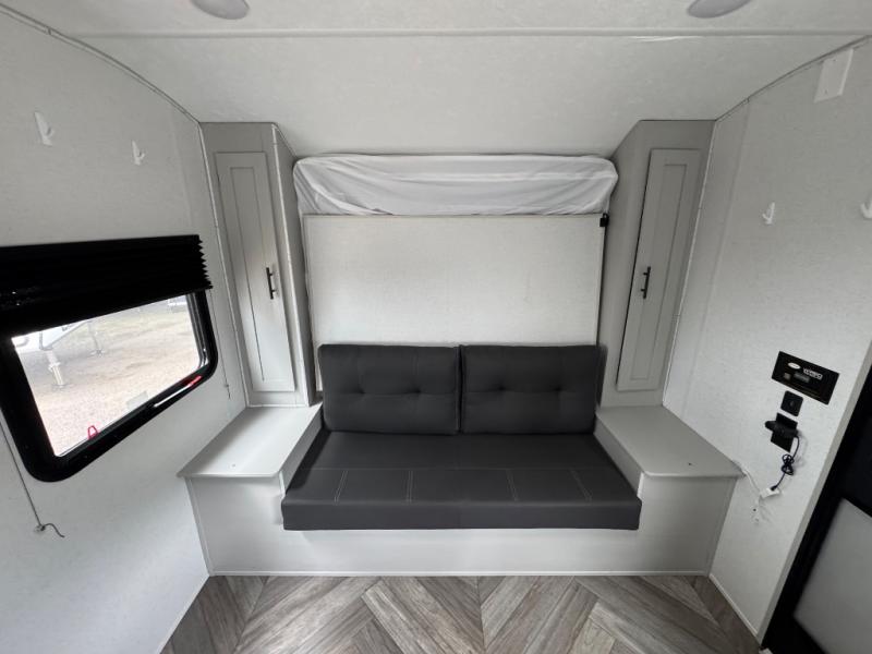 This travel trailer with a full rear bath and versatile sleeping space is your ticket to fun and adventure. While you're putting out the 12' power awning, you can grab a cold drink from the outdoor refrigerator and grab the lawn chairs from the full pass-through storage. There is a two burner cooktop and a microwave oven to prepare your meals in, and a booth dinette to dine at. You'll love the RV queen Murphy bed to sleep on at night, and the sofa with storage to relax on during the day!