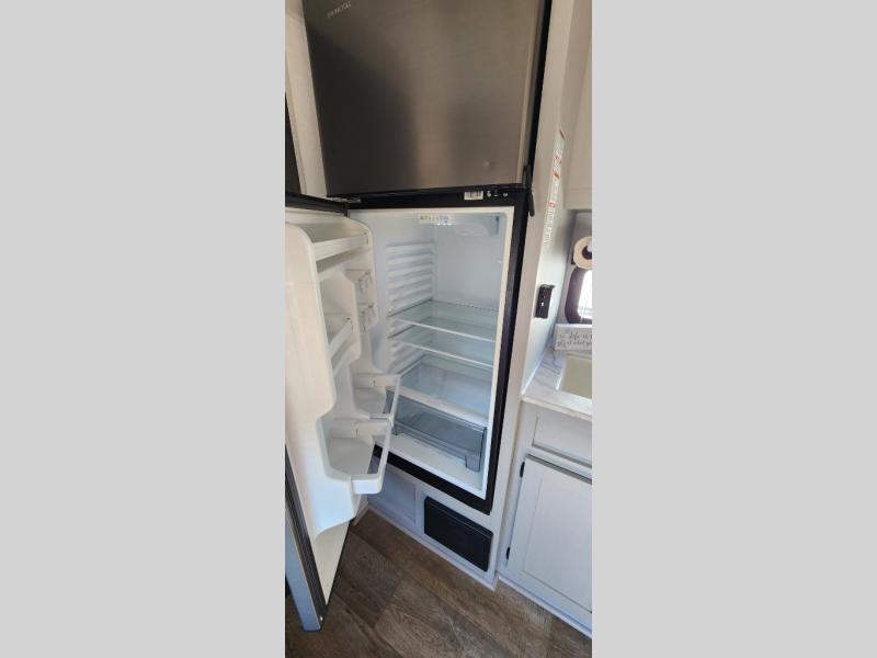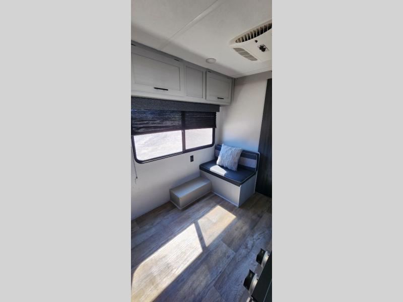 This travel trailer with a full rear bath and versatile sleeping space is your ticket to fun and adventure. While you're putting out the 12' power awning, you can grab a cold drink from the outdoor refrigerator and grab the lawn chairs from the full pass-through storage. There is a two burner cooktop and a microwave oven to prepare your meals in, and a booth dinette to dine at. You'll love the RV queen Murphy bed to sleep on at night, and the sofa with storage to relax on during the day!