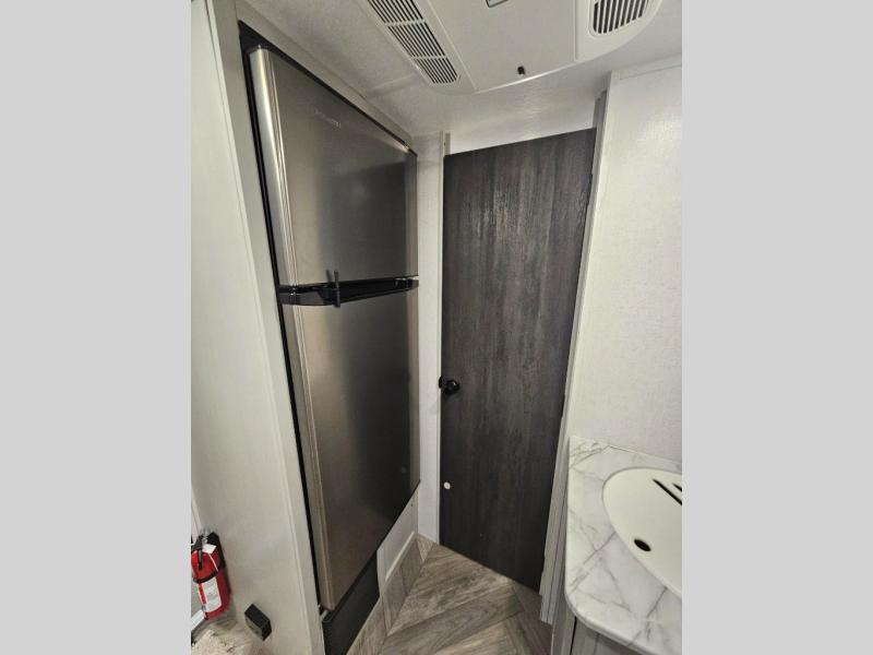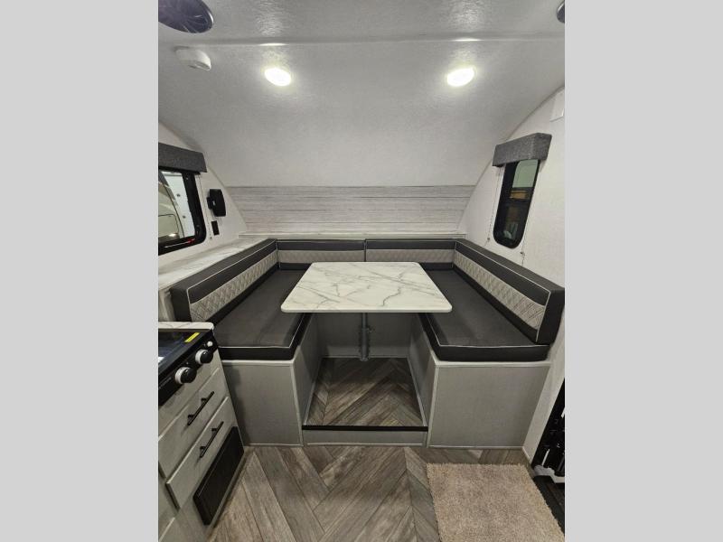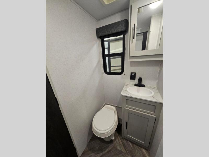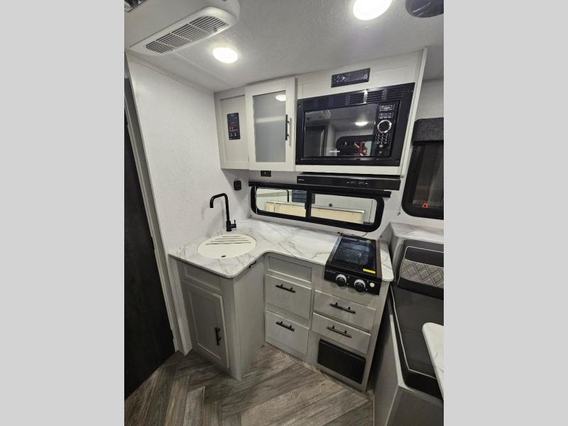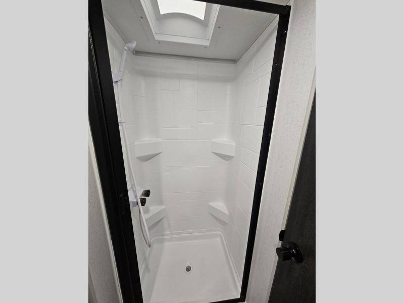 Adventure starts with this travel trailer in tow. Once you arrive at the campground, set up the 15' power awning with LED lights and fill the dogs water bowl using the hot/cold outside shower. Head inside to prepare lunch on the two burner cooktop, and you can dine together around the U-shaped dinette. This area can become your guests sleeping space at night, while you enjoy the queen bed in the rear bedroom. There is a private toilet and sink, with a private shower right across the hall so two people can get ready for bed at the same time. How convenient!