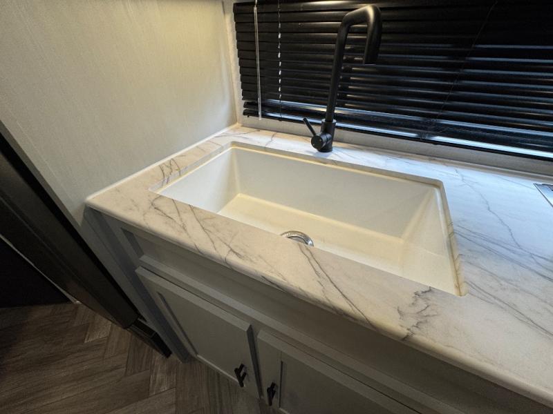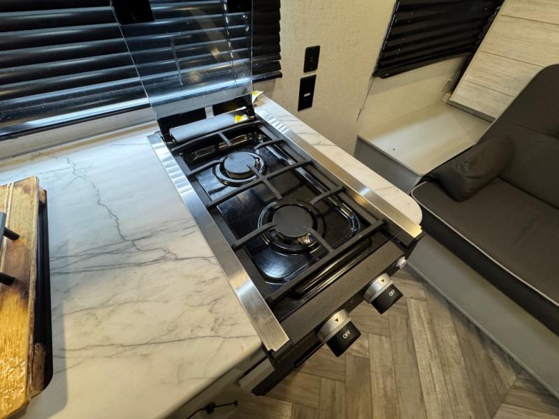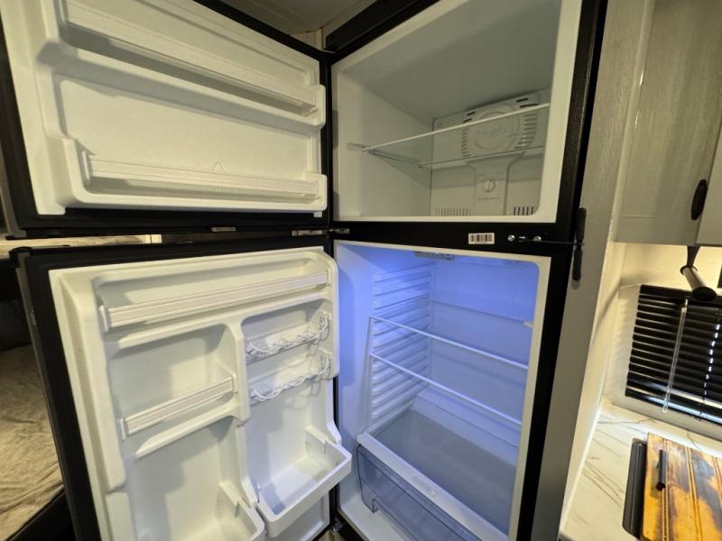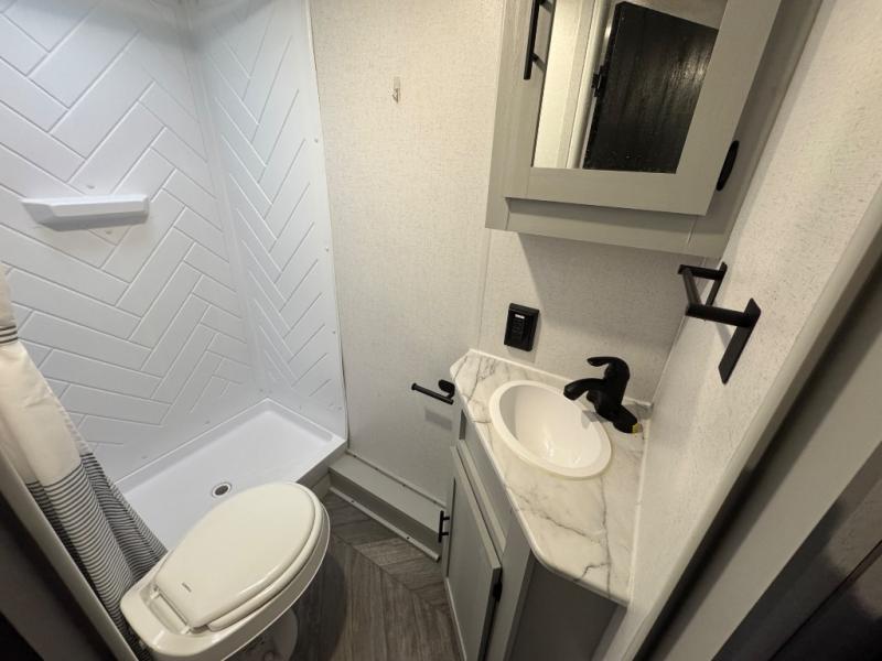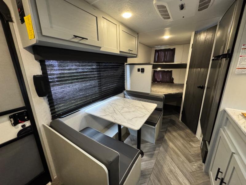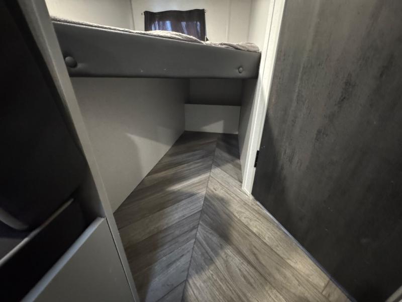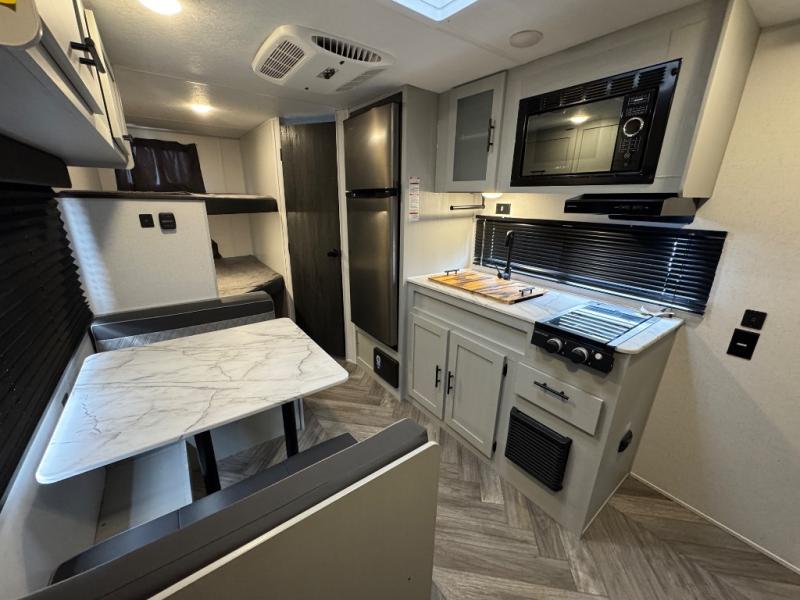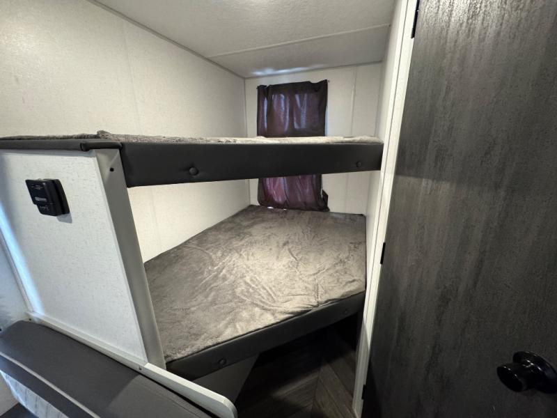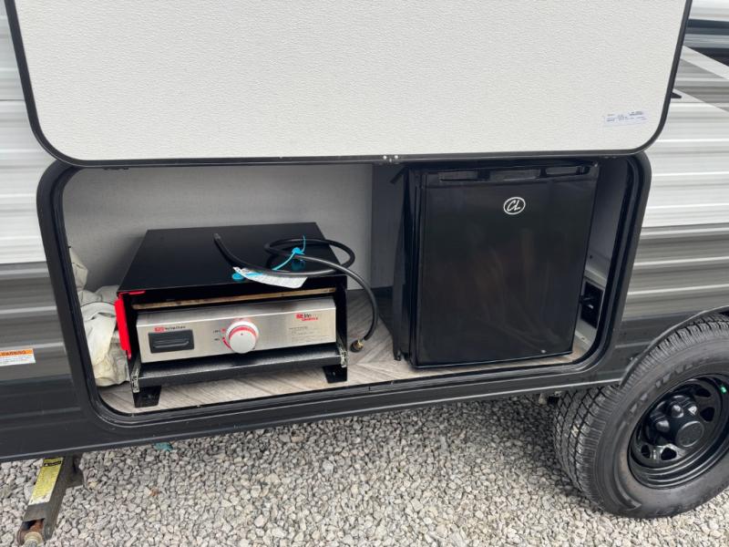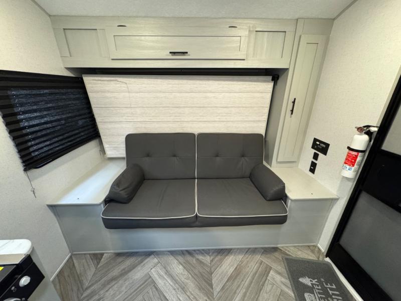 Find all you're looking for and more in this versatile travel trailer. The RV queen Murphy bed will be perfect for a great night's rest, and in the morning you can easily fold it up to relax on the sofa with storage access. The chef of your group can prepare breakfast on the two burner cooktop, or head outdoors to cook pancakes on the outdoor LP griddle. There is also a 1.6 Cu. Ft. outdoor refrigerator here and a 14' power awning with LED lights for shade. The full bath allows you to stay clean all week, and the double-size bunks will be perfect for extra guests!