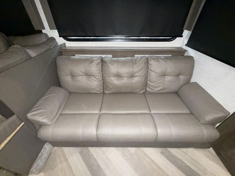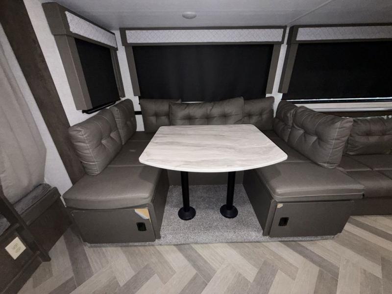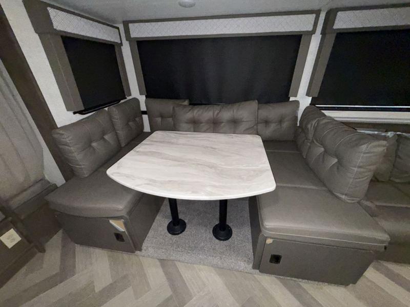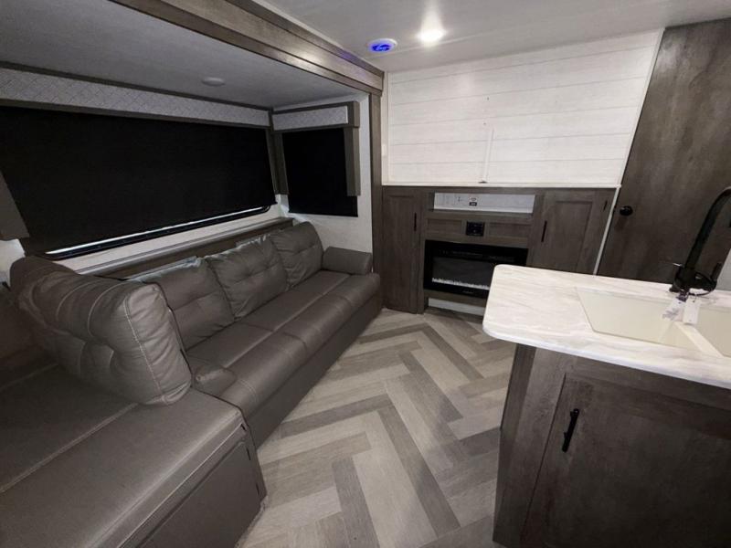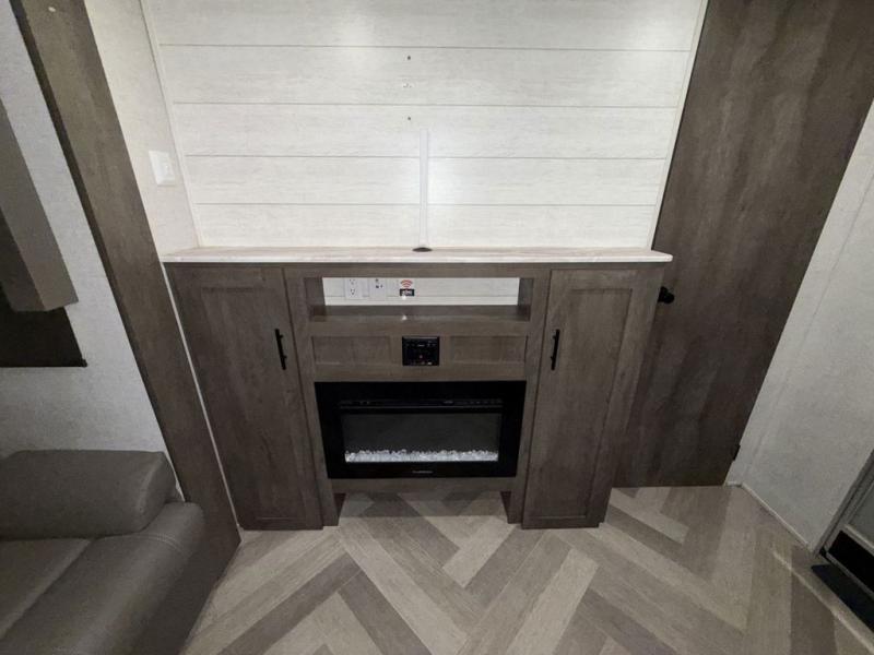 Hit the trails in this single slide out toy hauler for six! You can choose the optional quad bunk system in place of the two sofa sleepers for even more sleeping space. Enjoy the 1,500 lb. patio after you've unloaded your toys from the 11' 3" separate garage, and the walk-through bath will be convenient for everyone. Meals can be prepared on the three burner cooktop, and you can dine around the U-shaped dinette by the fireplace. This model also includes a front RV queen Murphy bed so you can enjoy sleeping space at night and seating space during the day!