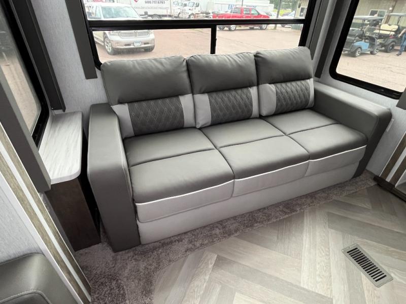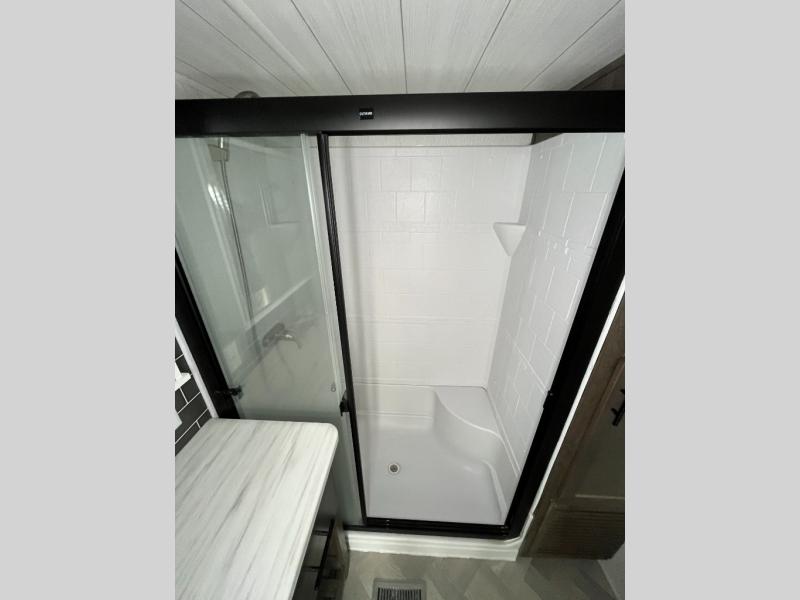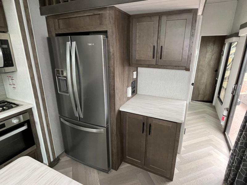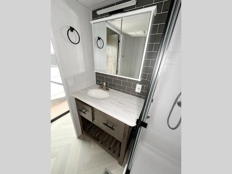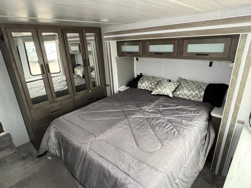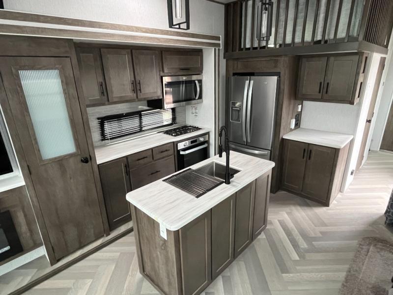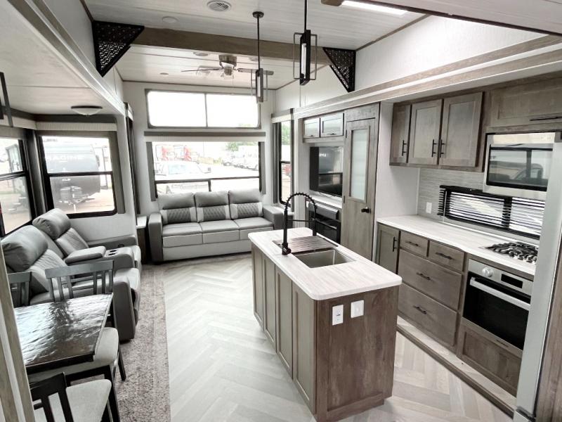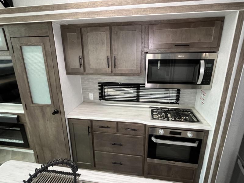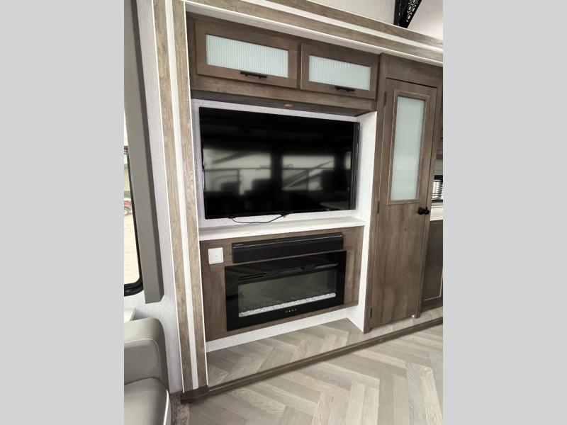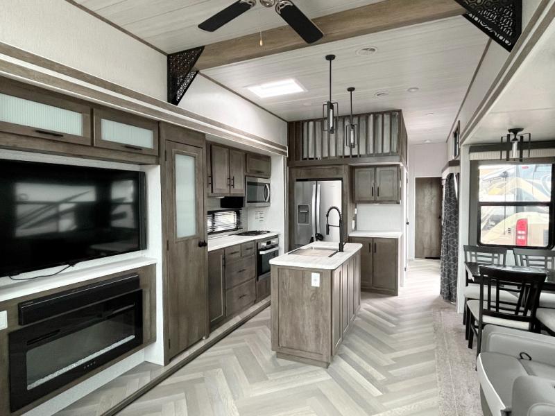 If you just need to get away from the busyness of life and need a little piece of home to escape to, the Forest River Wildwood Grand Lodge destination trailer is your ticket to paradise! The quality construction includes a 12" forged l-beam frame, 5-ply tongue and groove plywood floor decking, bowed truss roof rafters, plus more allowing you to own your trailer for many years to come! The interior is extremely beautiful and spacious with its 96" ceiling, upgraded designer furniture, stainless steel kitchen appliances, and a residential-inspired floating fireplace. The Bluetooth sound bar with a remote will provide endless nights of soothing music, and the ceiling fan in the living room is a residential touch that comes in handy when you don't want to blast the air conditioning to stay cool.