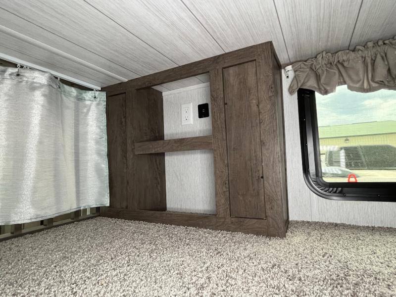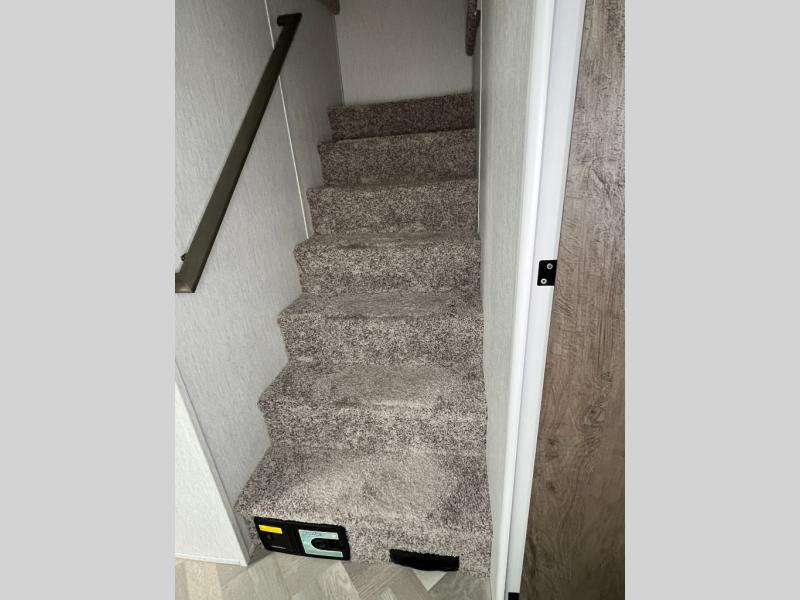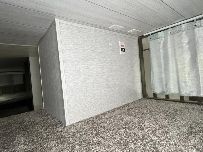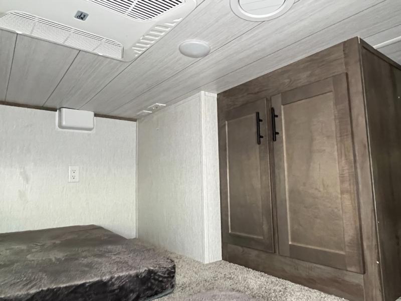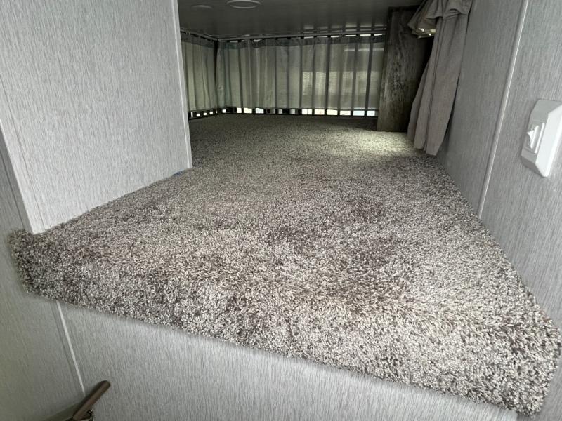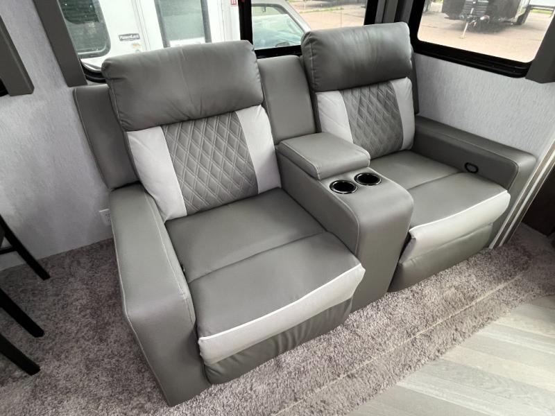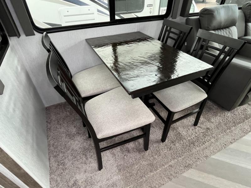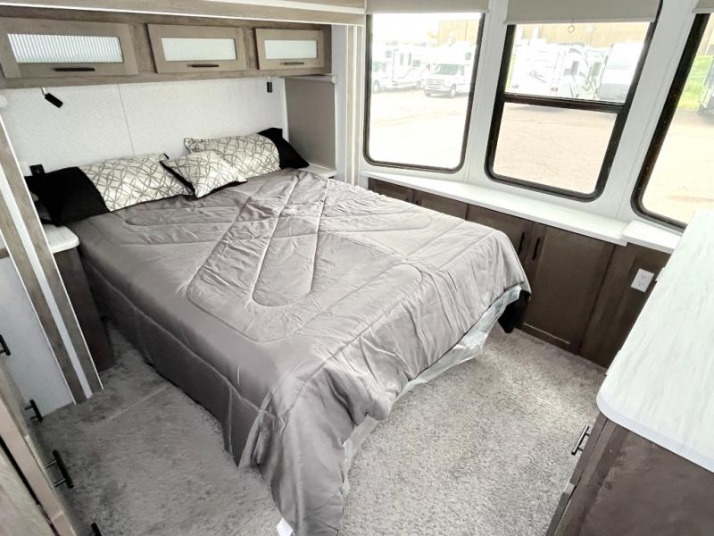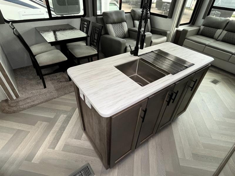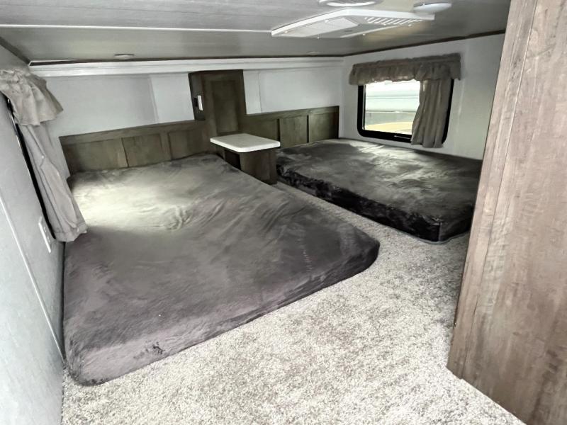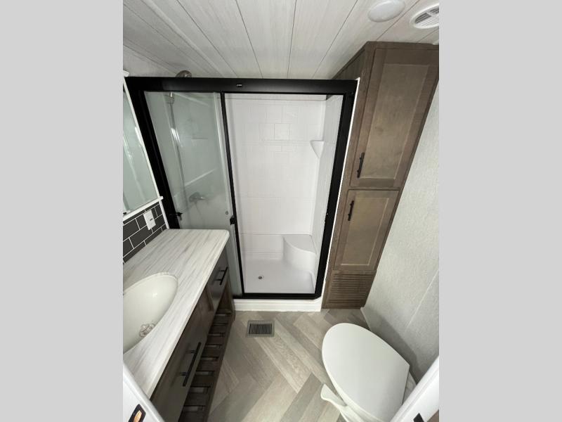 If you just need to get away from the busyness of life and need a little piece of home to escape to, the Forest River Wildwood Grand Lodge destination trailer is your ticket to paradise! The quality construction includes a 12" forged l-beam frame, 5-ply tongue and groove plywood floor decking, bowed truss roof rafters, plus more allowing you to own your trailer for many years to come! The interior is extremely beautiful and spacious with its 96" ceiling, upgraded designer furniture, stainless steel kitchen appliances, and a residential-inspired floating fireplace. The Bluetooth sound bar with a remote will provide endless nights of soothing music, and the ceiling fan in the living room is a residential touch that comes in handy when you don't want to blast the air conditioning to stay cool.