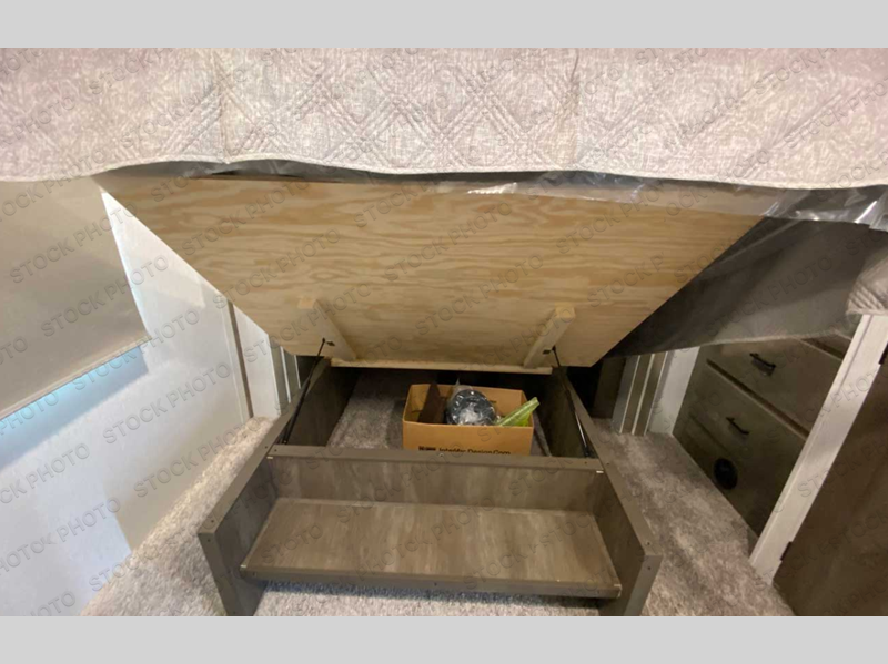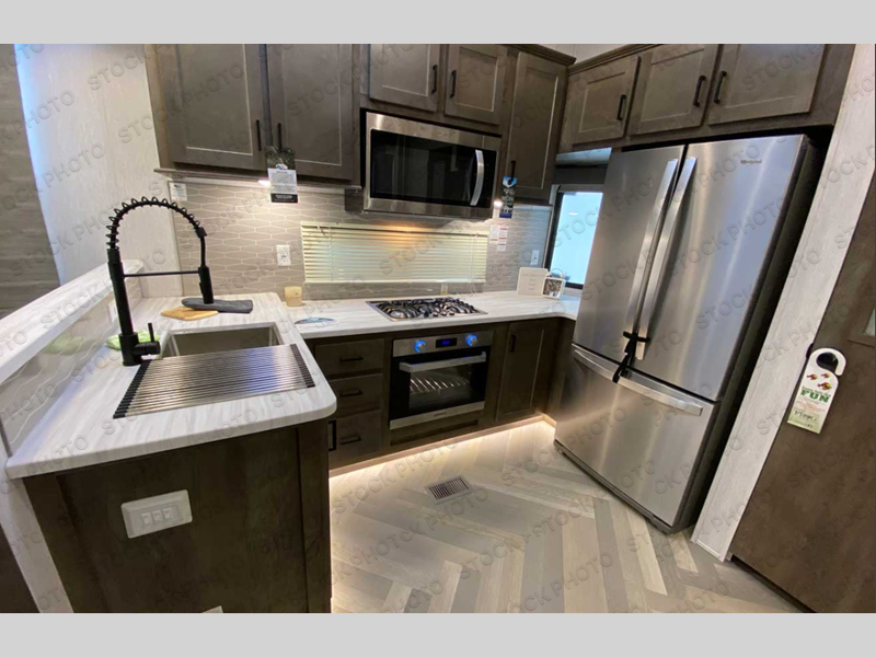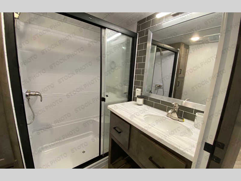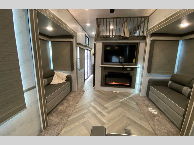 If you just need to get away from the busyness of life and need a little piece of home to escape to, the Forest River Wildwood Grand Lodge destination trailer is your ticket to paradise! The quality construction includes a 12" forged l-beam frame, 5-ply tongue and groove plywood floor decking, bowed truss roof rafters, plus more allowing you to own your trailer for many years to come! The interior is extremely beautiful and spacious with its 96" ceiling, upgraded designer furniture, stainless steel kitchen appliances, and a residential-inspired floating fireplace. The Bluetooth sound bar with a remote will provide endless nights of soothing music, and the ceiling fan in the living room is a residential touch that comes in handy when you don't want to blast the air conditioning to stay cool.