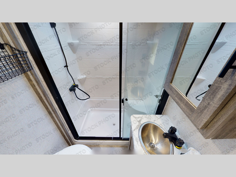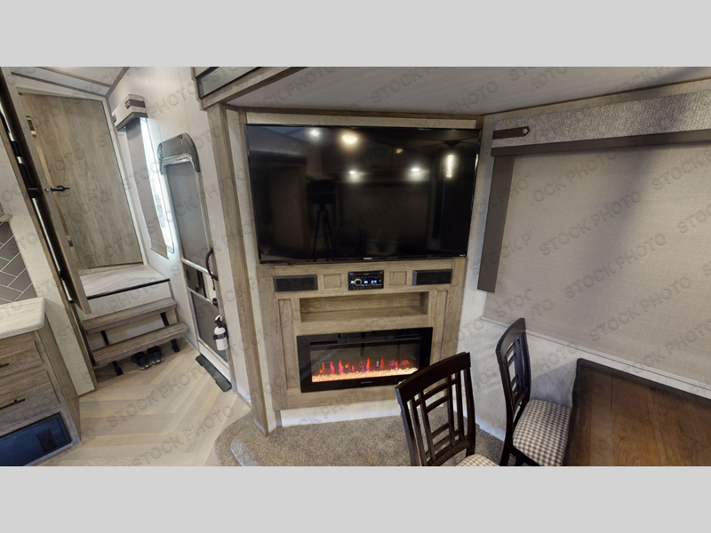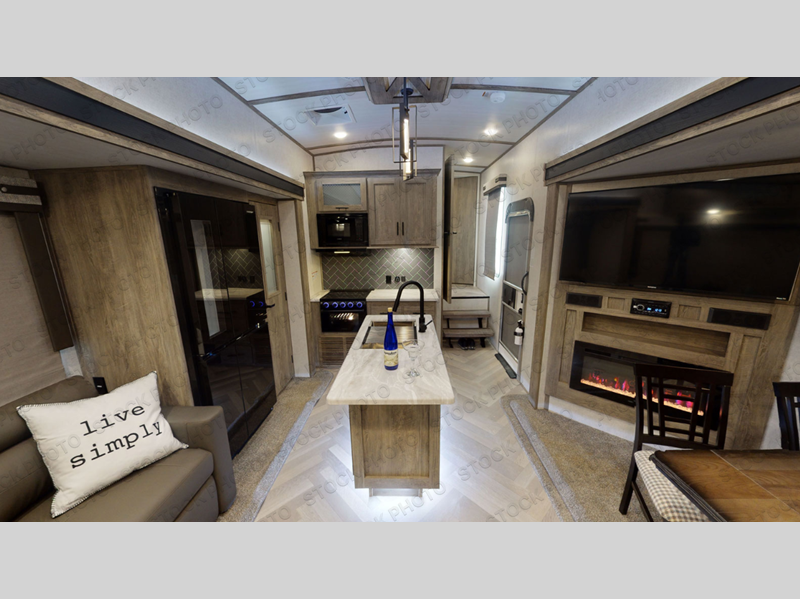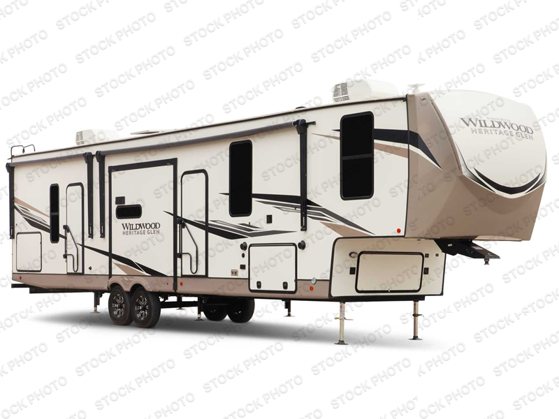 Whether you enjoy being outside or inside, this Wildwood Heritage Glen fifth wheel gives you the best of both! Imagine relaxing in a chair or on the tri-fold sofa and being able to look out panoramic windows at the scenery. Or, you might like to watch a show on the 50" LED TV with fireplace below, and you can dine at the free-standing dinette that allows you to move the chairs if needed. The 14-cubic foot French door refrigerator next to the pantry will allow you to stock up on ingredients and cold beverages for a long trip, and you will appreciate the custom king bed slide and the residential walk-in shower with a seat after being outside all day, even if just under the 13' awning. There is plenty of storage in the master bedroom and throughout, plus the Texas-size pass-through compartment will surely come in handy for your charcoal, outdoor games, and such.