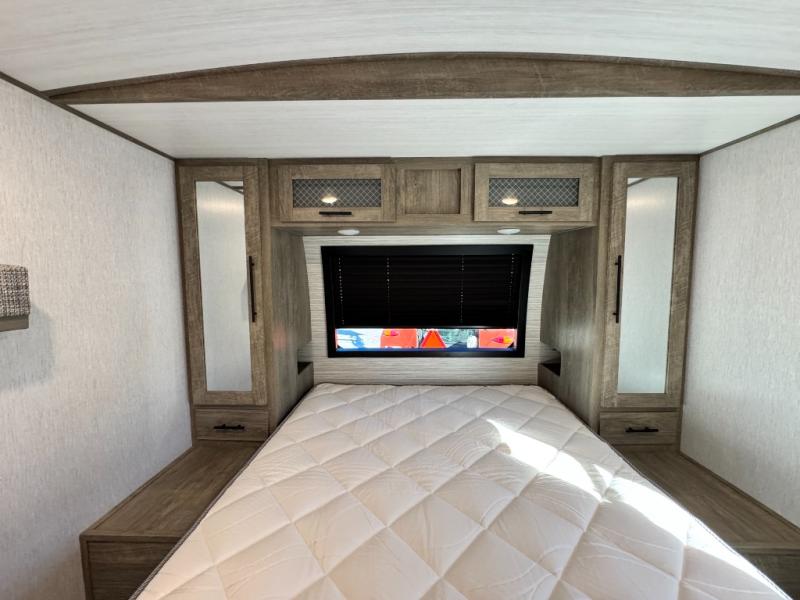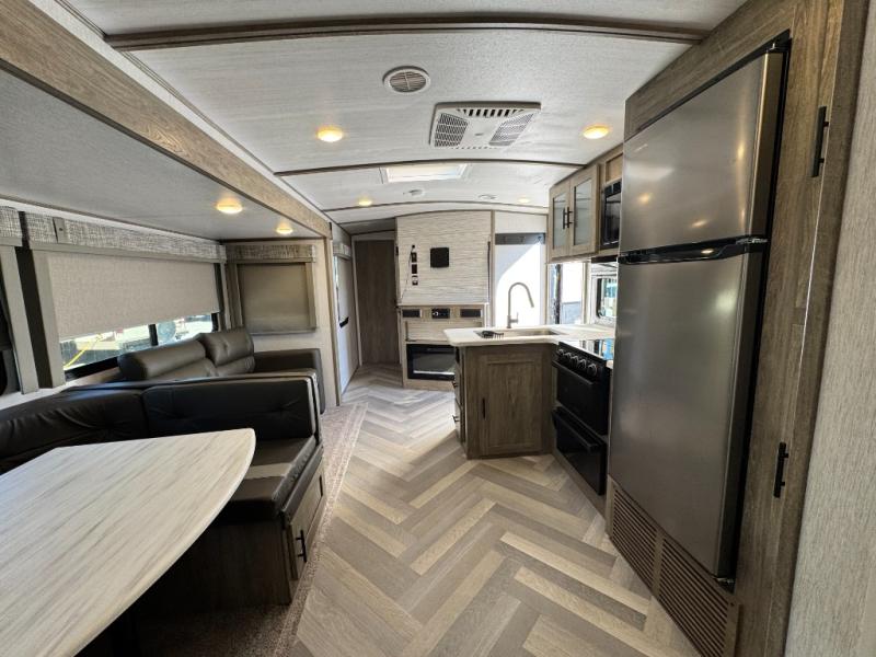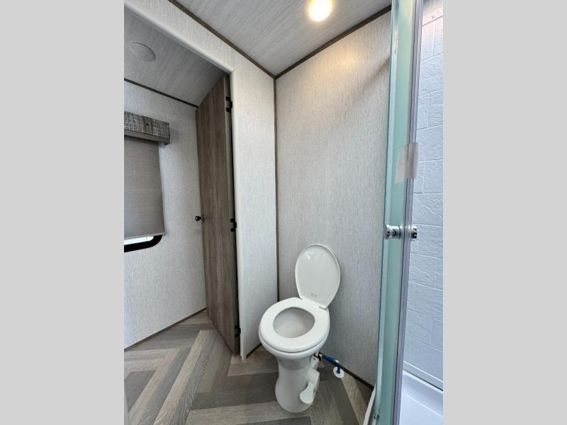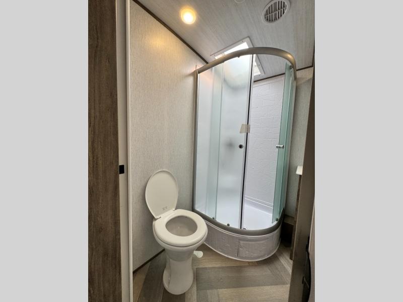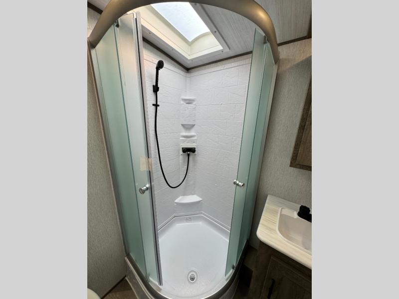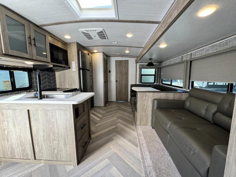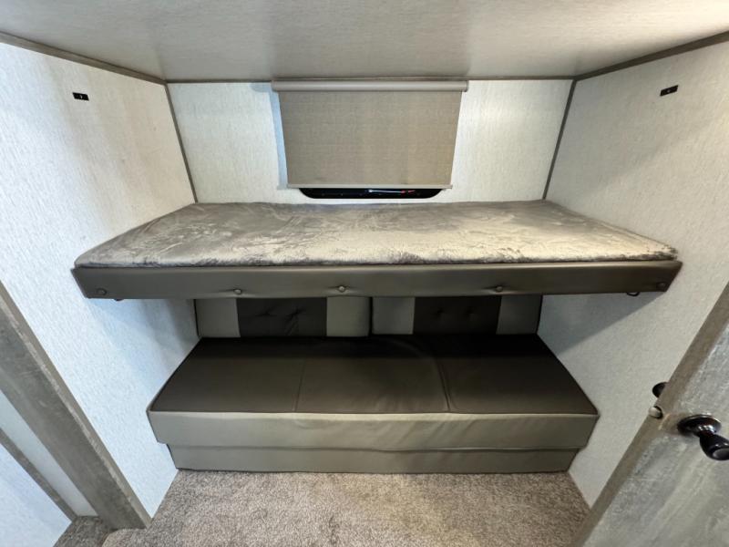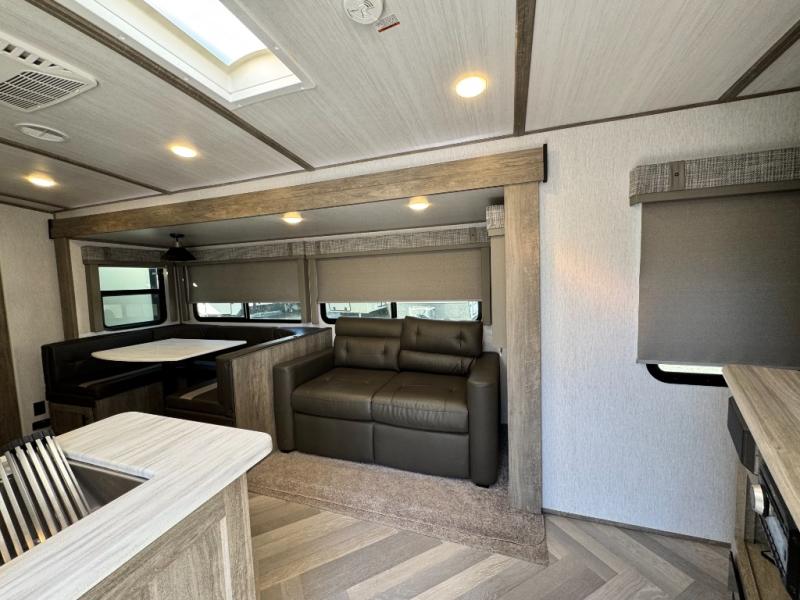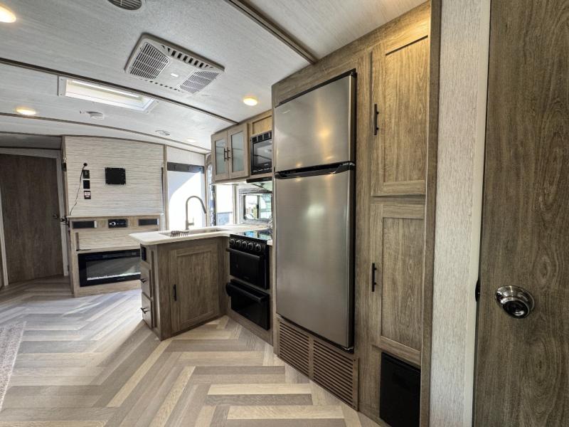 This camper is the ultimate multi-room apartment on wheels. It features a private rear bunkhouse with its own half-bath, making it perfect for kids or guests. The living area boasts cathedral ceilings, a custom herringbone floor, and a 50" LED TV with a fireplace. The kitchen is equipped with a residential refrigerator and solid surface countertops. Plus, with the VIP Package, you get upgrades like XL max-tint panoramic windows and 12V heat pads on all holding tanks for extended season camping.