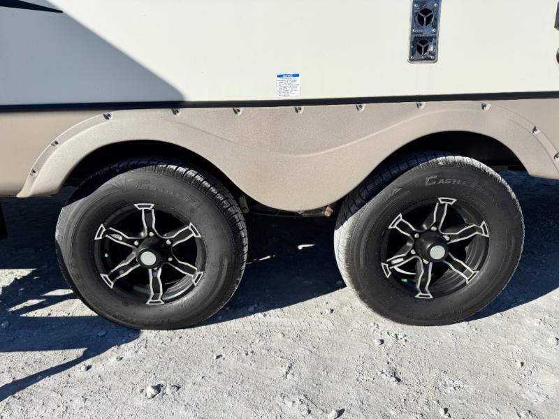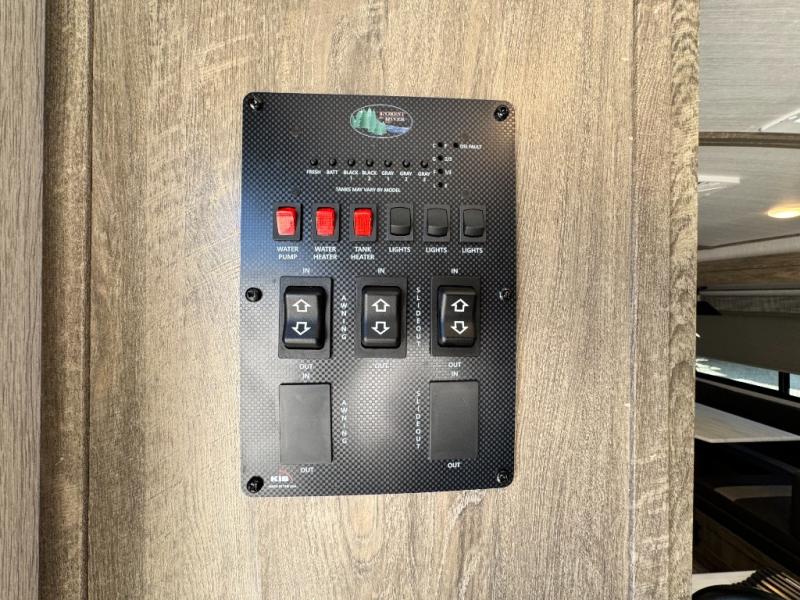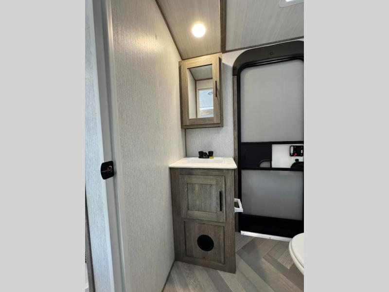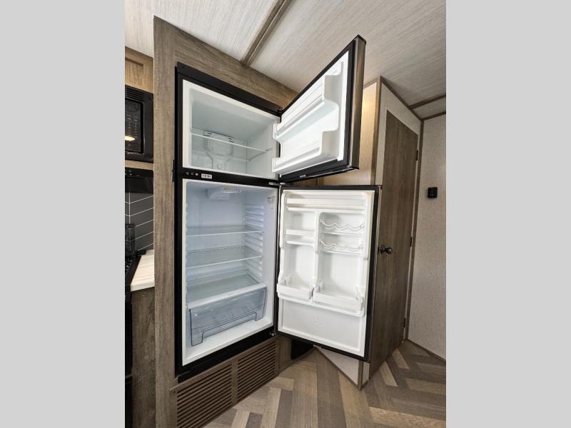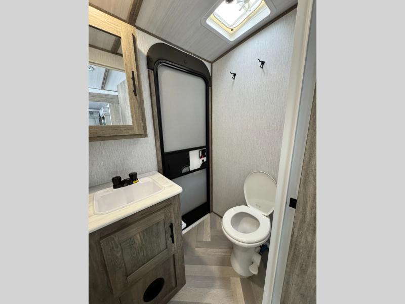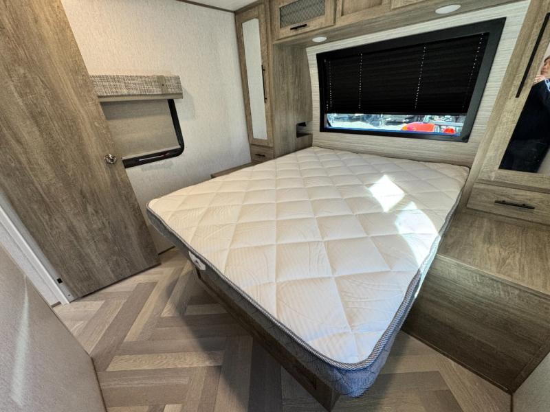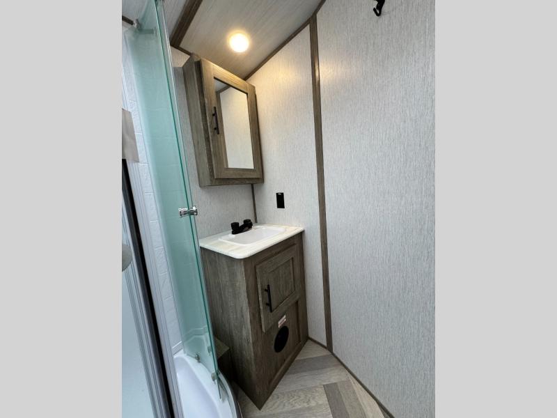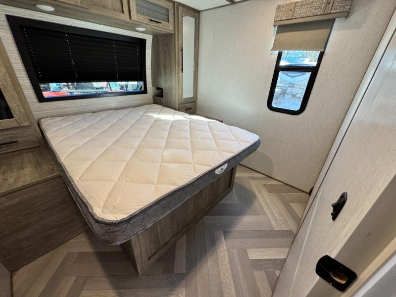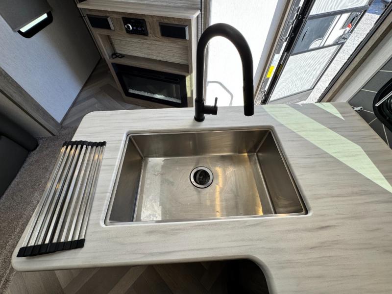This camper is the ultimate multi-room apartment on wheels. It features a private rear bunkhouse with its own half-bath, making it perfect for kids or guests. The living area boasts cathedral ceilings, a custom herringbone floor, and a 50" LED TV with a fireplace. The kitchen is equipped with a residential refrigerator and solid surface countertops. Plus, with the VIP Package, you get upgrades like XL max-tint panoramic windows and 12V heat pads on all holding tanks for extended season camping.
