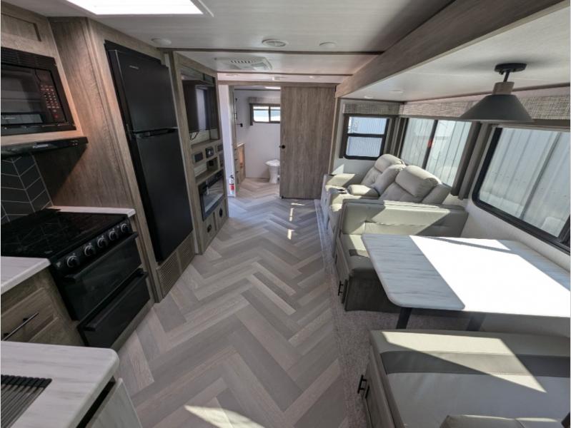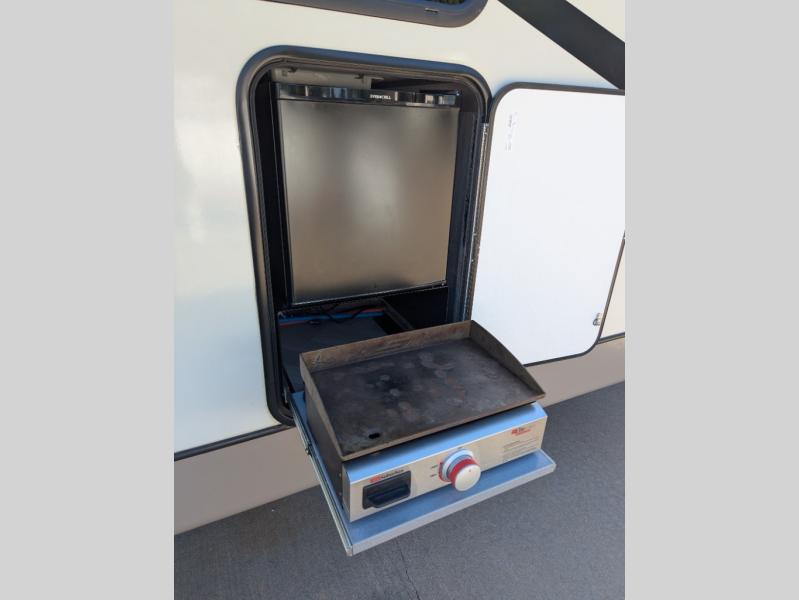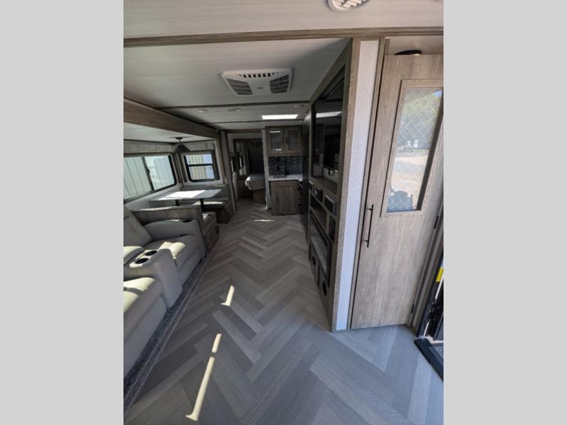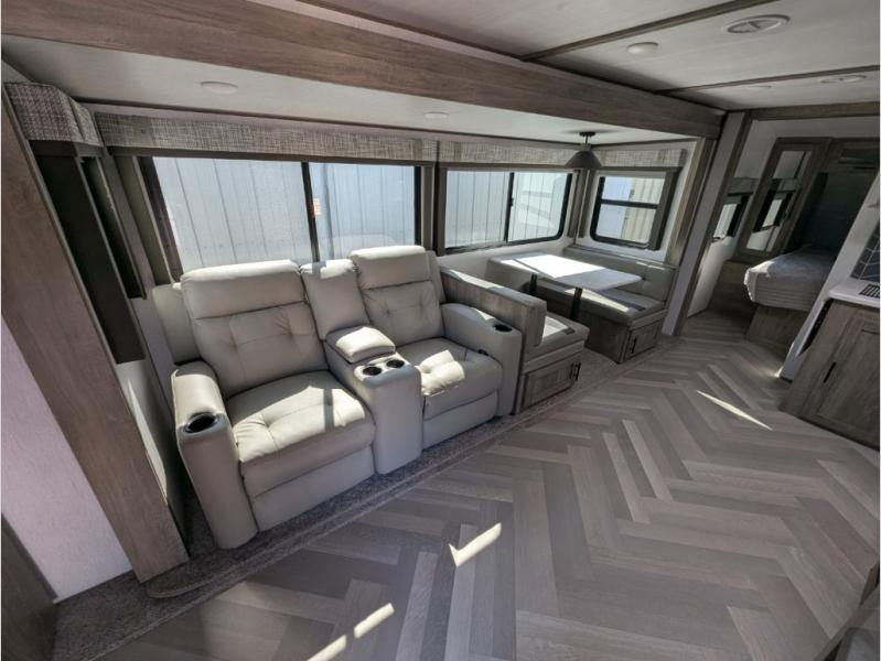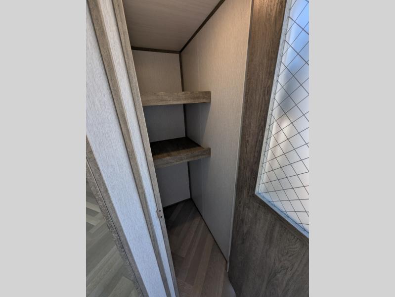 Whether it's a couples night or family night, you can enjoy the spacious living and kitchen area thanks to the slide out. Grab your favorite snacks from the walk-in pantry/closet and head to the booth dinette and/or the theatre seats with cupholders across from the entertainment center which also features a fireplace. You will be able to easily whip up your best meals and clean up even easier with lots of room on the L-shaped countertop. The front private bedroom features a queen bed for you to get a good night's rest with mirrored wardrobes on either side, and the rear bathroom is spacious with a sliding door, plus includes a wardrobe and linen closet and more!
