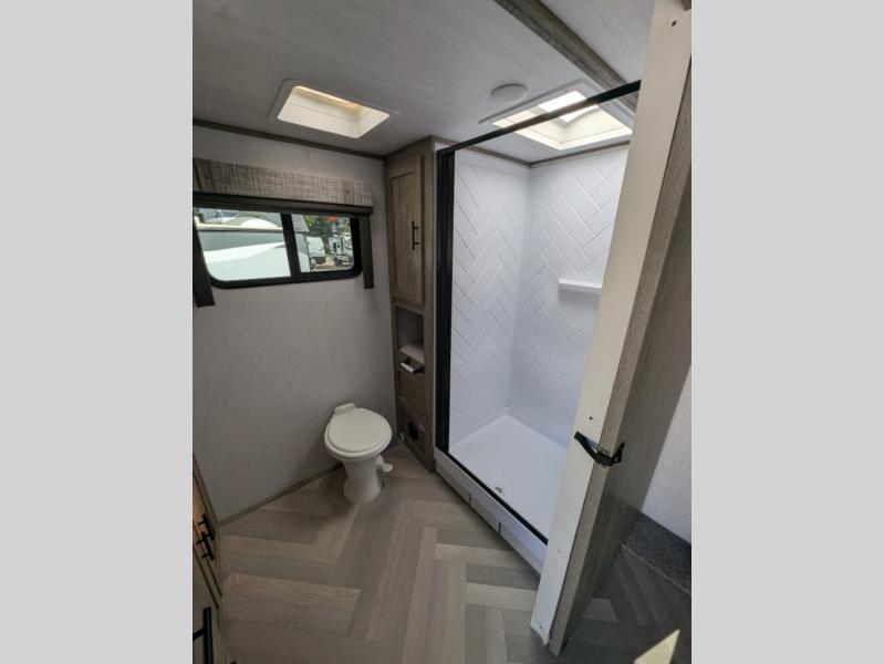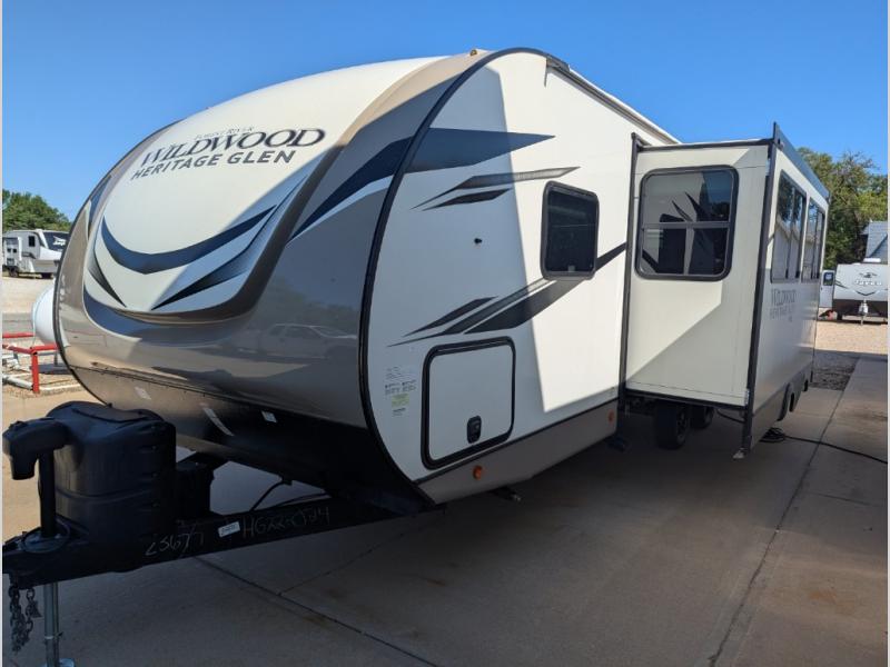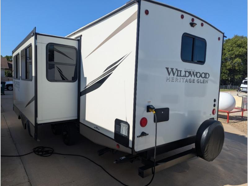 The Wildwood Heritage Glen Hyper-Lyte travel trailer by Forest River offers stability with a wide stance axle system, easy setup with a power tongue jack with LED docking light, and safe entry with the Step Above aluminum entry steps plus the XL Lend-a-Hand entry grab handle to the main entrance. The XL Max-Tint panoramic window(s) in the main slide bring the outside inside, plus the kitchen offers a recessed glass stove top cover, a Midnight glass range hood and microwave, plus more. You will also find a back-up camera prep and roof-mounted solar panel already installed! There is so much more to love about this Heritage Glen travel trailers - make it yours today!