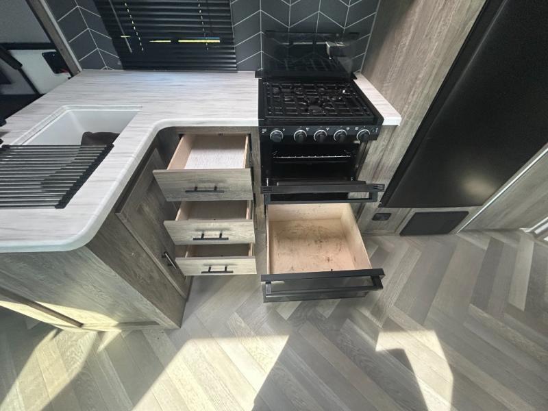 Dual entry allows your bigger family or friend group quick access to the bathroom, or the main living and kitchen area when loading up for your trip and having fun outside. You will find sleeping space for ten when you utilize the furniture for extra sleeping space. There is plenty of storage for your linens, clothes, dishes and food, plus the Texas-sized pass-through compartment allows you to stow away camping chairs, fishing poles, charcoal and such. The L-shaped kitchen offers plenty of room to cook while everyone is moving about, or you can make a few meals on the outside kitchen/bar in the great outdoors. You will also have your own private bedroom up front while the kids or your friends sleep on the double size bunks or the furniture once set up for bedtime. And the 32" LED TV and fireplace will be popular on those chilly nights.