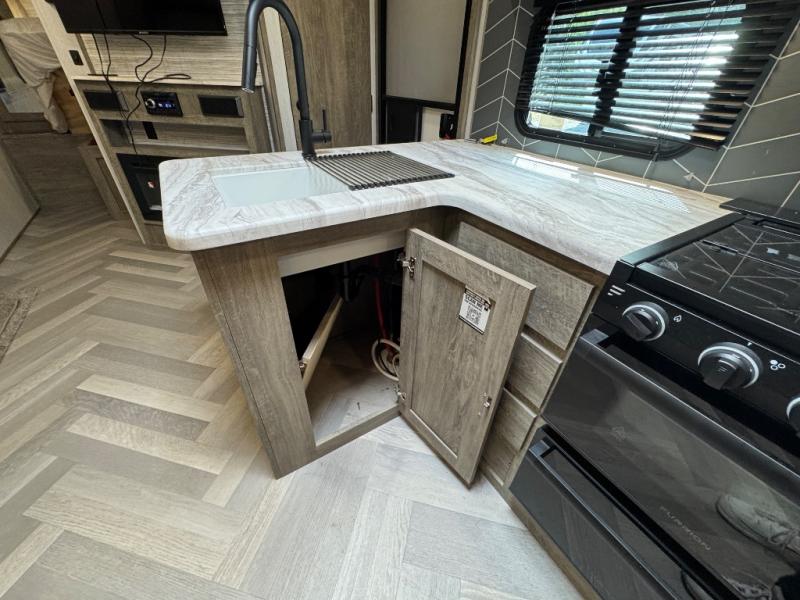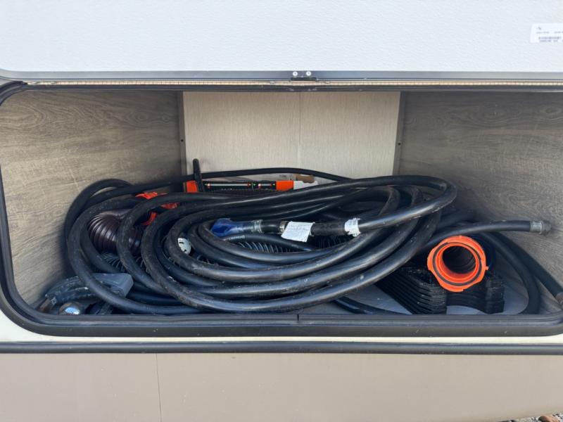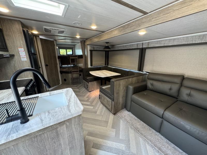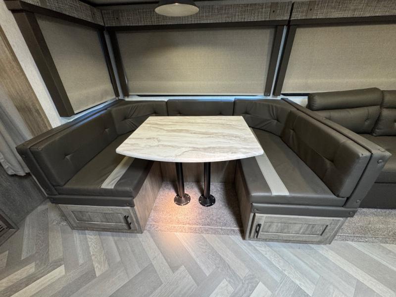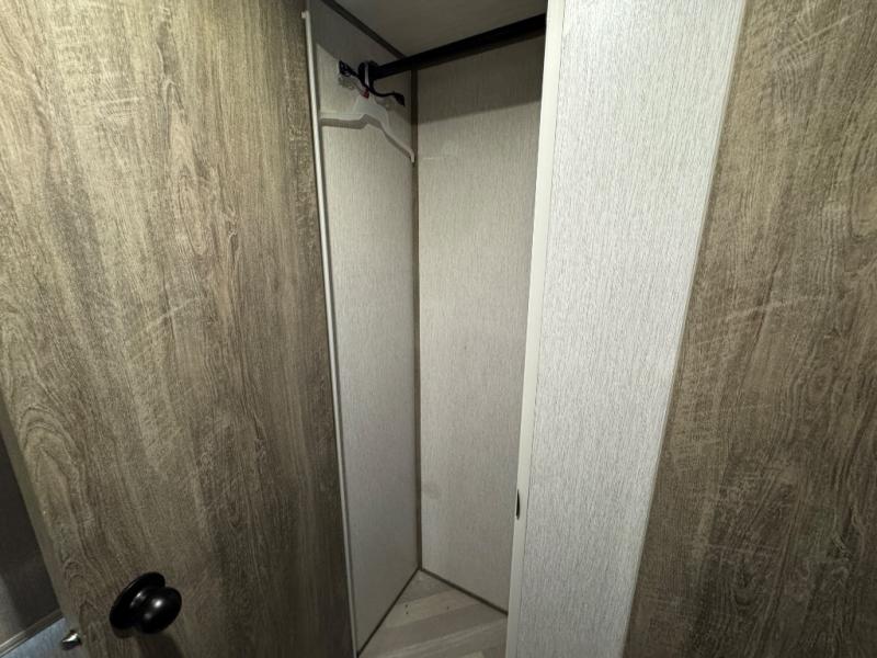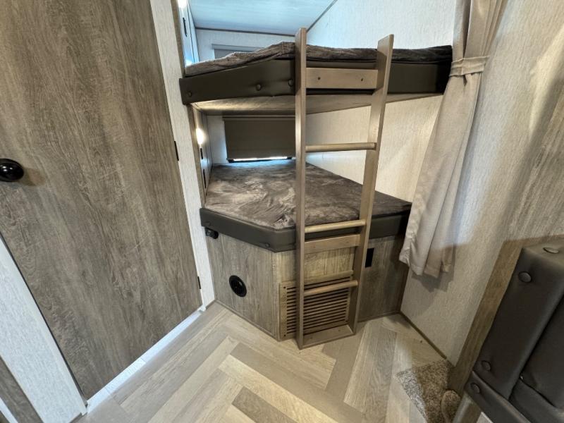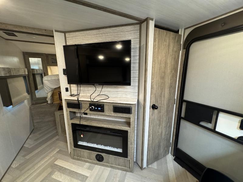 Dual entry allows your bigger family or friend group quick access to the bathroom, or the main living and kitchen area when loading up for your trip and having fun outside. You will find sleeping space for ten when you utilize the furniture for extra sleeping space. There is plenty of storage for your linens, clothes, dishes and food, plus the Texas-sized pass-through compartment allows you to stow away camping chairs, fishing poles, charcoal and such. The L-shaped kitchen offers plenty of room to cook while everyone is moving about, or you can make a few meals on the outside kitchen/bar in the great outdoors. You will also have your own private bedroom up front while the kids or your friends sleep on the double size bunks or the furniture once set up for bedtime. And the 32" LED TV and fireplace will be popular on those chilly nights.