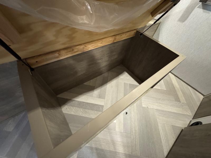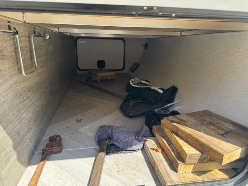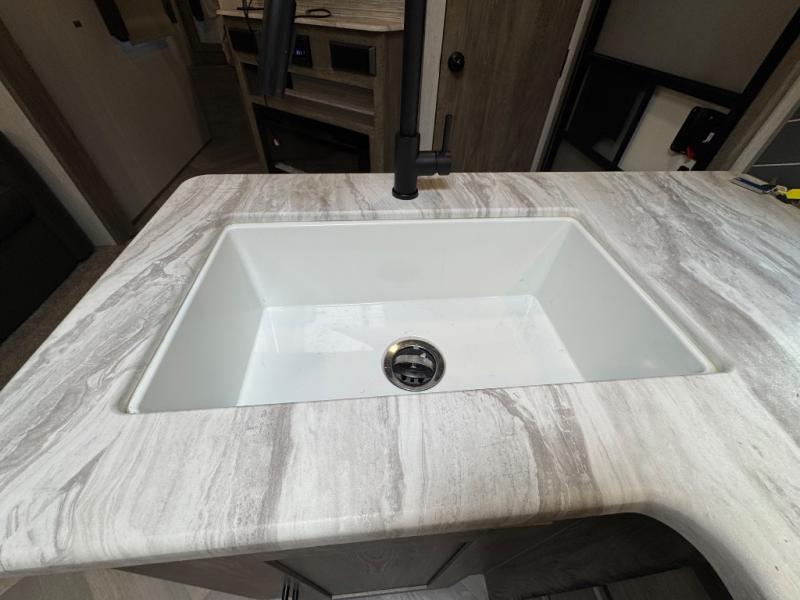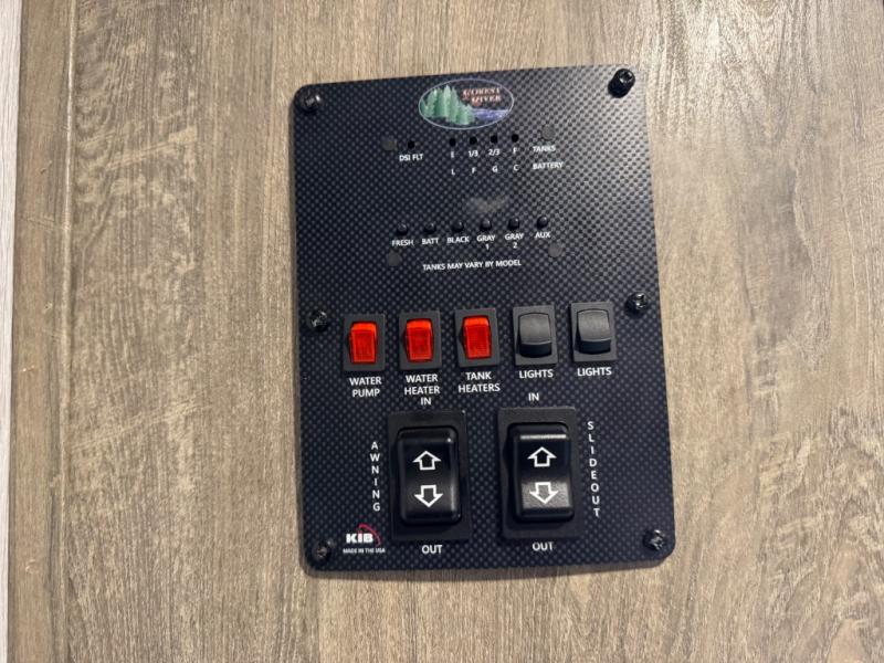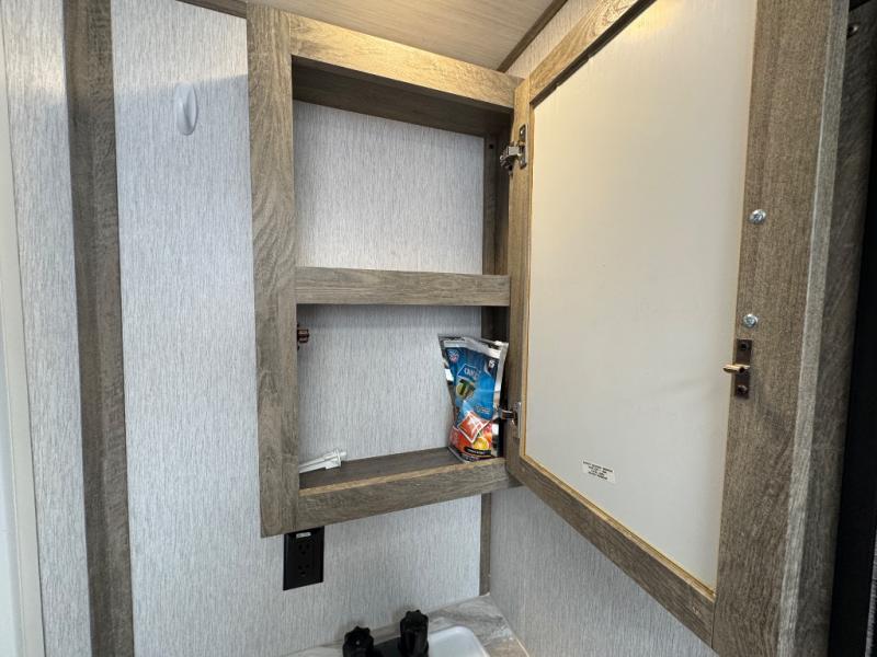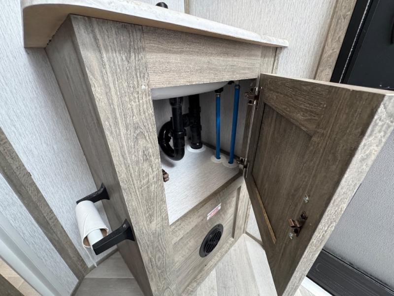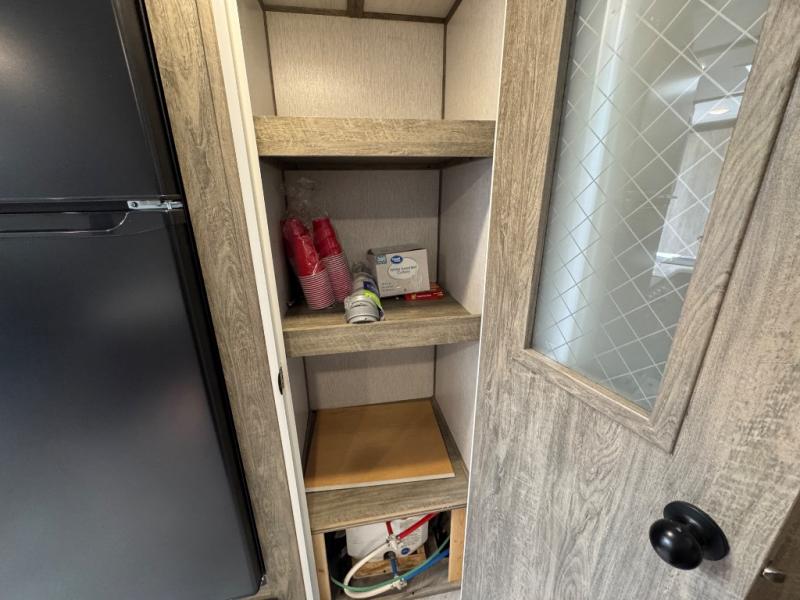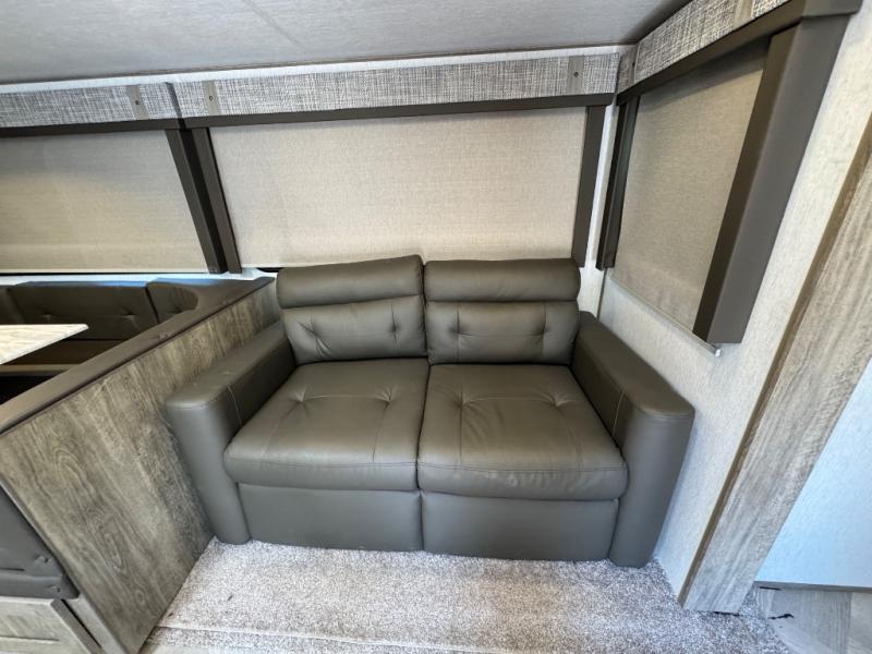 Dual entry allows your bigger family or friend group quick access to the bathroom, or the main living and kitchen area when loading up for your trip and having fun outside. You will find sleeping space for ten when you utilize the furniture for extra sleeping space. There is plenty of storage for your linens, clothes, dishes and food, plus the Texas-sized pass-through compartment allows you to stow away camping chairs, fishing poles, charcoal and such. The L-shaped kitchen offers plenty of room to cook while everyone is moving about, or you can make a few meals on the outside kitchen/bar in the great outdoors. You will also have your own private bedroom up front while the kids or your friends sleep on the double size bunks or the furniture once set up for bedtime. And the 32" LED TV and fireplace will be popular on those chilly nights.