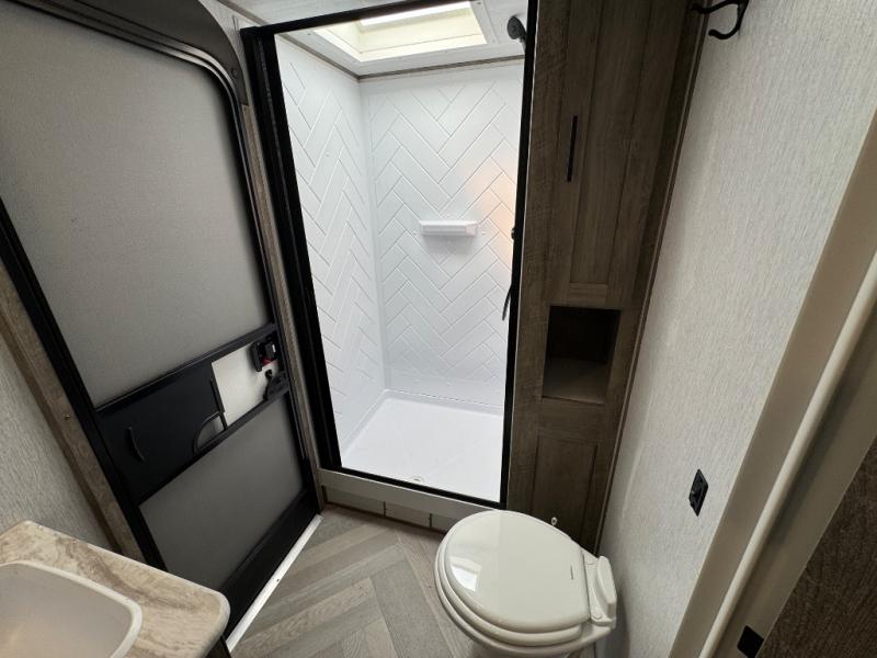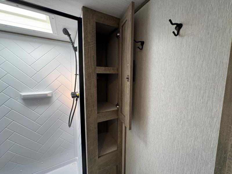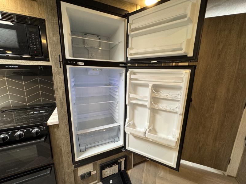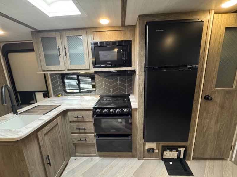 The Wildwood Heritage Glen Hyper-Lyte travel trailer by Forest River offers stability with a wide stance axle system, easy setup with a power tongue jack with LED docking light, and safe entry with the Step Above aluminum entry steps plus the XL Lend-a-Hand entry grab handle to the main entrance. The XL Max-Tint panoramic window(s) in the main slide bring the outside inside, plus the kitchen offers a recessed glass stove top cover, a Midnight glass range hood and microwave, plus more. You will also find a back-up camera and roof-mounted solar panel prep. There is so much more to love about these travel trailers, choose your favorite today!