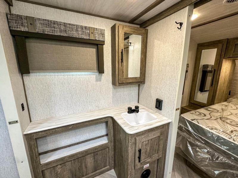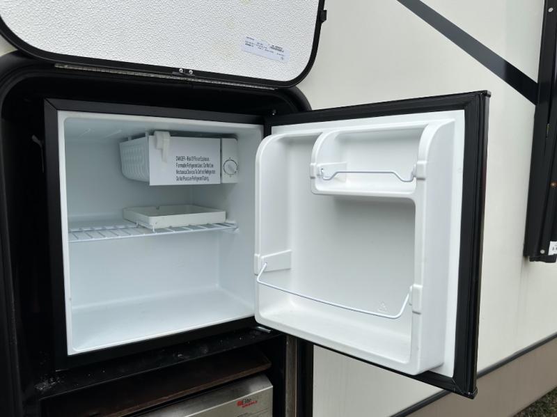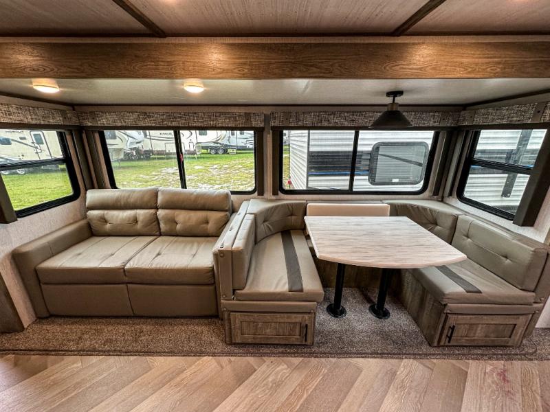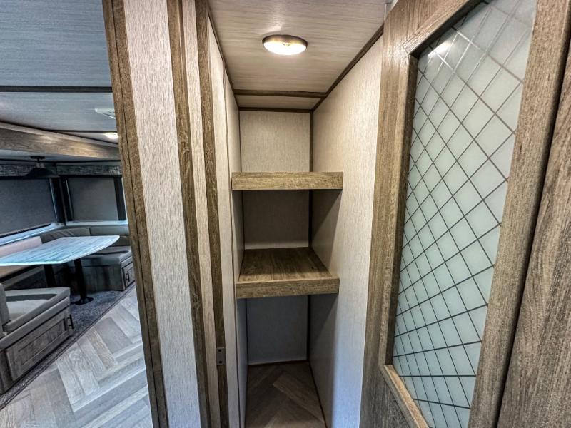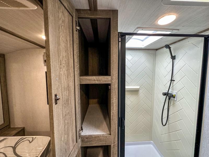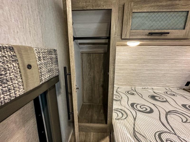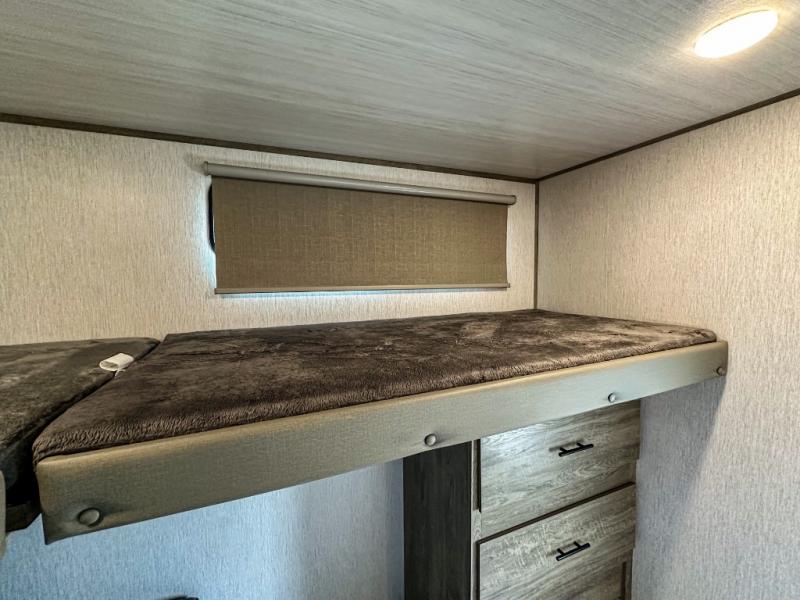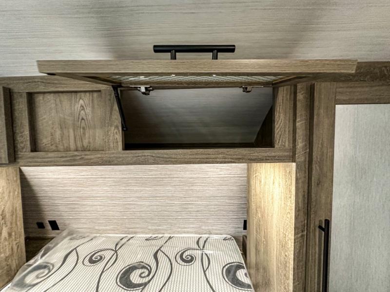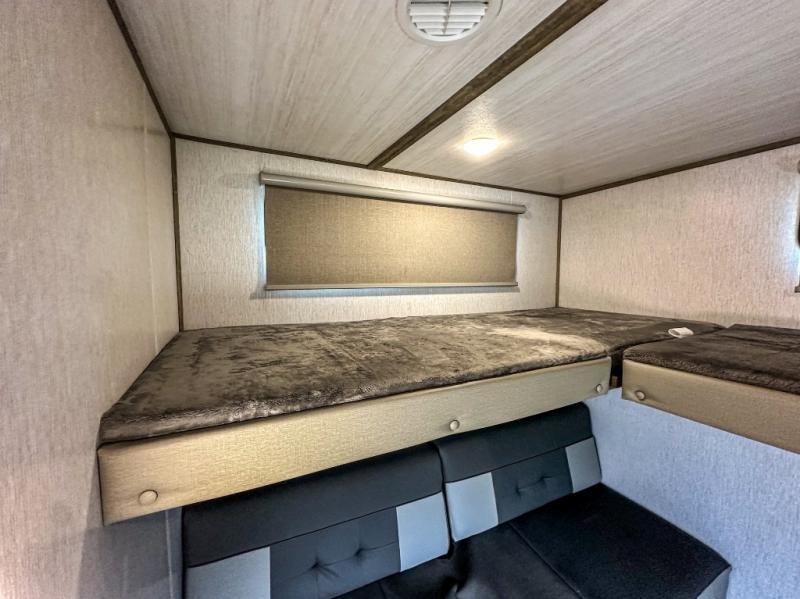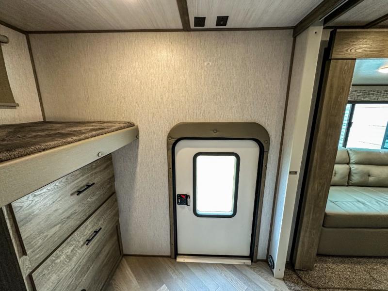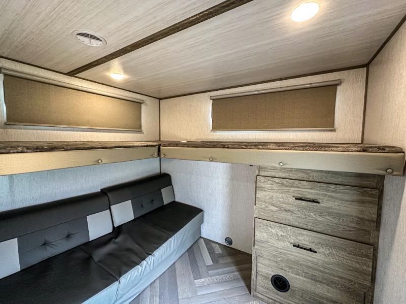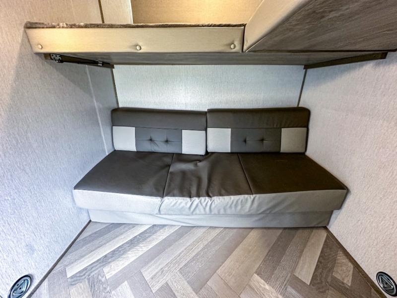 Load up your gear easily with the bike-sized cargo door with access to the bunkhouse, and the exterior Texas-sized pass-through compartment! The cook will appreciate all the appliances in the L-shaped kitchen plus the countertop extension, the residential refrigerator and the pantry/closet. Everyone can play games and dine at the family-sized U-shaped dinette or while sitting on the tri-fold sofa, or maybe outside under the awning with LED lights. You will also enjoy the two upper bunks and the 60" x 74" Versa queen convertible bed/sofa with sleeping for four in the bunkhouse, privacy in the master bedroom which includes cabinets and wardrobes, plus the large panoramic windows to enjoy the outdoors while relaxing indoors.