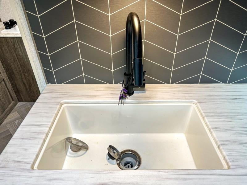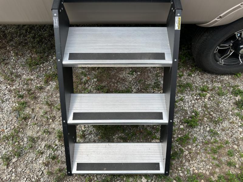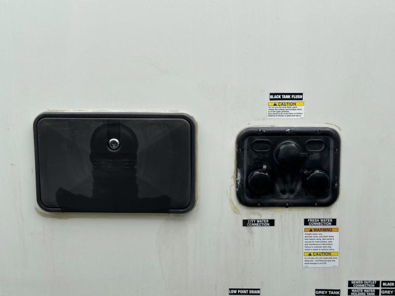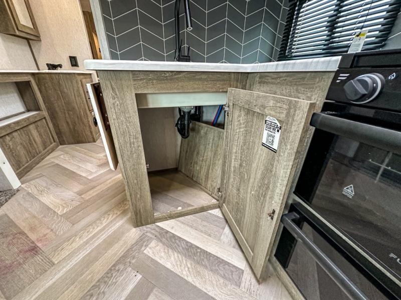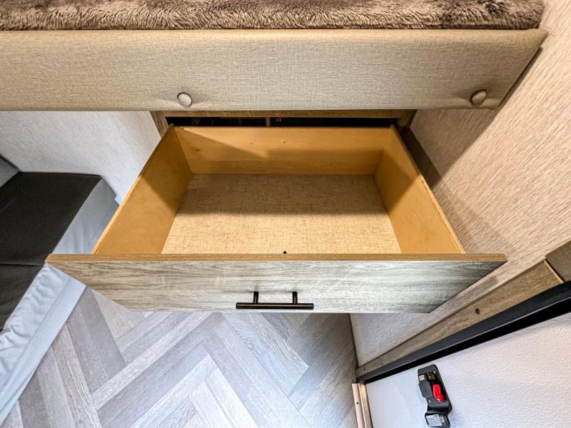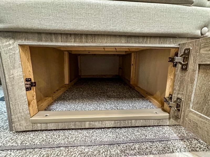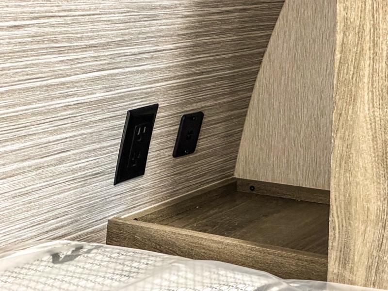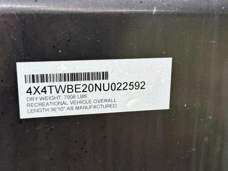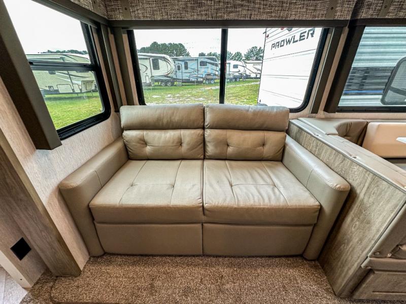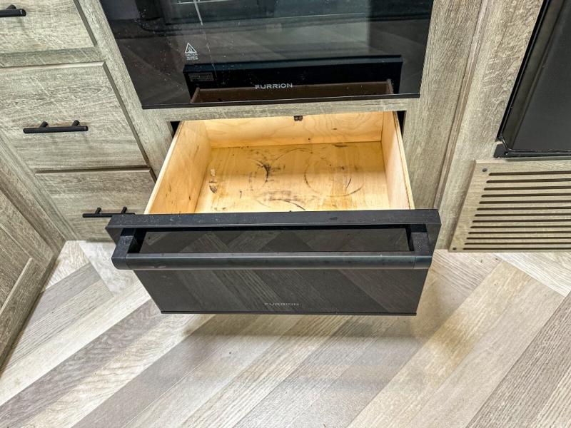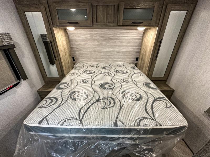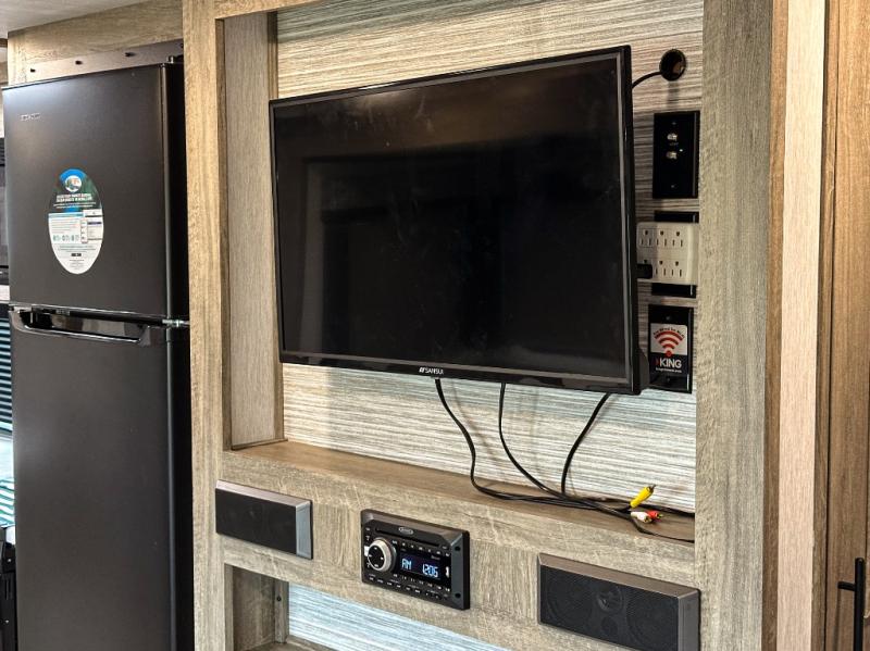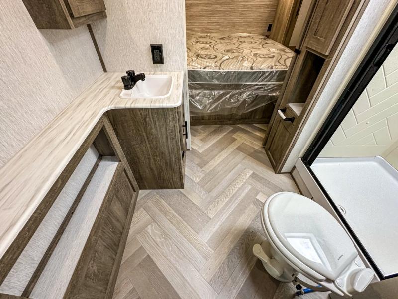 Load up your gear easily with the bike-sized cargo door with access to the bunkhouse, and the exterior Texas-sized pass-through compartment! The cook will appreciate all the appliances in the L-shaped kitchen plus the countertop extension, the residential refrigerator and the pantry/closet. Everyone can play games and dine at the family-sized U-shaped dinette or while sitting on the tri-fold sofa, or maybe outside under the awning with LED lights. You will also enjoy the two upper bunks and the 60" x 74" Versa queen convertible bed/sofa with sleeping for four in the bunkhouse, privacy in the master bedroom which includes cabinets and wardrobes, plus the large panoramic windows to enjoy the outdoors while relaxing indoors.
