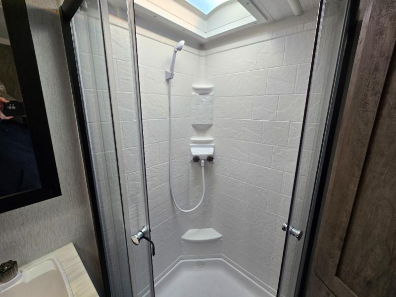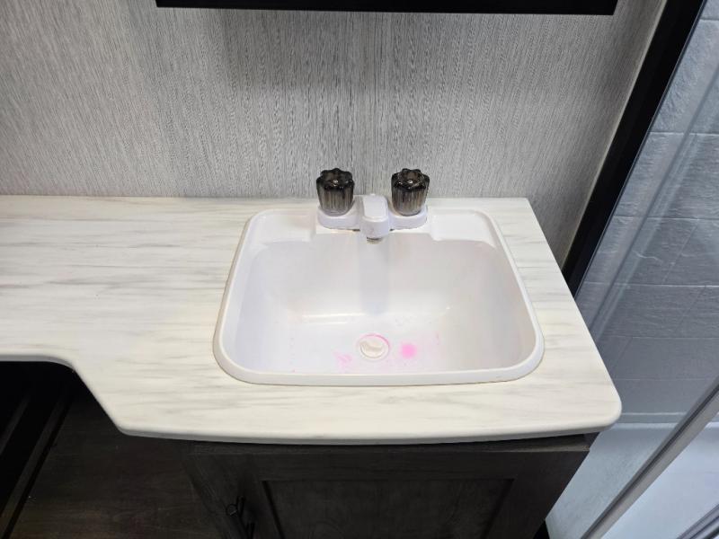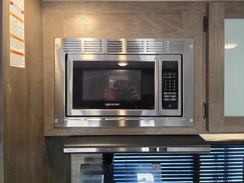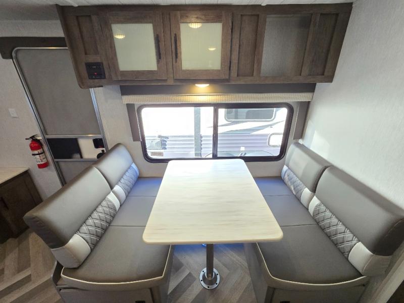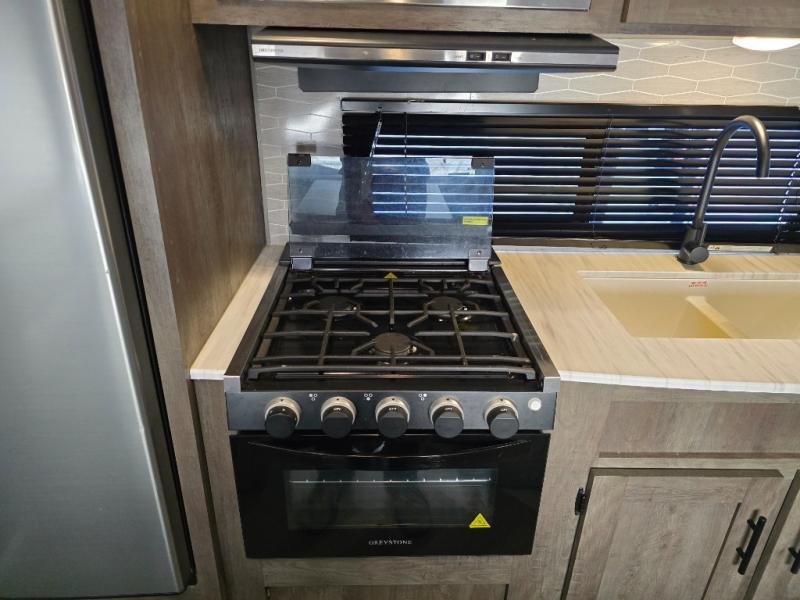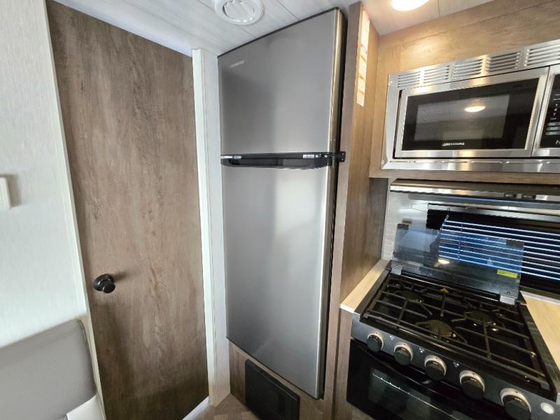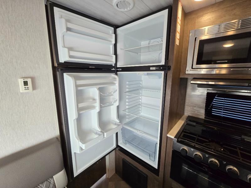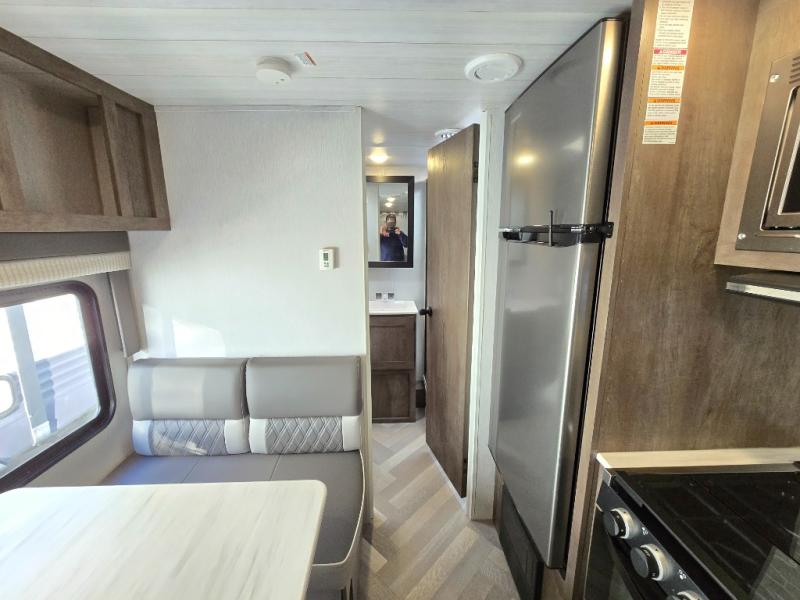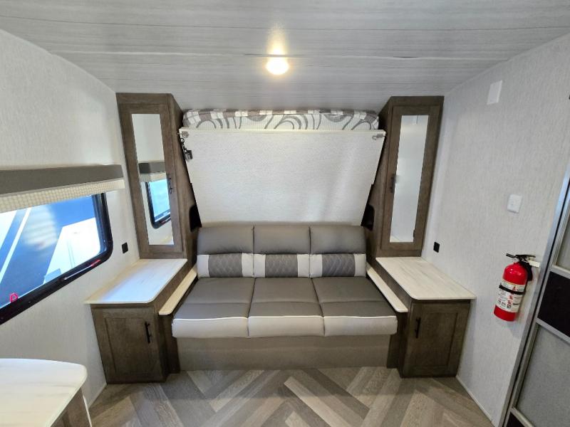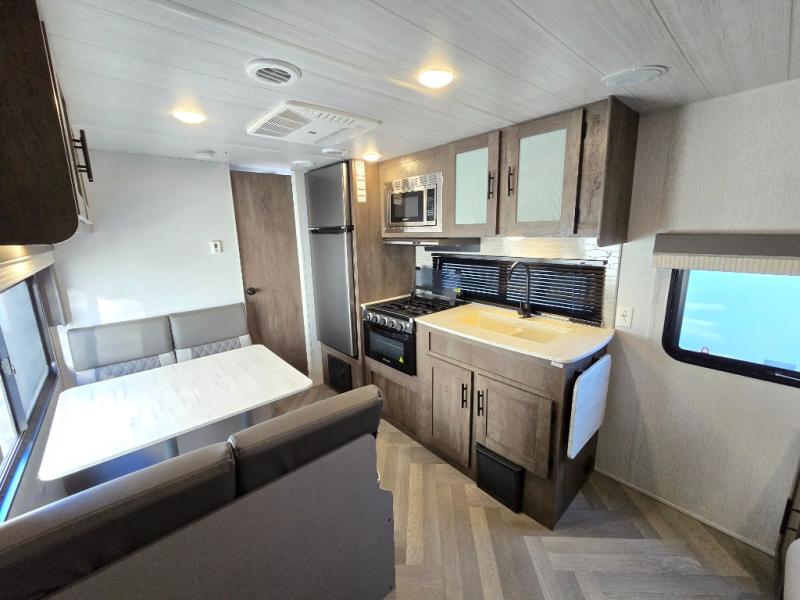 This Wildwood X-Lite travel trailer is a lightweight unit that offers you a spacious rear bathroom with a residential vanity so that you can stay comfortable while you get clean! You will appreciate the fact that you can fold away the bed in this trailer to reveal a Jiffy sofa for afternoon relaxation, and the booth dinette is another piece of furniture that you can use for settling in with a good book and a hot cup of coffee. The seamless countertops in the kitchen are both stylish and functional, and the microwave and three-burner cooktop will help you prepare a meal any time of the day.