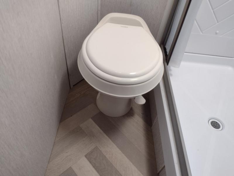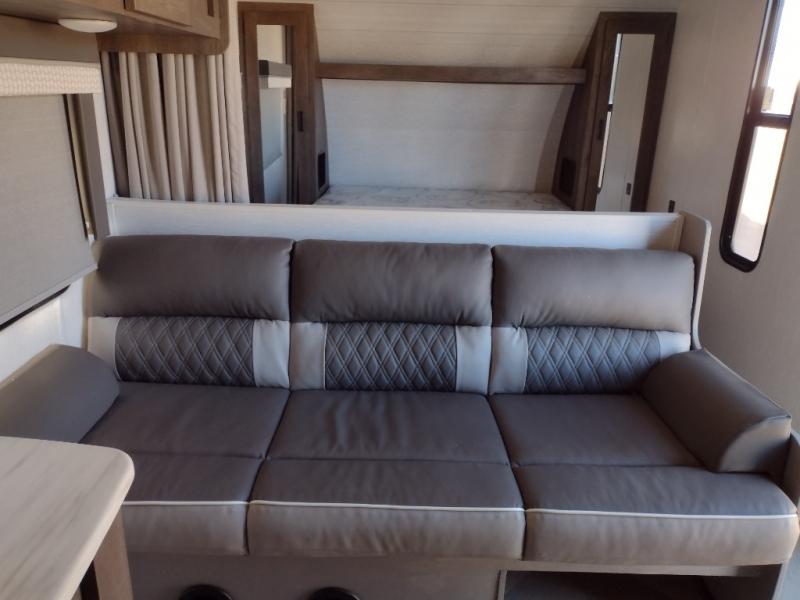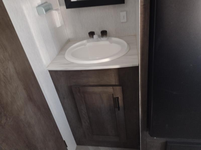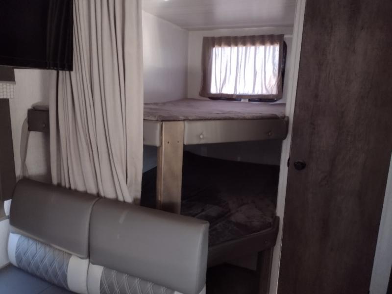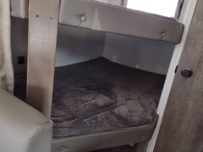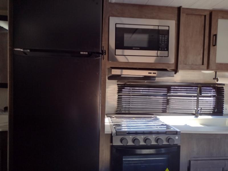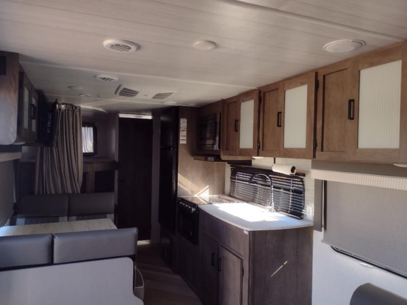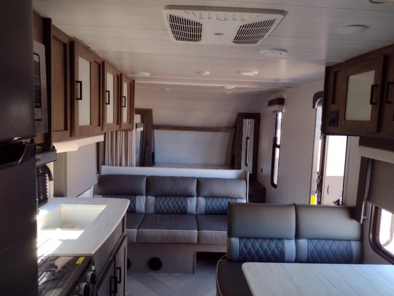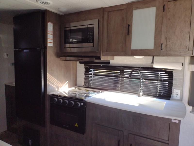 This Wildwood X-Lite travel trailer is packed with features! There is a queen-size bed up at the front that can be sectioned off from the rest of the trailer with a privacy curtain, and the double-size bunks in the back of this trailer will provide you with a compact sleeping space for your little ones. The booth dinette is going to be a great place to sit down together and have a meal when the bugs are too bad outside to sit at the picnic table, and there is also a sofa for relaxation while inside. You will also appreciate the look and function of the seamless countertops in the kitchen, and the 6 cu. ft. refrigerator will easily keep your perishable items fresh.