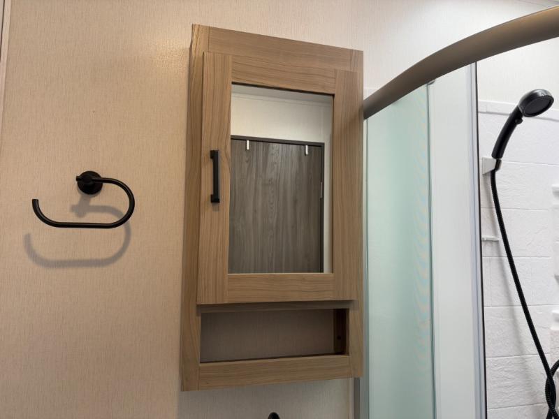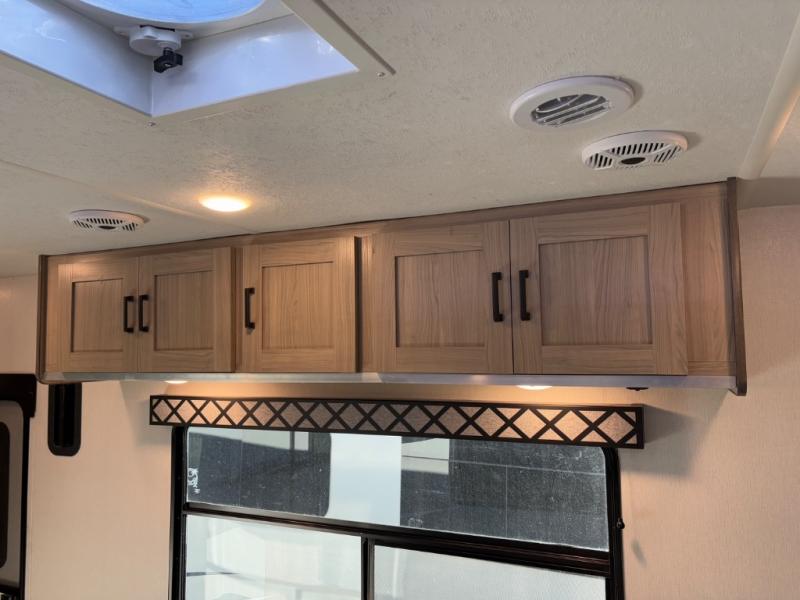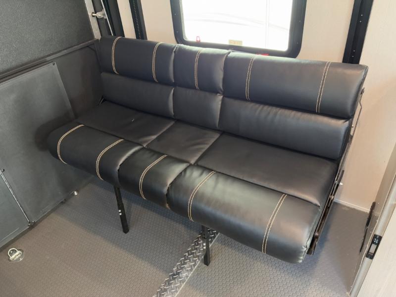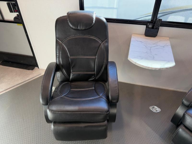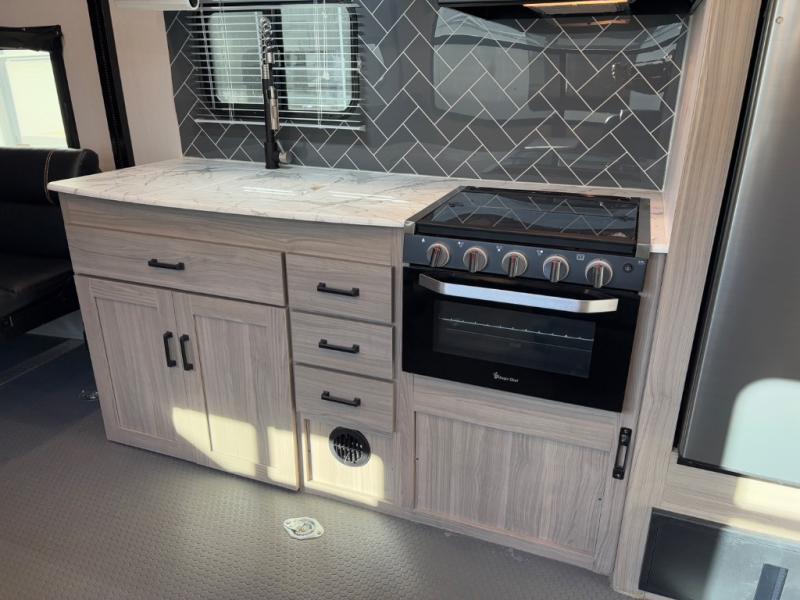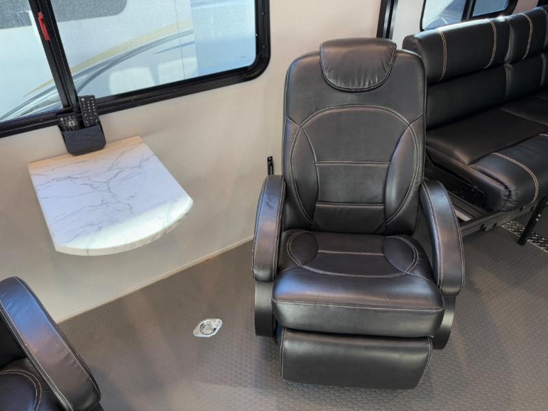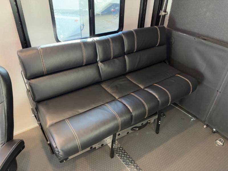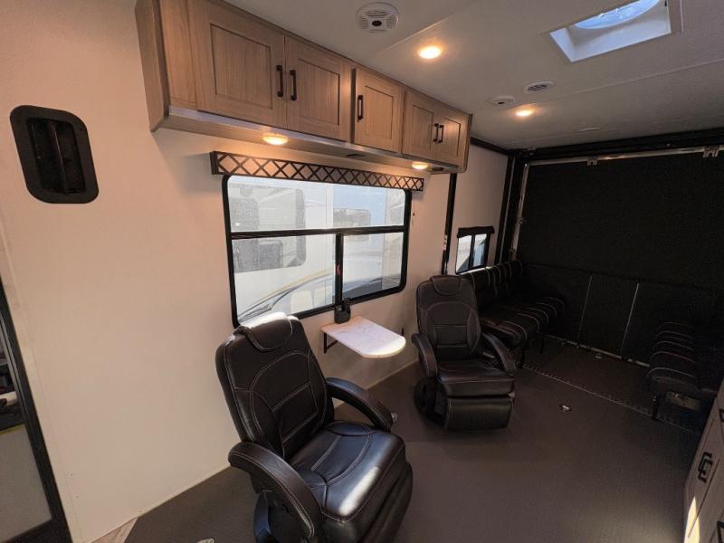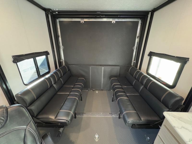This high profile toy hauler is the one you've been looking for! You can easily sleep six people since it includes two roll-over sofas and a queen bed electric lift, along with the king bed in the master. The dual entry bath is convenient for everyone, and you'll find storage space throughout for all your belongings. The kitchen includes everything you need to prepare a meal after trail riding, including a three burner cooktop, a microwave oven, plus an 8 cu. ft. refrigerator for cold drinks and perishables. You can choose additional optional equipment with this model, like the optional 5.5K Onan generator, the optional ramp door party patio kit, or the optional second 15K BTU A/C!