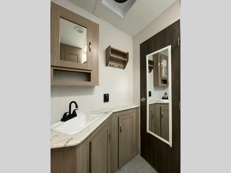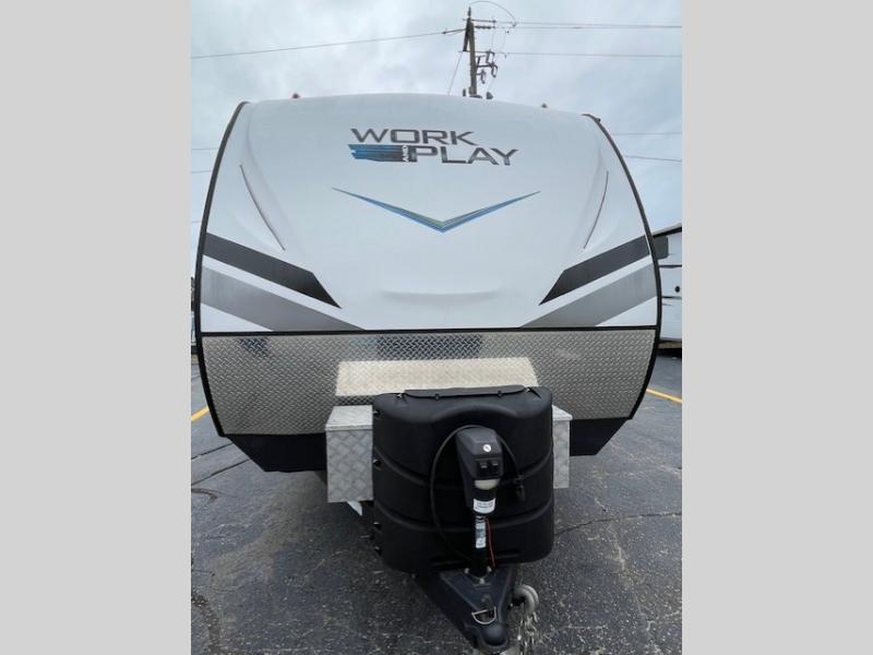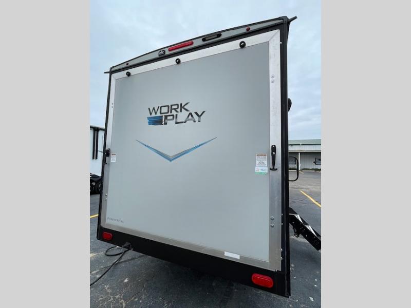 Each Work and Play toy hauler by Forest River is built tough with a mega rail powder coated chassis, a one-piece Tufflex PVC roof membrane, and a fiberglass front cap with rock guard. Towing is made hassle-free with the heavy duty Dexter axles with Nev-R-Adjust brakes and nitrogen filled tires. You will find many convenient features, such as a Winegard Air 360 and TV antenna, an outside spray port, and magnetic compartment door catches to store your riding gear. These toy haulers also include shaker style cabinets and doors, a residential bedspread, multiple USB ports for all your electronics, and many more amenities!