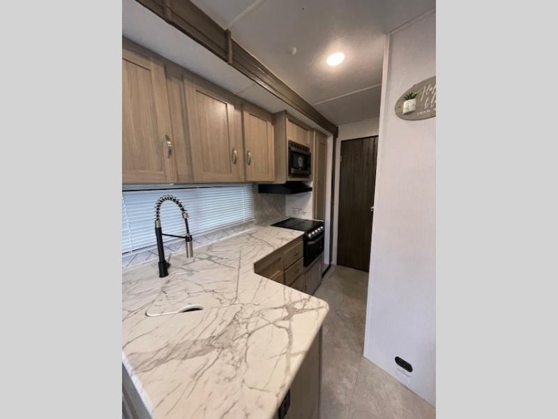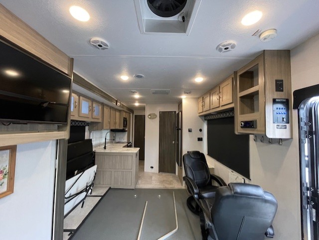 This dual entry toy hauler is perfect for your family of seven or group of friends! There is a queen bed electric lift above the dual roll-over sofas, plus a flip-up sofa and a king bed for plenty of sleeping space. You will appreciate the ramp door and a 30 gallon fuel station to keep your toys ready to go when you are. The flip-up slide floor will provide more space for the chef of the group to prepare lunch on the three burner cooktop, and there are dual Euro recliners to relax in style. This high profile model has additional optional equipment that can be added such as, an optional 5.5K Onan generator, an optional 10 cu. ft. refrigerator, and an optional ramp door party patio kit for more outdoor fun!