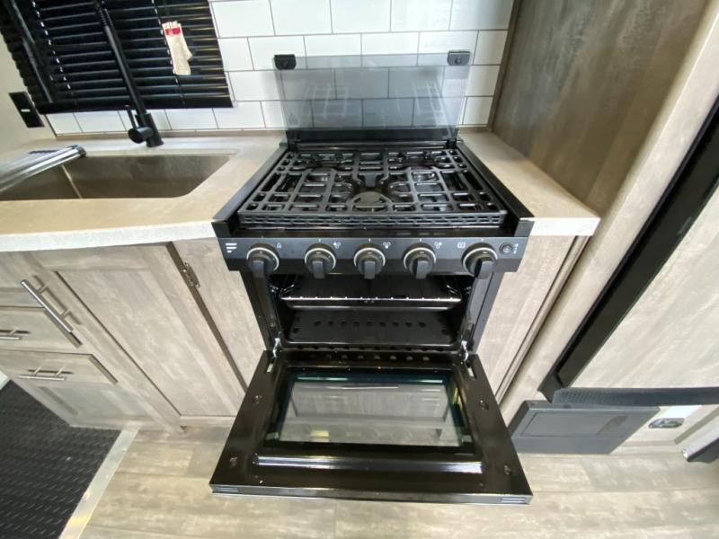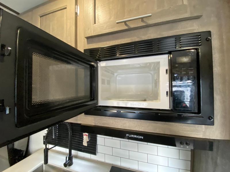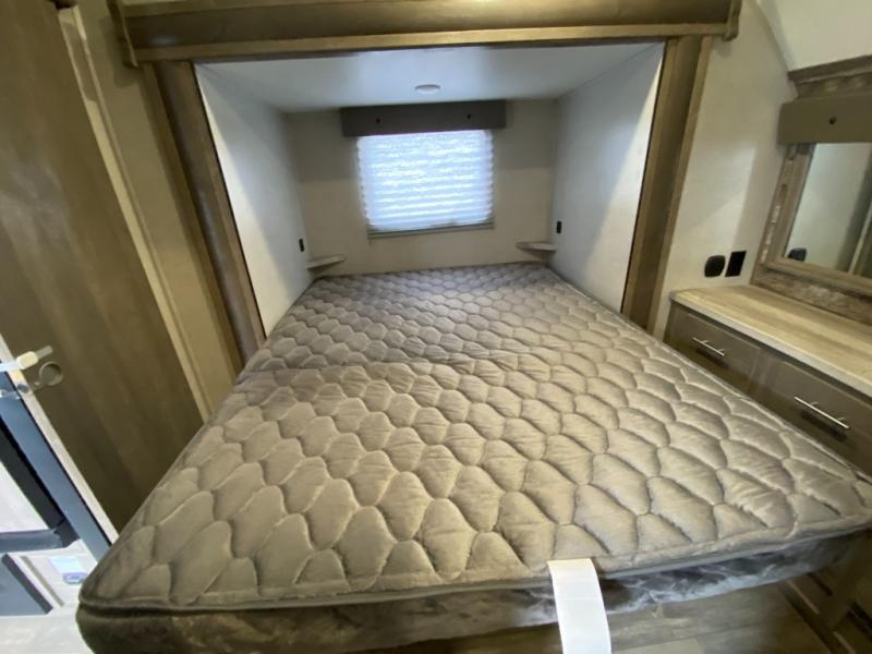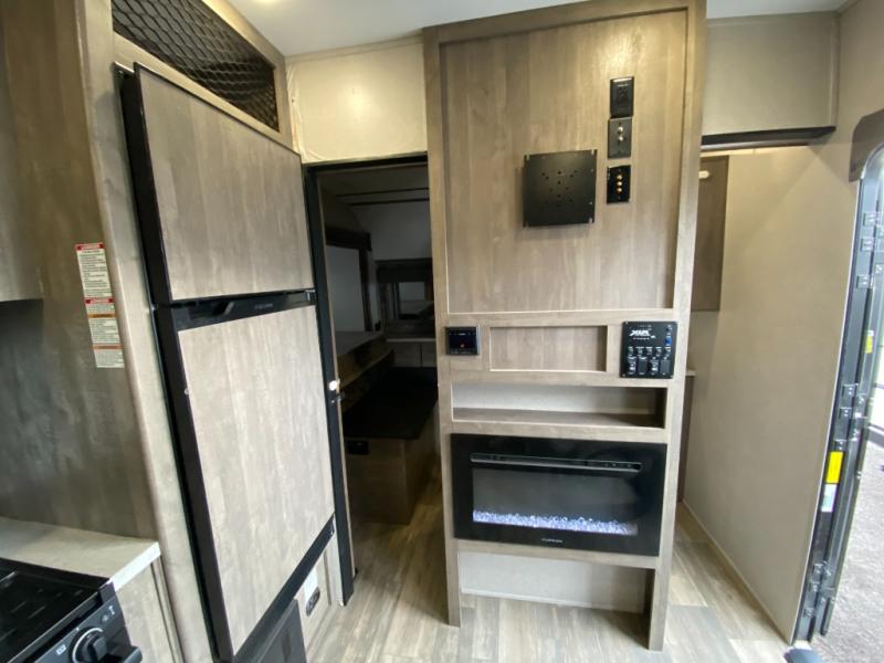 Answer the beckoning call of the outdoors with this toy hauler! You can easily store your toys in the 14' 2" garage area then set up the Sit N Sleep quick release sofas with a table in between to enjoy your meal prepared with the 17" black oven and glass cooktop. Relax in comfort in one of the two barrel chairs next to the fireplace and TV prep area or replace them for the optional Euro recliner chairs instead. Freshen up after a fun day on the trails in the front corner bathroom with the shower that has a skylight above for more headroom and natural lighting. When you're ready to head to bed, you can set up the Sleep N Store manual bed system above the sofas in the garage area and enjoy a good night's rest on the RV queen bed in the front corner private bedroom. You will be the talk of the campground with your patio deck too!