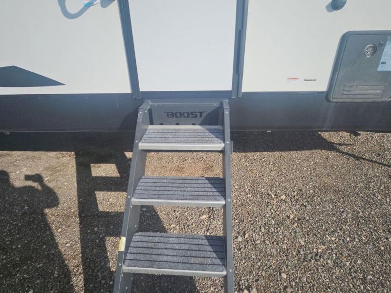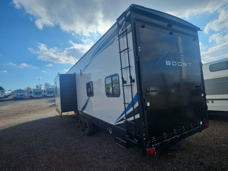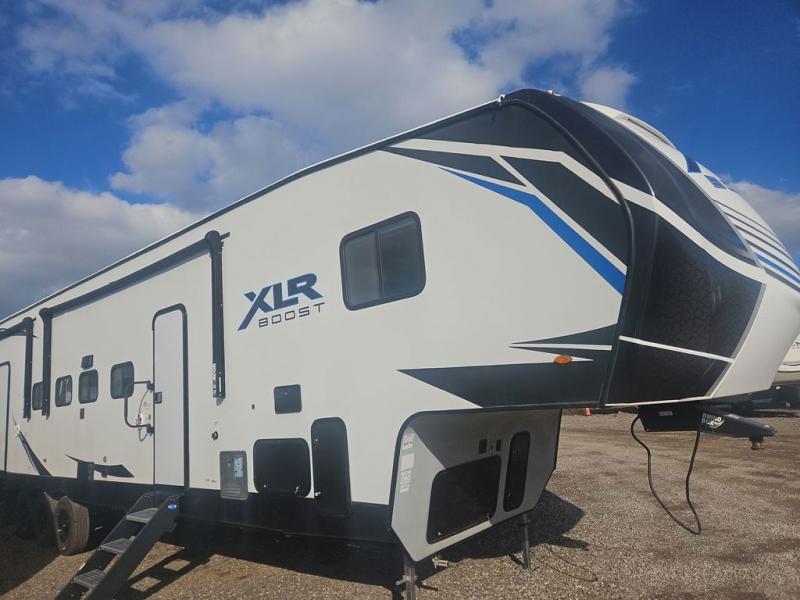 Boost into action camping with one of these Forest River XLR Boost fifth wheel toy haulers or travel trailer toy haulers! The 102" wide body not only provides ample walking around space, but also packs in all of the luxurious features to make your trips great. A seamless PVC roof system prevents water from leaking inside, and the moisture barrier floor enclosure and the oil and gas resistant residential linoleum throughout keeps your unit from falling apart. You can easily load and unload your toys with the laminated aluminum framed weather proof ramp door. Keep the dirt outside where it belongs with the outside hot/cold shower box and enjoy the perfect view of your beautiful surroundings even indoors through the large panoramic windows. Come find the model that best fits your needs today!