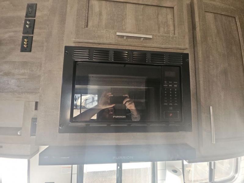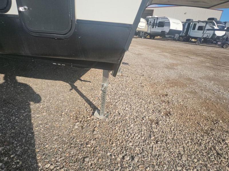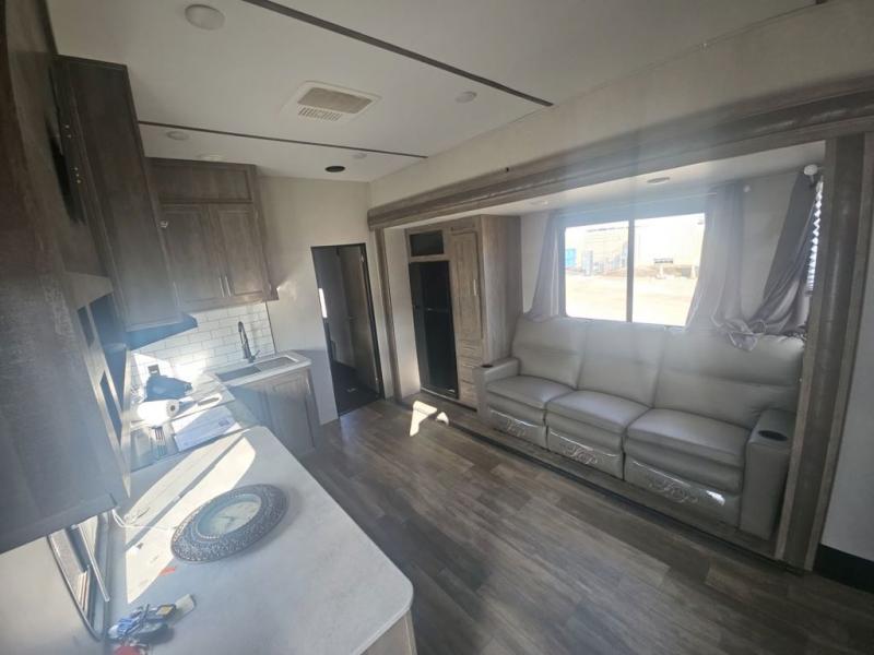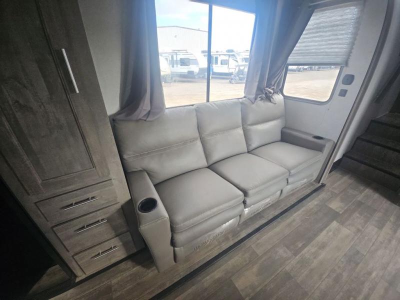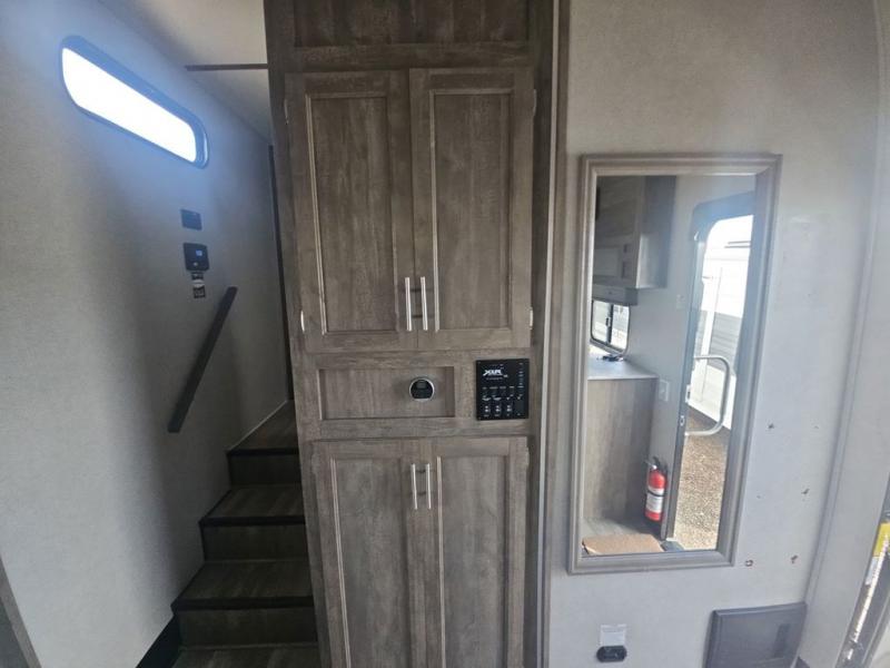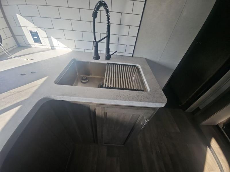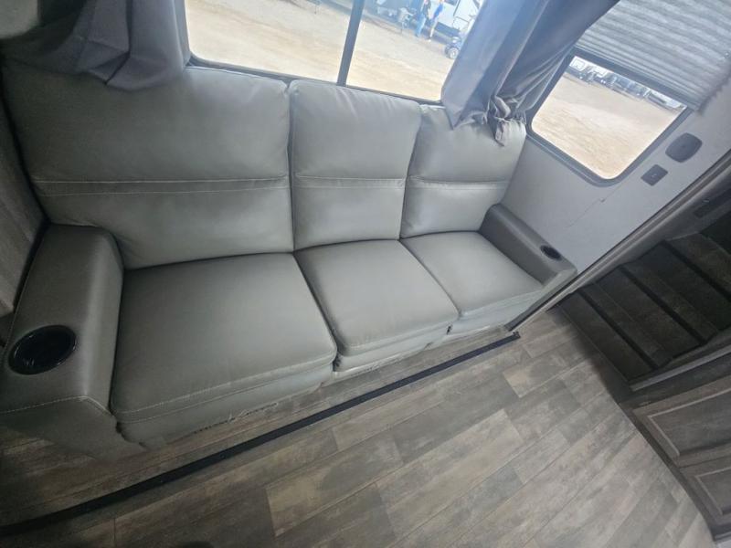 Pack your bags and load up your favorite toys into the 16' garage area of this toy hauler! Once you have arrived, you can set up the Sit N Sleep with quick release sofas that have a table in between and a Sleep N Store manual bed system above them, plus there is a half bathroom, one of the dual entry doors to the unit, and a patio deck. Get a good night's rest each night on the RV king bed in the front private bedroom and rinse the mud out of your hair after each trail ride in the dual entry bathroom with the radius shower that has a skylight above for more headroom and natural lighting. The fully equipped kitchen has everything you need to prepare your best home cooked meals, and you can relax in true comfort on the theater sofa across from the fireplace at the entertainment center with TV prep!