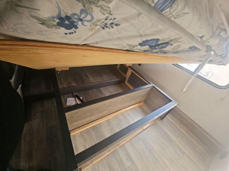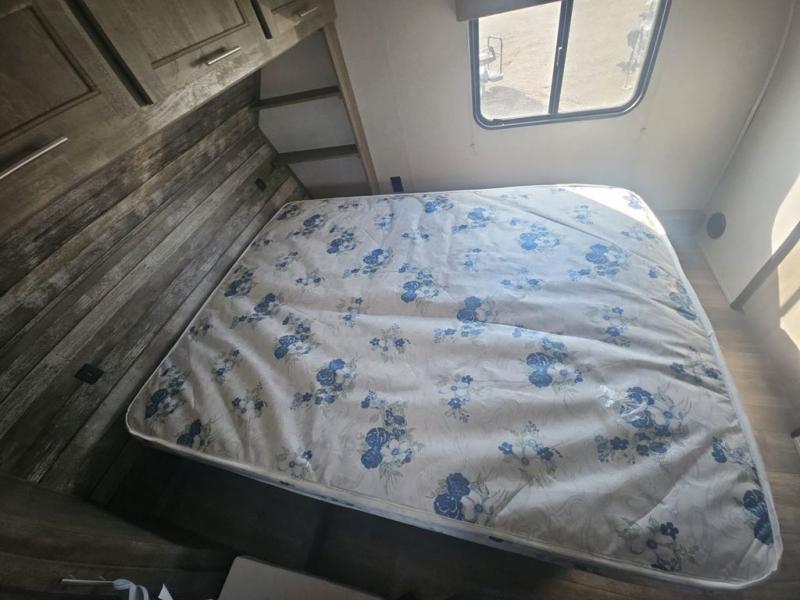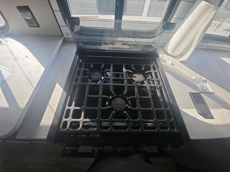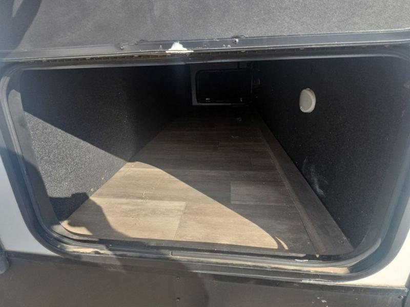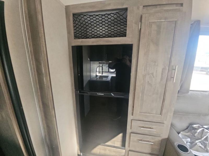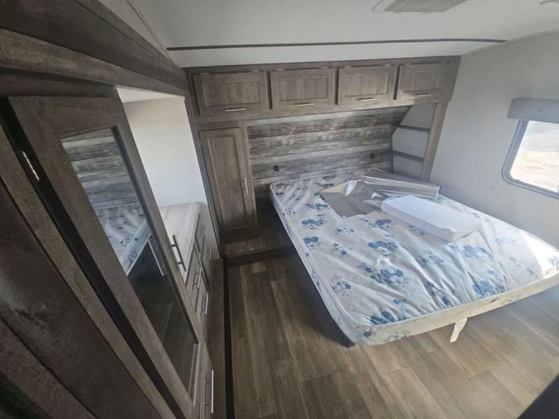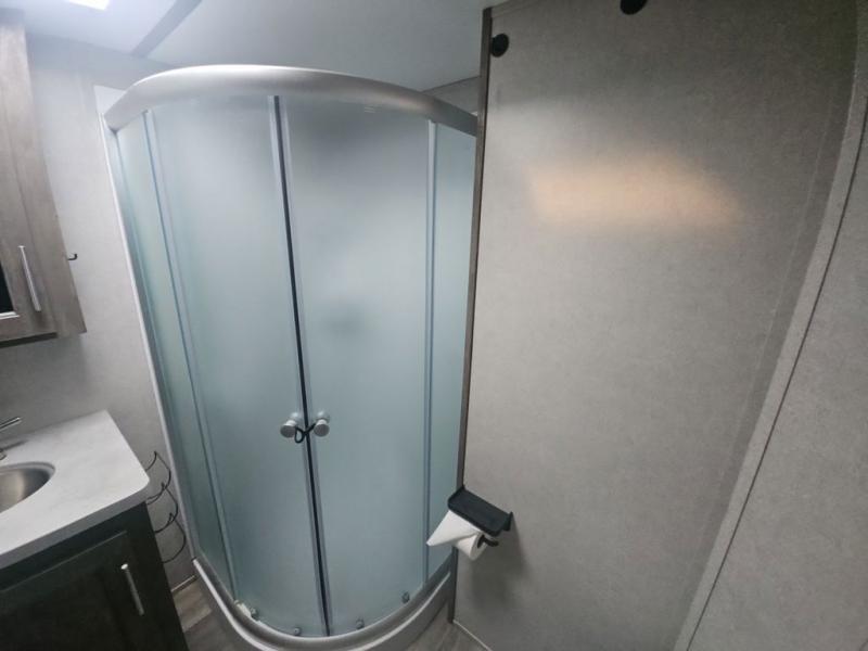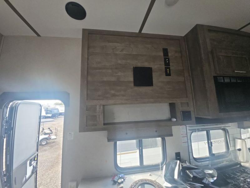 Pack your bags and load up your favorite toys into the 16' garage area of this toy hauler! Once you have arrived, you can set up the Sit N Sleep with quick release sofas that have a table in between and a Sleep N Store manual bed system above them, plus there is a half bathroom, one of the dual entry doors to the unit, and a patio deck. Get a good night's rest each night on the RV king bed in the front private bedroom and rinse the mud out of your hair after each trail ride in the dual entry bathroom with the radius shower that has a skylight above for more headroom and natural lighting. The fully equipped kitchen has everything you need to prepare your best home cooked meals, and you can relax in true comfort on the theater sofa across from the fireplace at the entertainment center with TV prep!